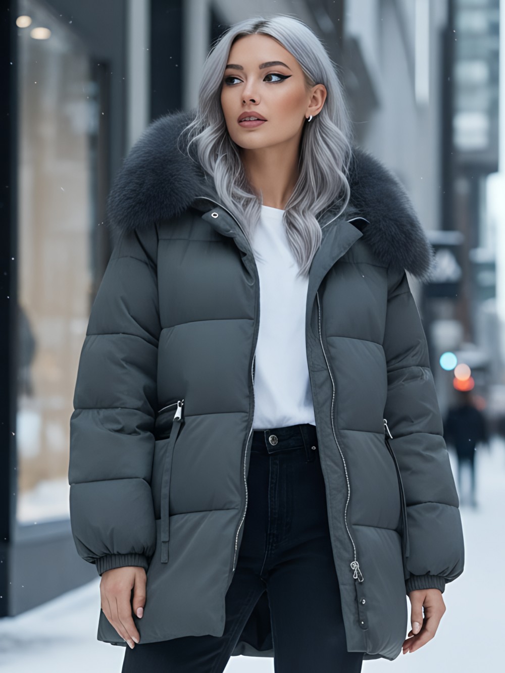Четыре трендовых оттенка 2025 года – глубокий черный, благородный коричневый, элегантный бежевый и загадочный темно-зеленый – идеально гармонируют с роскошным мехом песца. Удлиненный силуэт до колена в сочетании с прямым кроем создает безупречные пропорции, делая фигуру более стройной.