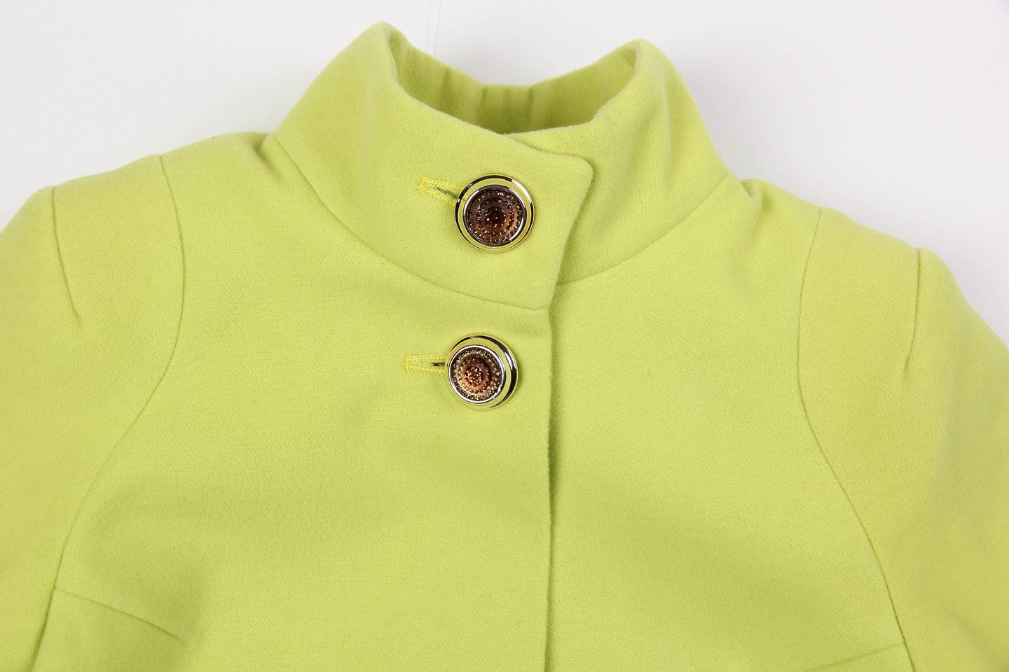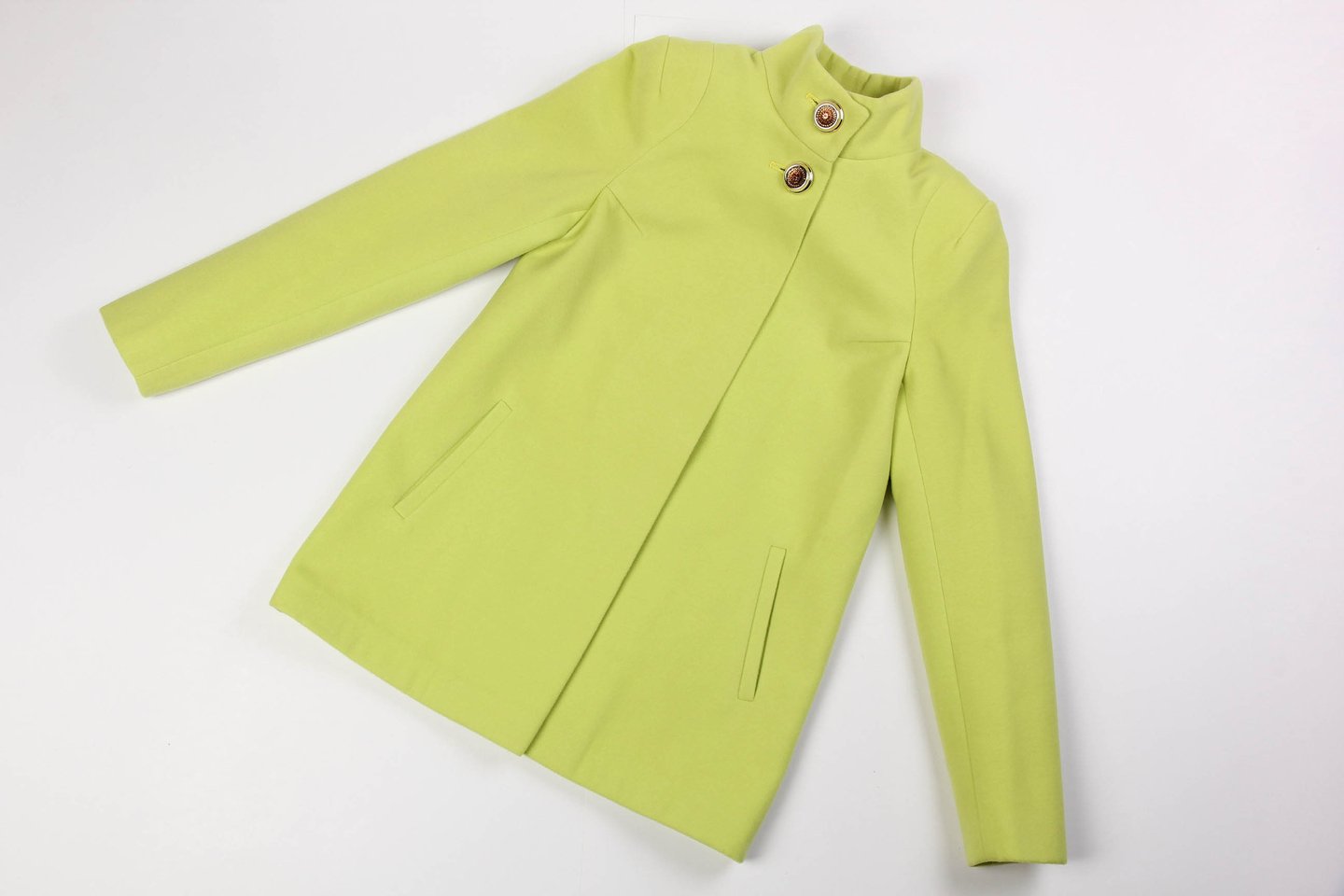 Стильная модель женственного покроя. Каждая деталь этого короткого пальто основательно продумана, чтобы обеспечить идеальный баланс между стилем и комфортом. Потайная застежка и две декоративные пуговицы. Воротник-стойка, рукав втачной с рельефной линией проймы. Карманы с листочками. Длина изделия 70 см, длина рукава 64 см. Состав драпа: 50% шерсть, 50% полиэстер. лайм