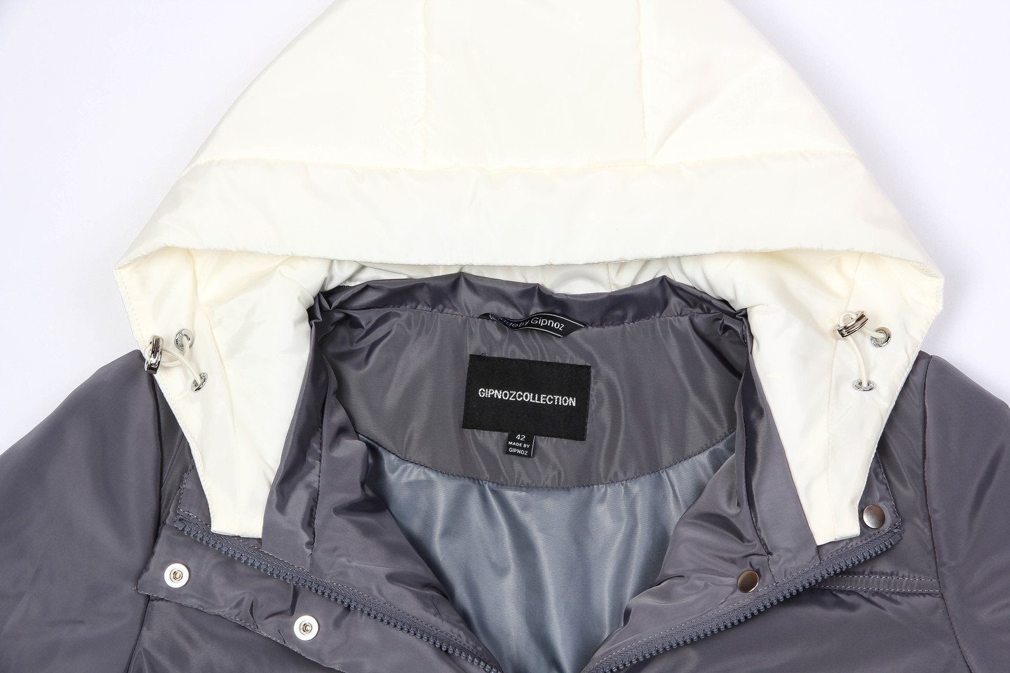 Легкое пальто из плащевой ткани — отличный вариант на межсезонье, плотная ткань защитит от ветра и дождя. Изделие прямого силуэта, объем изделия свободный. Отличительная особенность — отстегивающийся капюшон цвета слоновой кости прекрасно смотрится около лица. Накладные карманы уже несколько сезонов очень популярны — также присутствуют в нашей модели. По линии низа спинка длиннее переда. Утеплитель термофин, плотность 100. графит