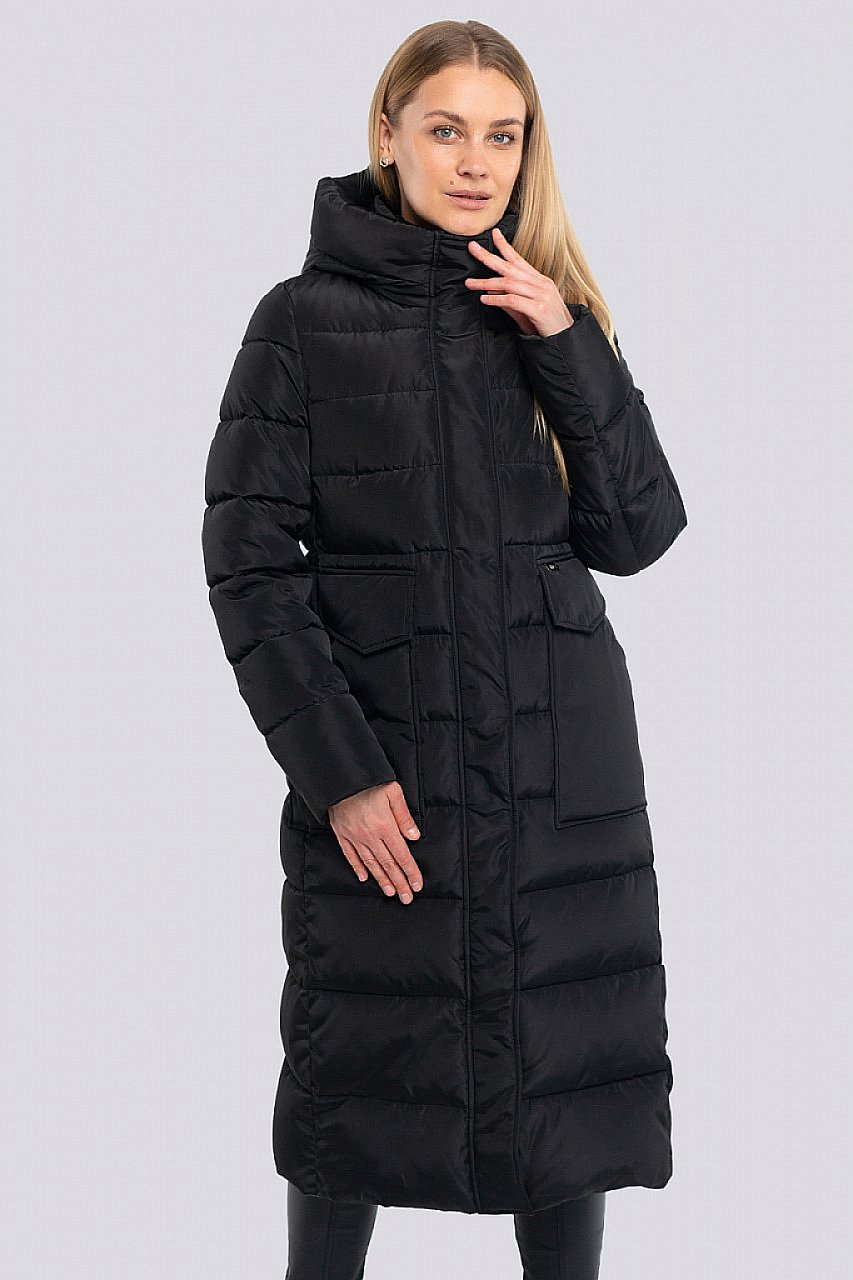 Модный и стильный женский пуховик уже давно стал неотъемлемой частью гардероба на холодное время года. Универсальный хит – женское стеганое пальто с капюшоном. Пальто прямого силуэта с прямой стежкой. Центральная застежка на молнию, закрыта планкой на кнопках. На переде - накладные карманы с клапанами, на кнопках. Внутри, по низу рукава трикотажные манжеты. В качестве утеплителя мягкий и практичный синтепух - синтетический пух. На подкладке дополнительный слой утеплителя - термофин, плотность 100.Температурный режим до -30. черный