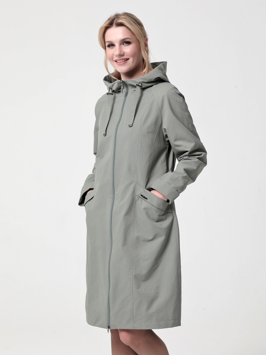 Укороченный плащ  прямого силуэта с рукавами покроя реглан и застежкой на двухзамковую молнию, позволяющую регулировать ширину шага, подходит для девушек и женщин разного возраста. Воротник - стойка, переходящая в капюшон. Вместительные карманы удобно расположены между рельефных швов. Есть внутренний кармашек на молнии.  Силуэт плаща можно менять с помощью затяжек по линии талии (со стороны спинки) и по линии низа. Подкладка в изделии выполнена из ткани в мелкую полоску. Этот весенний плащ из хлопкосодержащей ткани с водоотталкивающей пропиткой хорошо садится на любую фигуру. Добавьте яркости в аксессуарах, и Ваша весна будет комфортной и стильной!