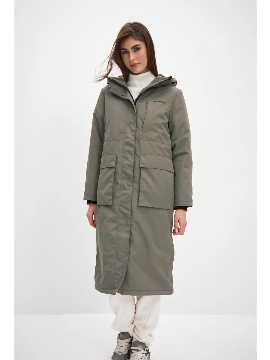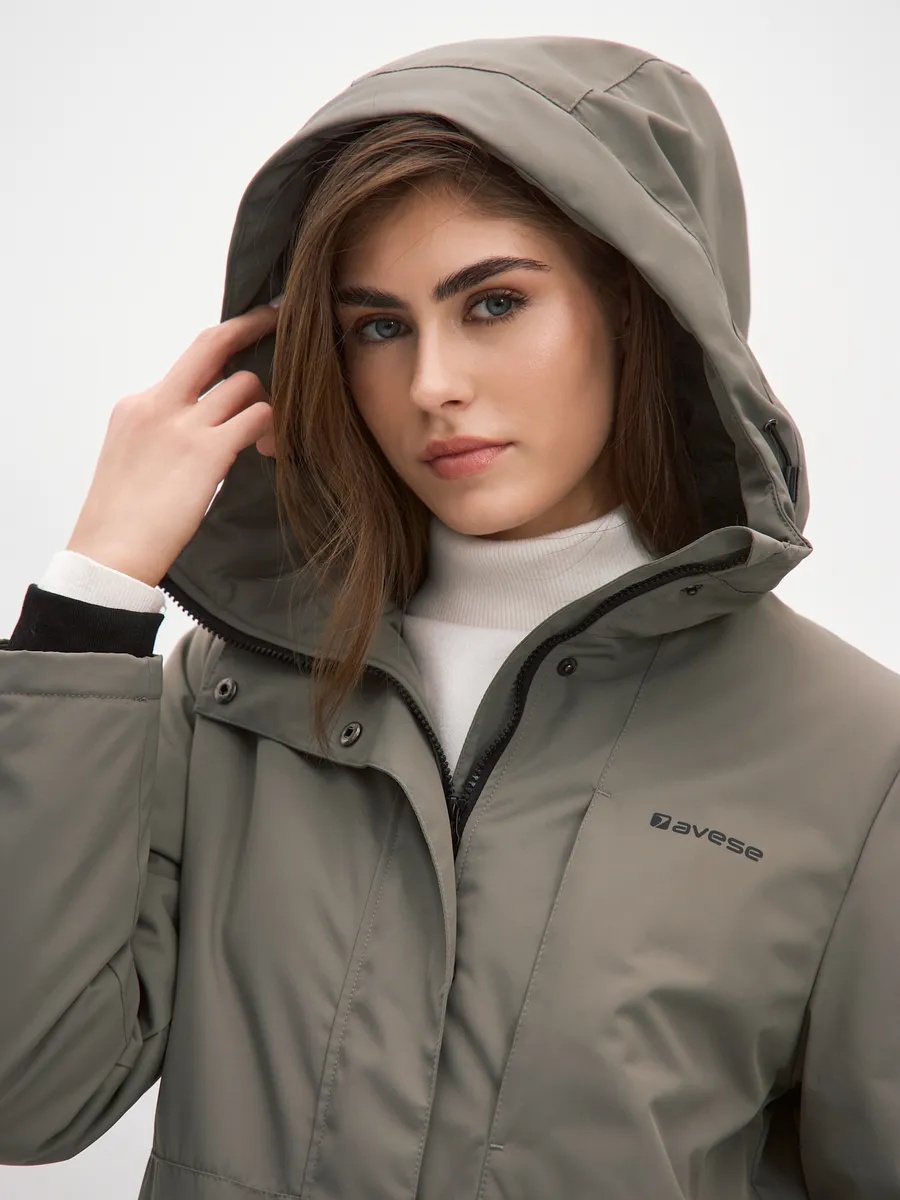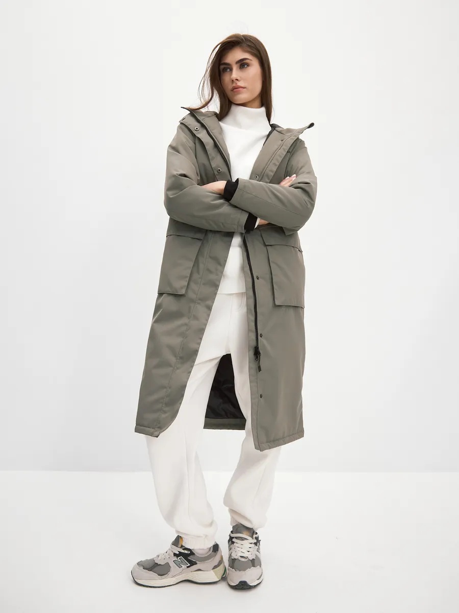 Демисезонный плащ для женщин, на подкладке с утеплителем, в боковых швах шлицы с потайными кнопками, с втачным капюшоном и кулисой на талии по спинке. На полочках два накладных кармана- портфеля с клапанами на потайных кнопках и один нагрудный карман. Центральная застёжка на молнию, закрытую центральной планкой на потайных кнопках. Подкладка на утеплителе с накладным карманом на молнии. Рукава с внутренним манжетом из трикотажа. Рассчитана на температуру от -5 до +10.