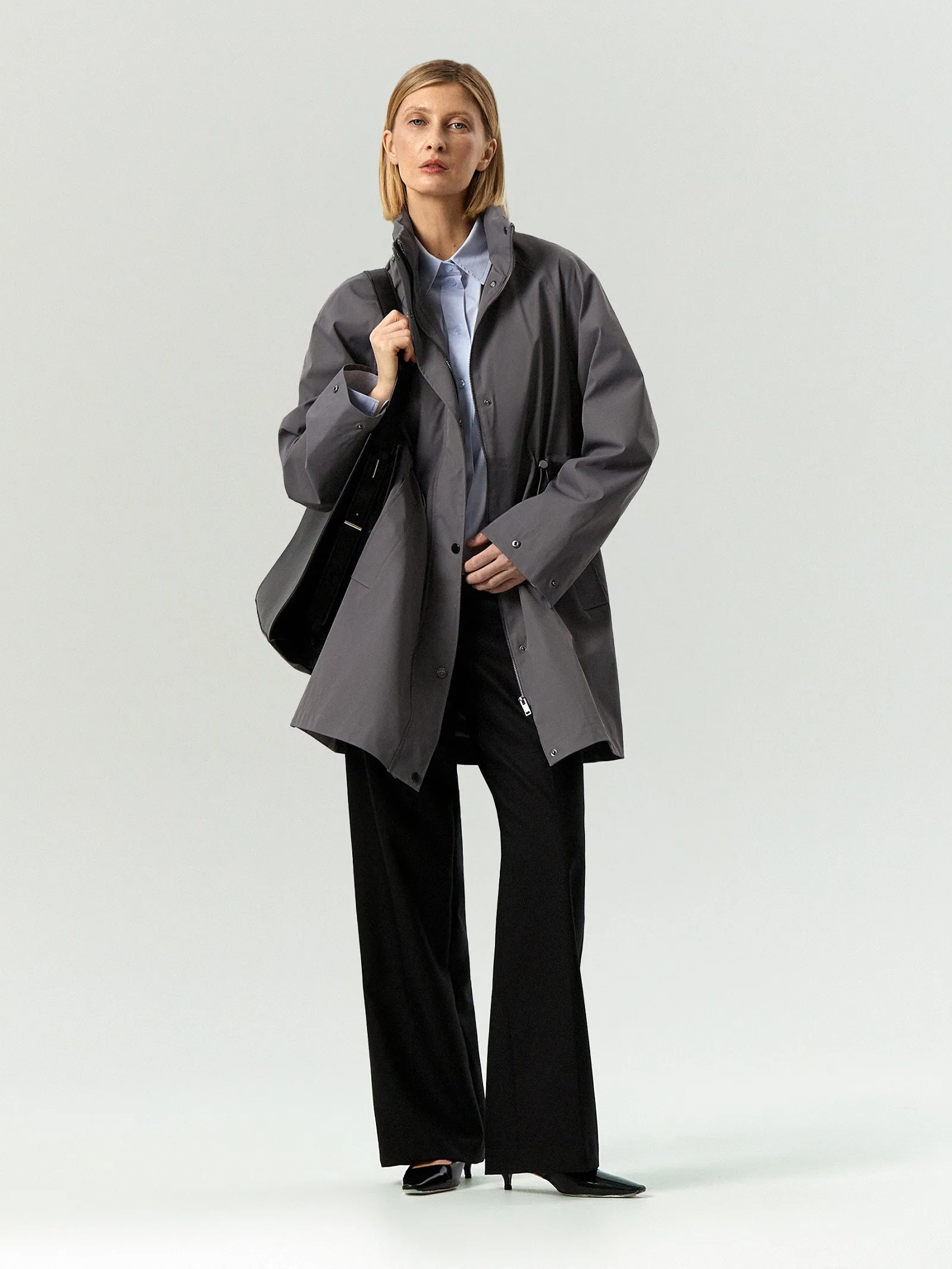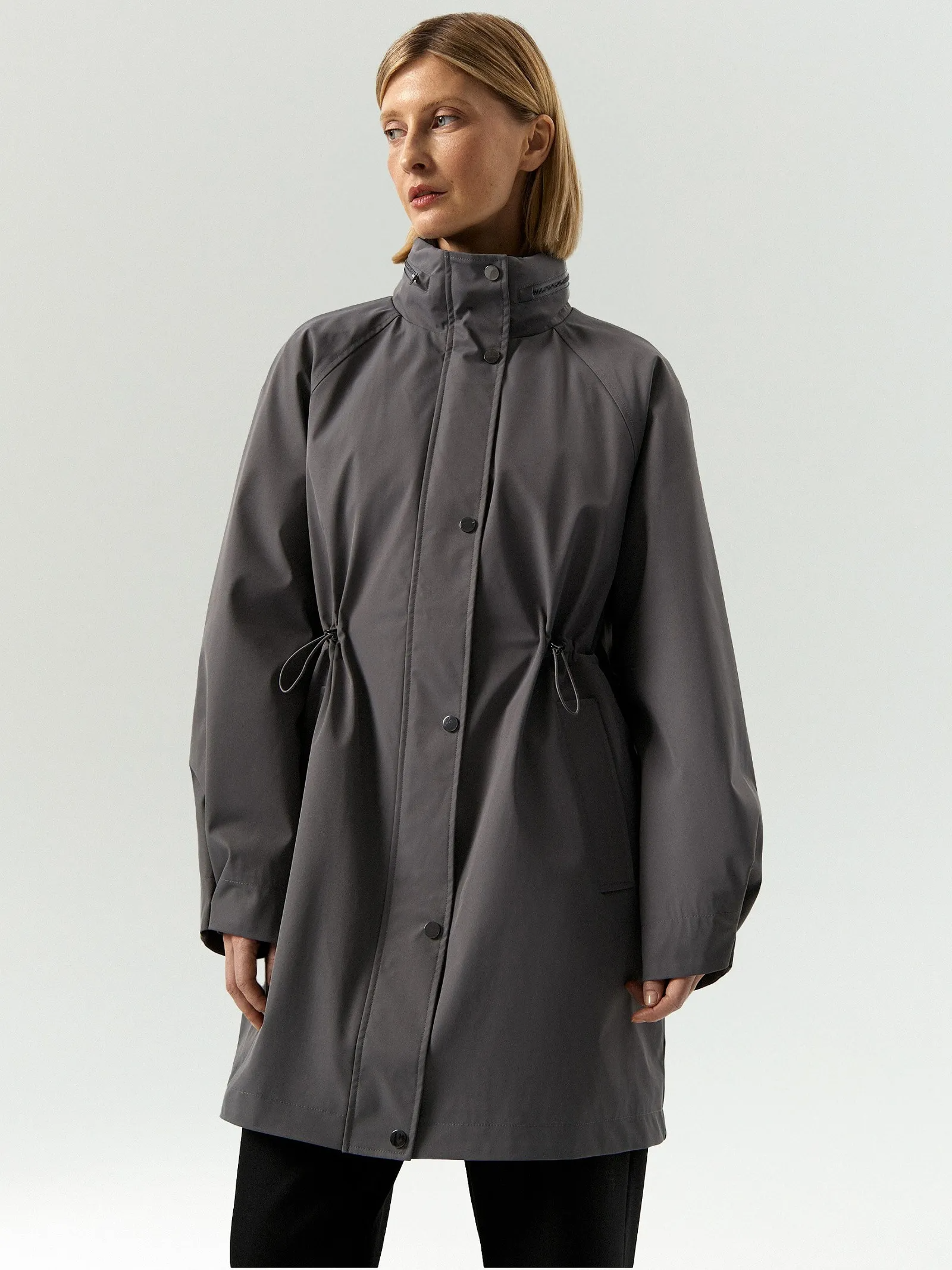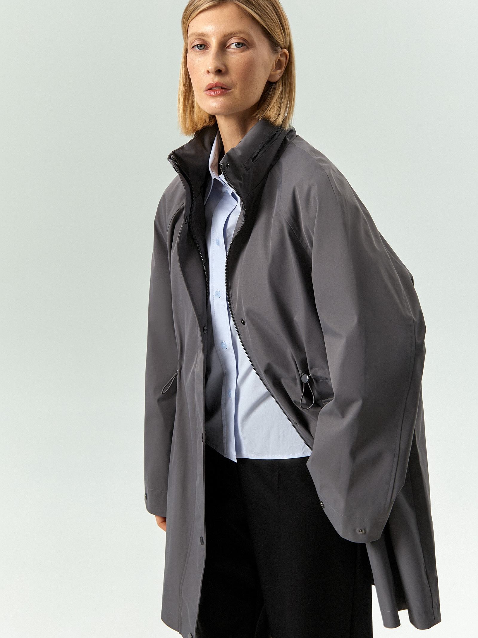 Стильная модель в цвете тауп для образов на прохладную погоду. В воротнике скрыт капюшон на случай внезапного дождя или резкого ветра. Модель дополнена кулиской, что позволяет менять силуэт с прямого на приталенный и регулировать степень свободы. Плащ застёгивается на молнию и кнопки.