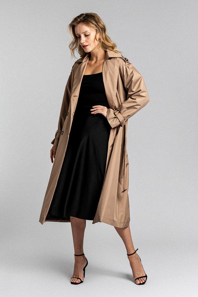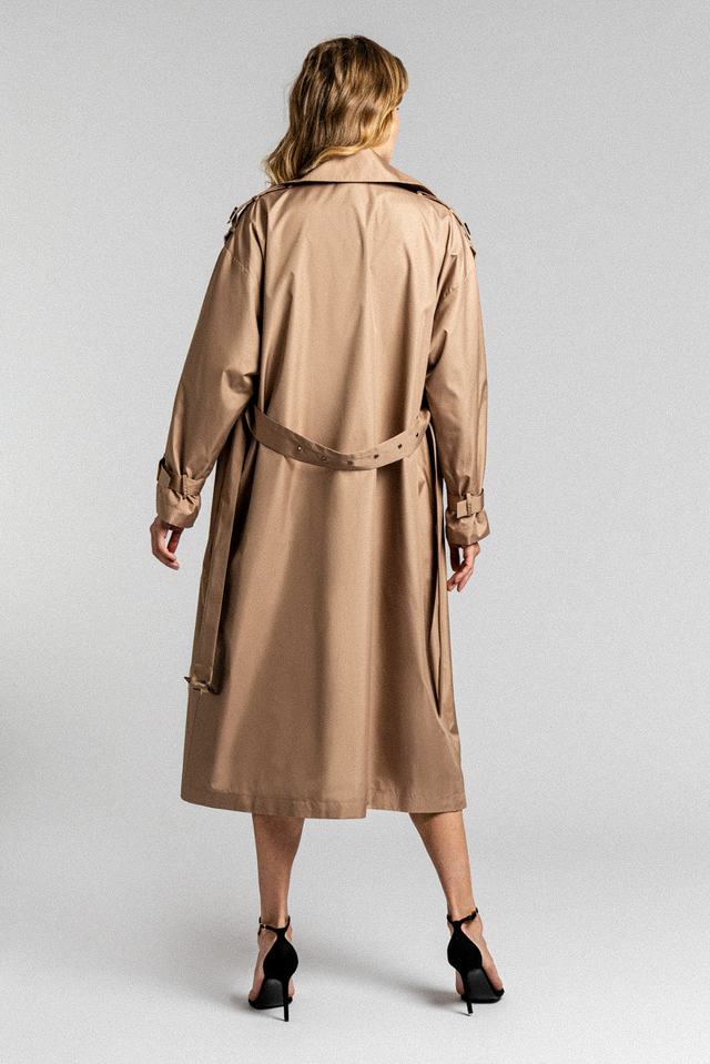 Удлиненный демисезонный плащ со спущенным рукавом, погонами и патами на рукавах. В данной модели есть шлевки, что минимизирует возможность потери пояса.