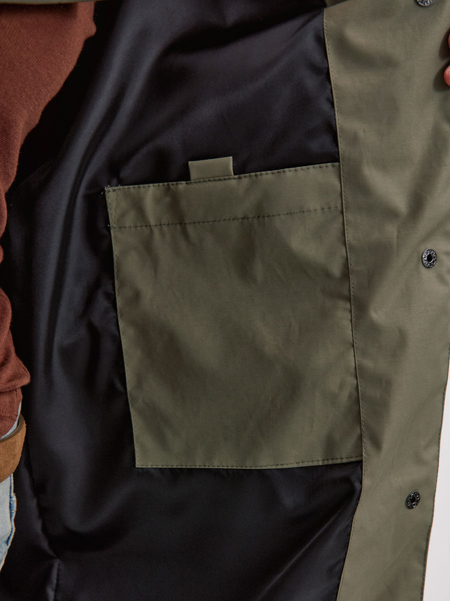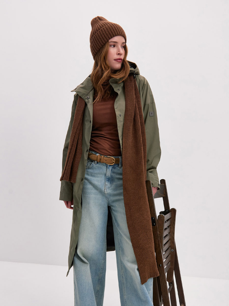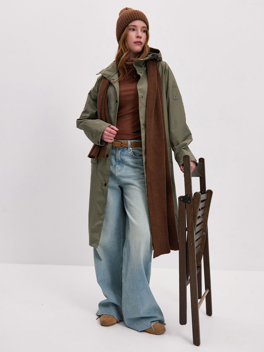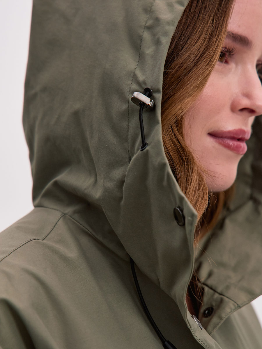 Женский плащ с капюшоном из хлопковой ткани. Модель OVERSIZE. Центральная застёжка на кнопках. 2 прорезных кармана с клапанами на магнитных кнопках. Втачной капюшон с кулисой с резиновым шнурком. Внутренний карман с липучкой. Рассчитана на температуру от +10 до +15.