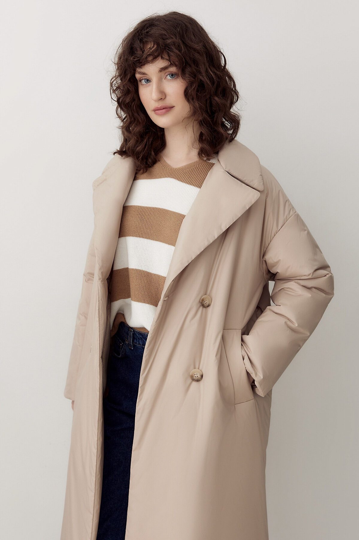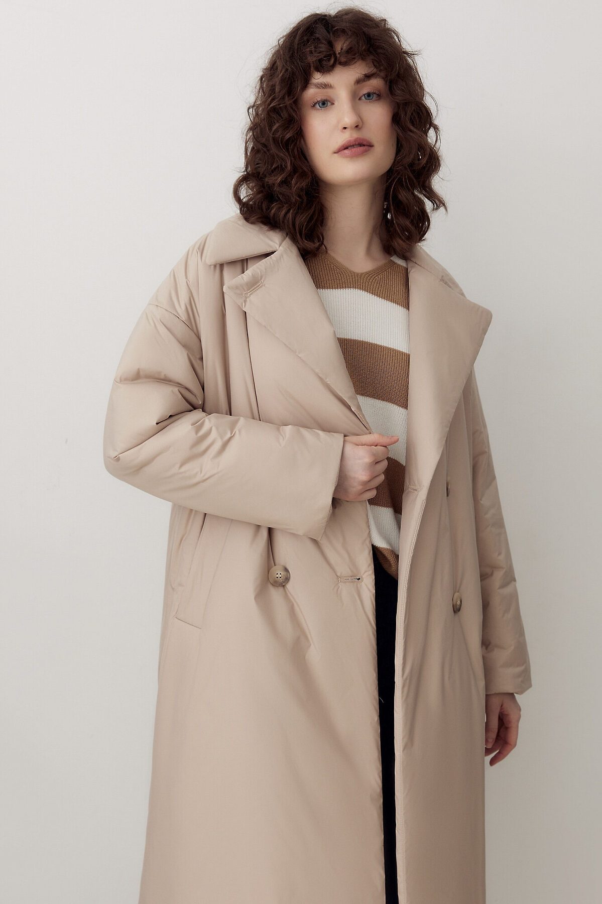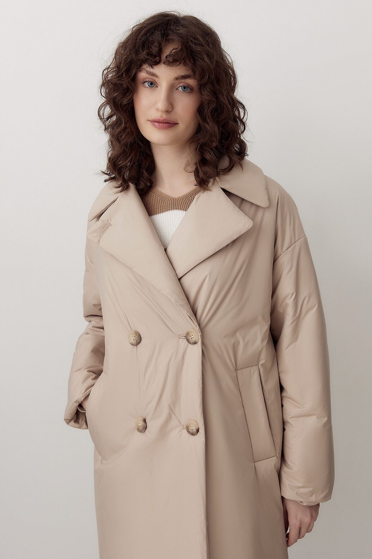 Утепленное пальто прямого силуэта из плащевой ткани модного оттенка "миндальное молоко". Пальто имеет классический английский воротник и комфортный рубашечный рукав с отворотами по низу. По бокам располагаются глубокие карманы с листочками. Длина изделия ниже колена. Застегивается на два ряда крупных роговых пуговиц. Пальто дополняет пояс из основной ткани. А для дополнительной защиты от ветра и холода пальто выполнено с использованием высокотехнологичной мембраны RaftPro и современного легкого утеплителя. Произведено в Санкт-Петербурге.