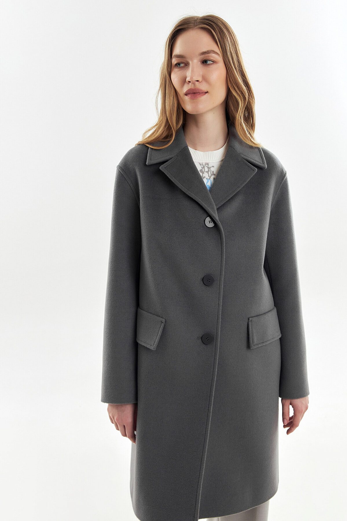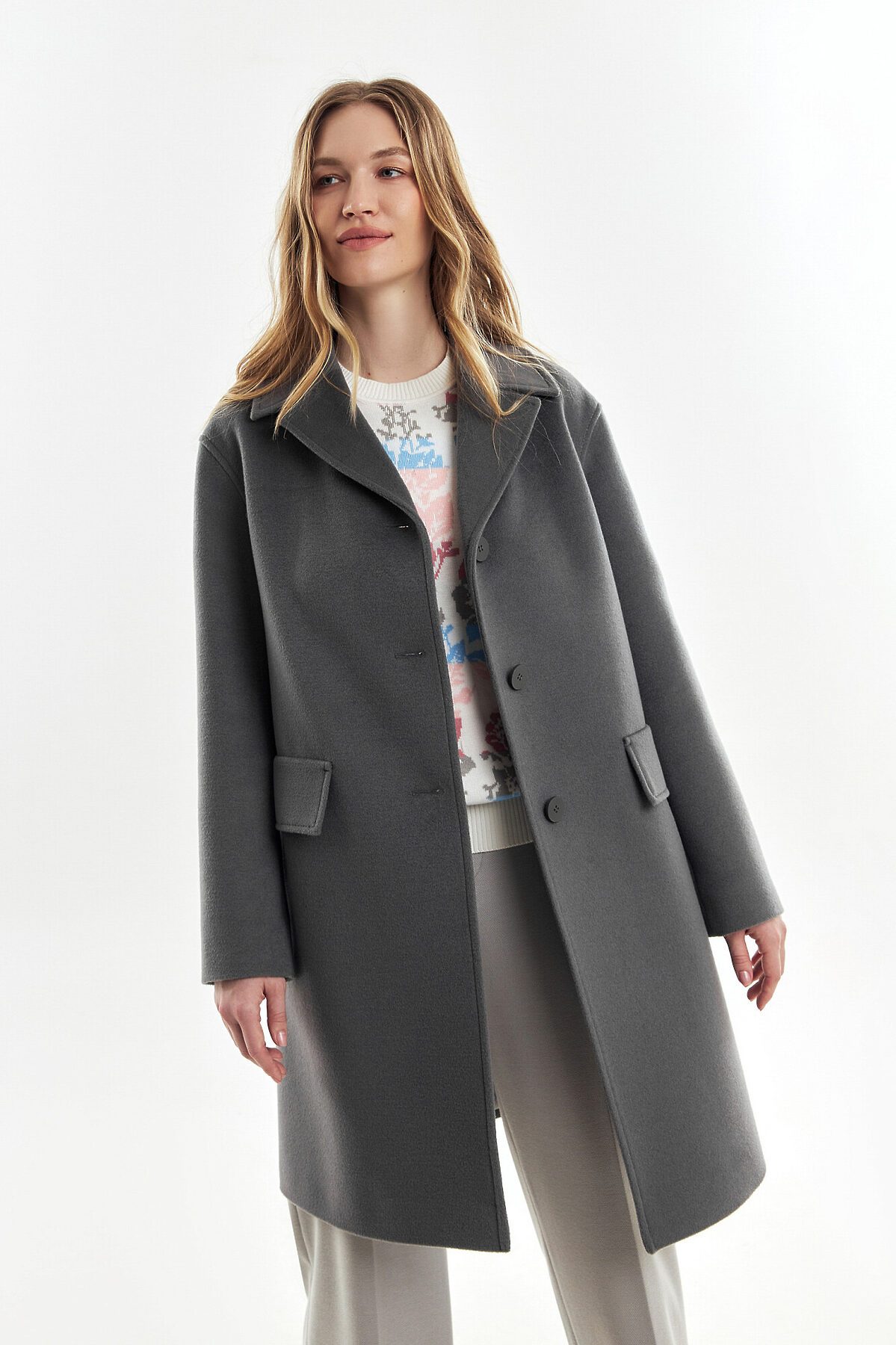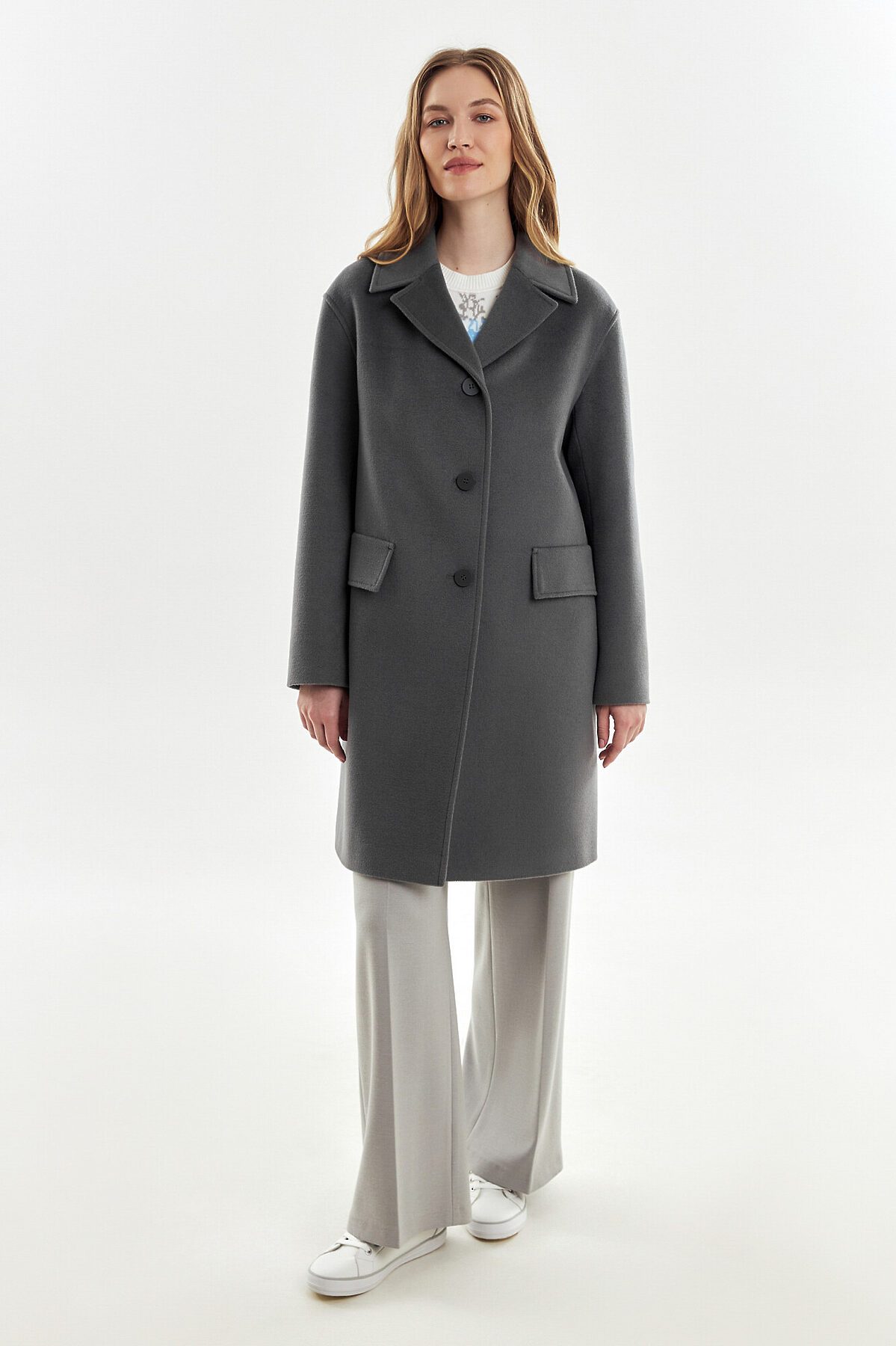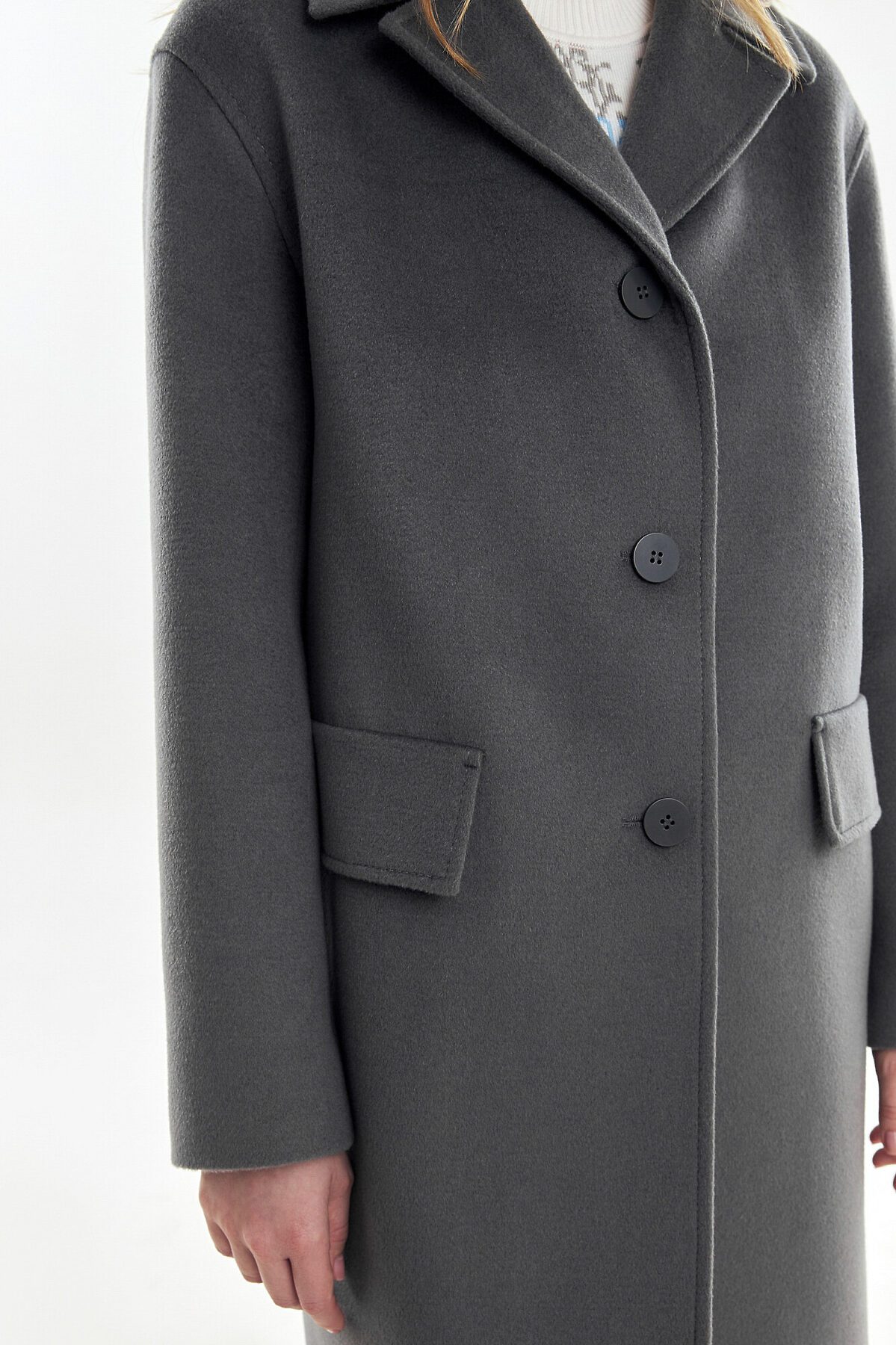 Однобортное пальто длиной до колена из премиальной шерстяной ворсовой ткани классического темно-серого оттенка. Пальто расширенного силуэта "трапеция" со свободным рубашечным рукавом и аккуратным английский воротником. По низу рукава застежка на ряд пуговиц. Спереди располагаются глубокие прорезные карманы с клапанами. Застегивается изделие на ряд крупных стильных глянцевых пуговиц в цвет ткани. А для дополнительной защиты от непогоды изделие выполнено с использованием высокотехнологичной мембраны RaftPro. Произведено в Санкт-Петербурге.