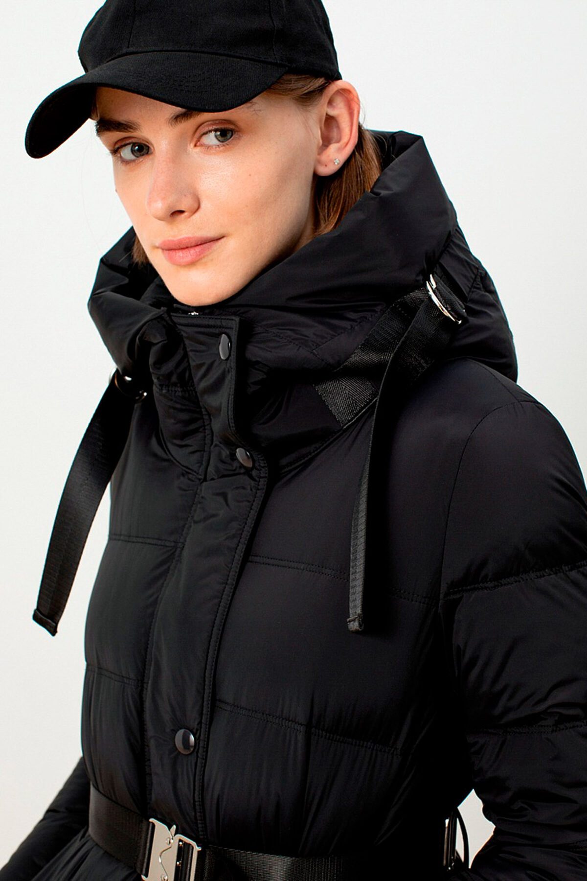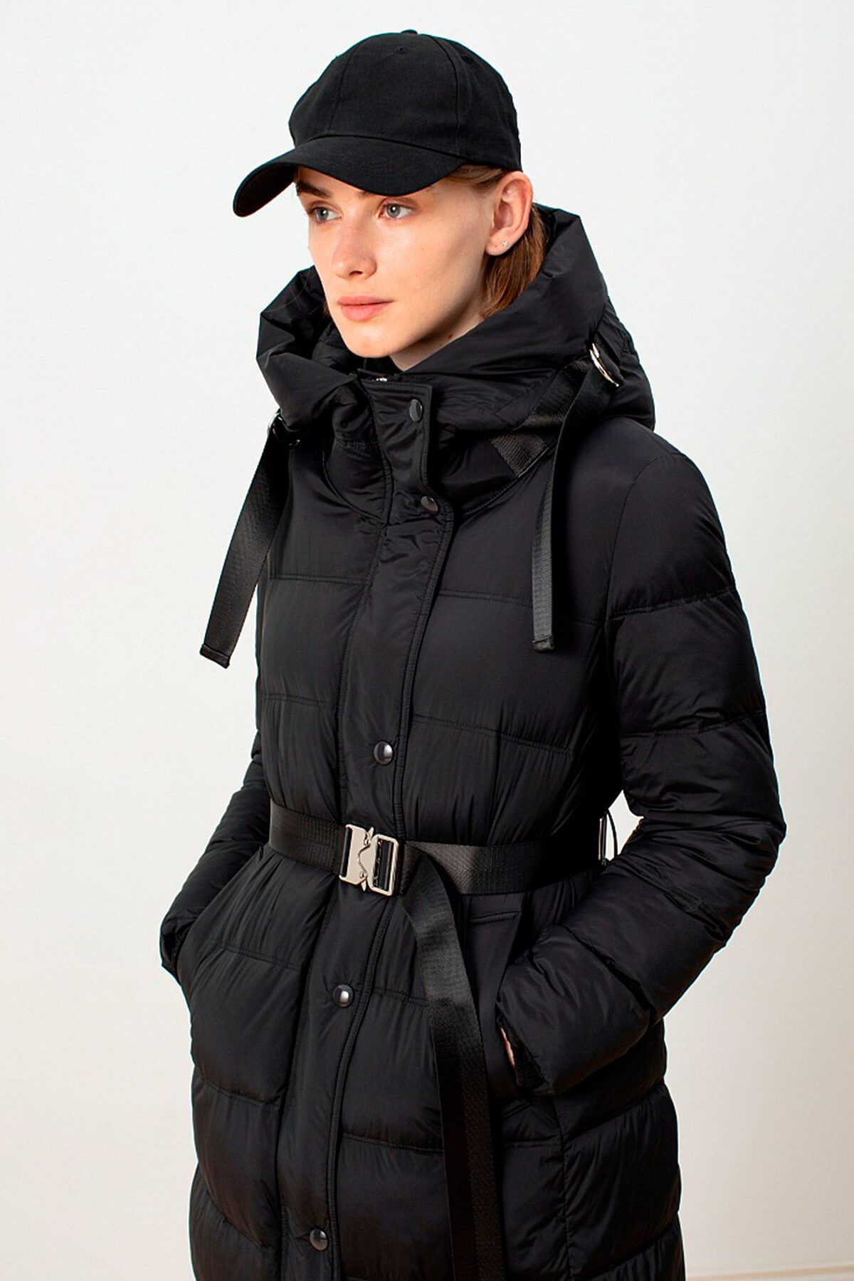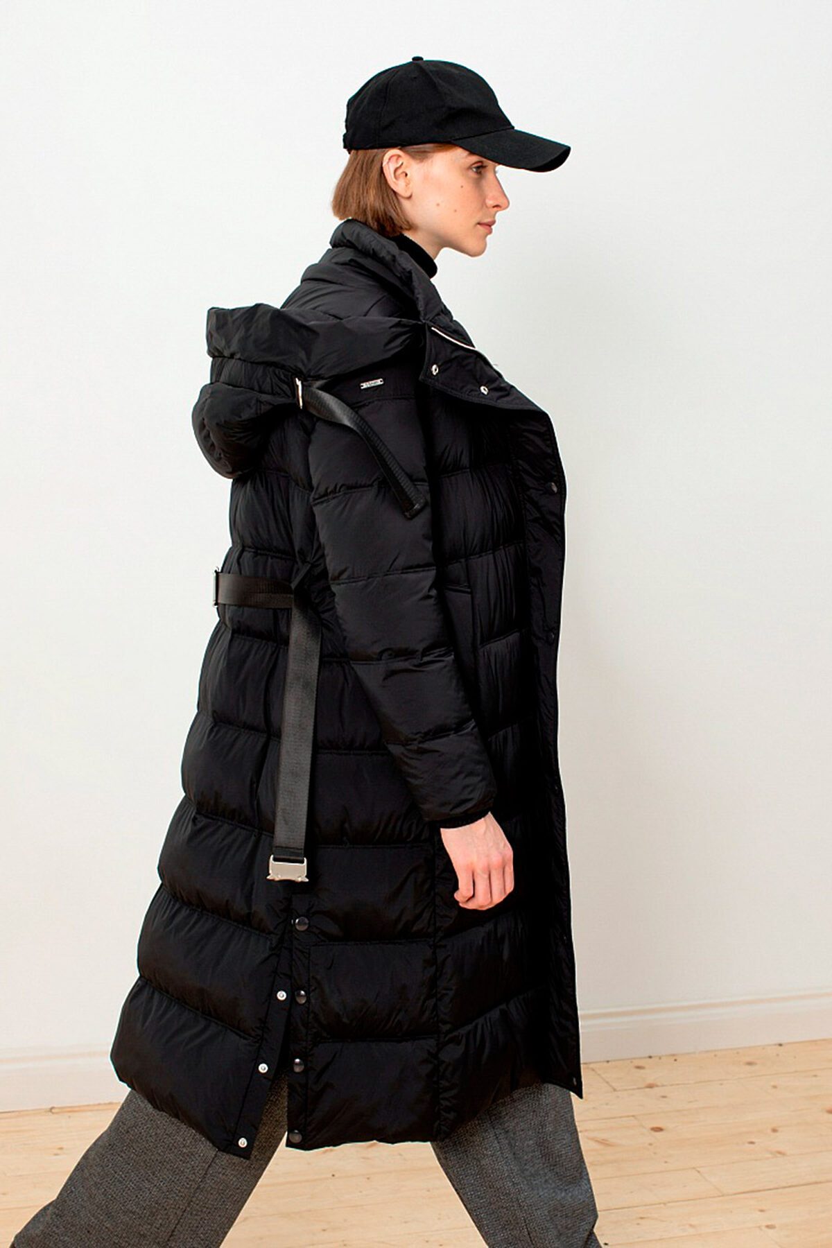 Пальто-пуховик силуэта "умеренная трапеция" из плащевой ткани черного цвета. Крупные горизонтальные отстрочки. Втачной рукав, воротник-стойка и капюшон, карманы-листочки, центральная застёжка на молнию и пришивные кнопки. Пояс с металлической пряжкой. Боковые разрезы с металлическими кнопками. Утеплитель DuPont Sorona. Длина ниже колена.