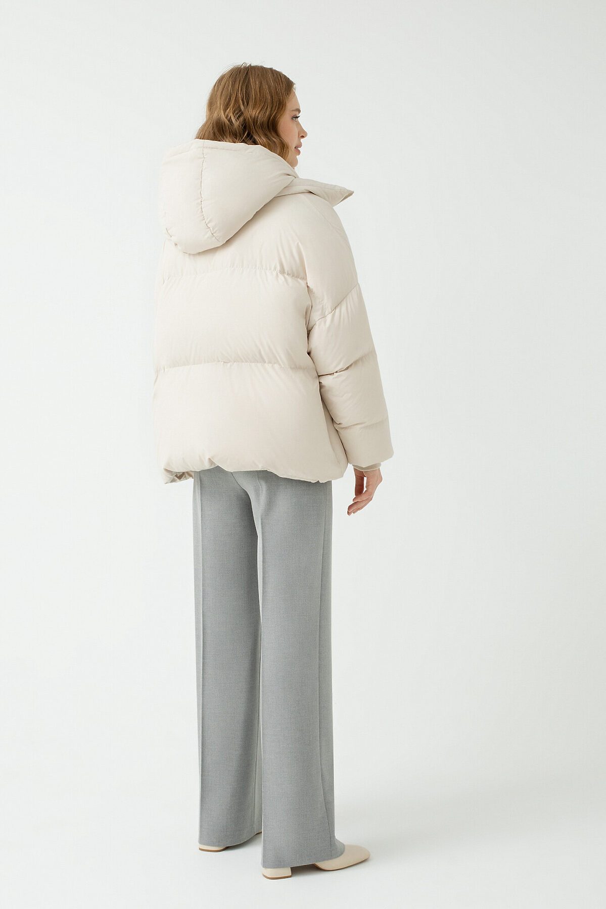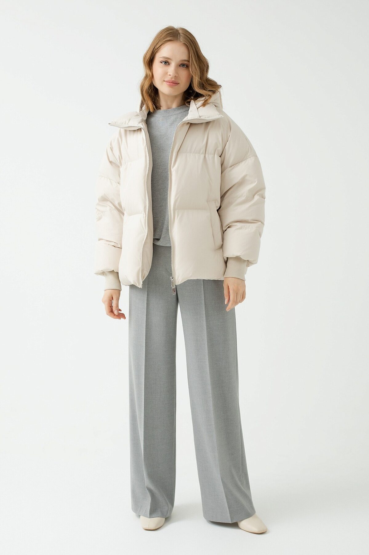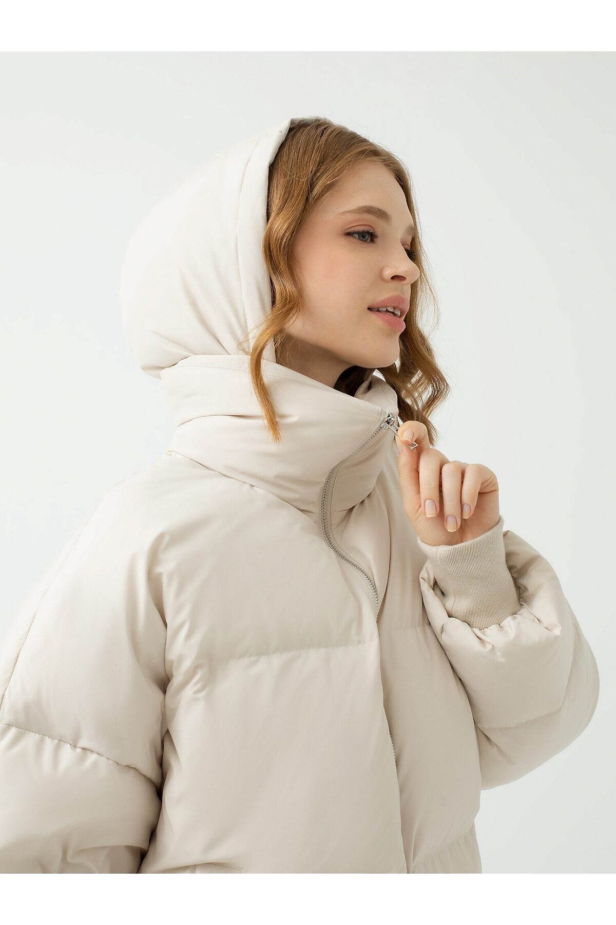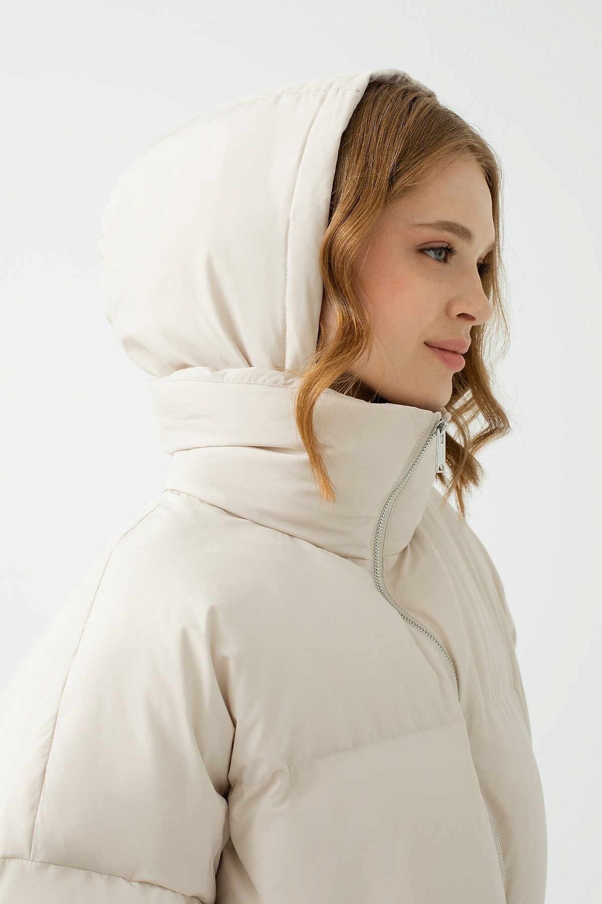 Укороченная легкая зимняя куртка из плащевой ткани молочного цвета. Воротник-стойка и съемный капюшон позволяют надежнее сохранить тепло. По низу рукава трикотажная резинка в цвет основной ткани. Карман с листочками и застежкой на кнопку заботится о содержимом карманов. В качестве утеплителя 90% пух и 10% перо. Застегивается куртка на молнию.