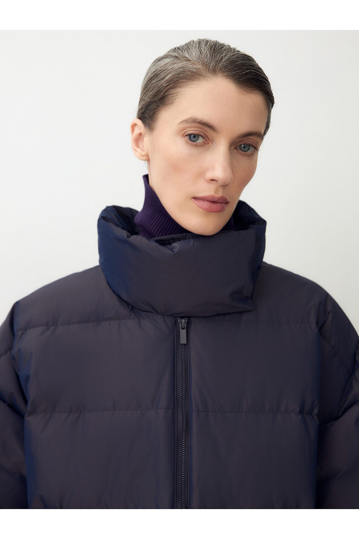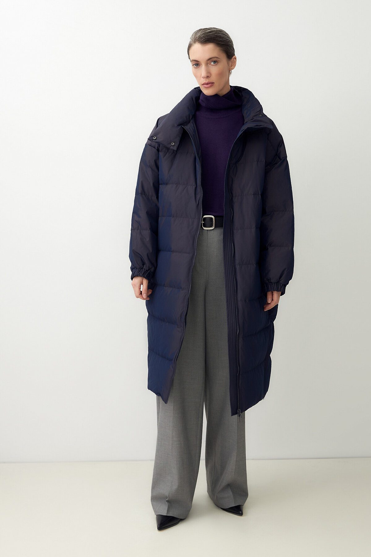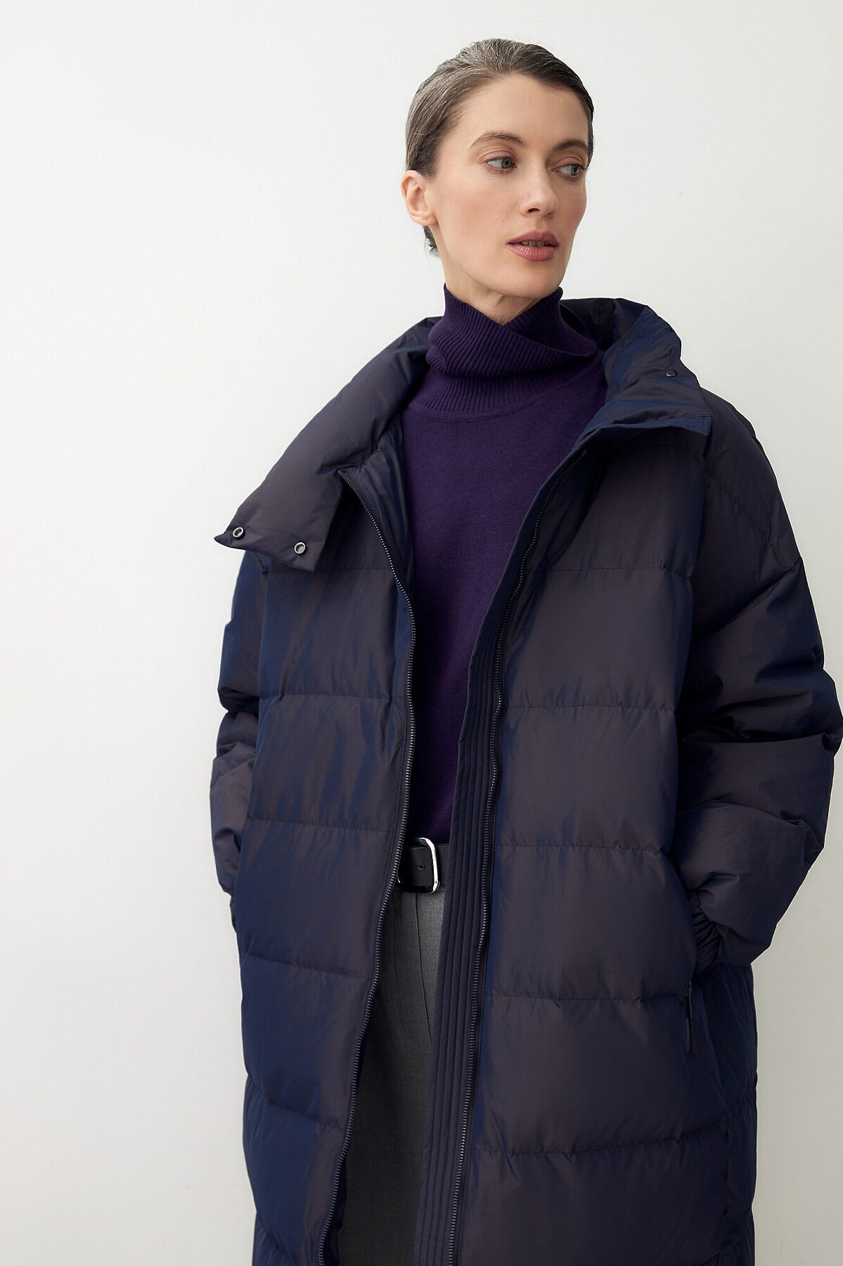 Объемное ультрамодное пальто силуэта "удлиненный кокон" из плащевой ткани модного синего цвета с эффектом шанжан с объемным натуральным утеплителем пух/перо. Пальто имеет минимум деталей и уникальную конструкцию. Высокый воротник-стойка с застежкой на кнопки создает необходимое зимой утепление. Специальные рельефные швы заужают изделие к низу и создают лаконичный силуэт. Для удобства во время ходьбы в рельефах пальто располагаются две потайные молнии, расстегнув которые получаются два стильных высоких разреза. Рукав со спущенным плечом не стесняет движений, по низу рукава располагается пата на резинке, которая регулирует необходимое прилегание для надежной защиты от ветра. По бокам располагаются два глубоких кармана, застегивющихся на водонепроницаемую молнию. Внутреняя часть кармана выполнена из теплого и уютного флиса. Длина пальто ниже колена, застежка изделия на молнию. А для наилучшей защиты от непогоды пальто выполнено с использованием высокотехнологичной мембраны RaftPro.