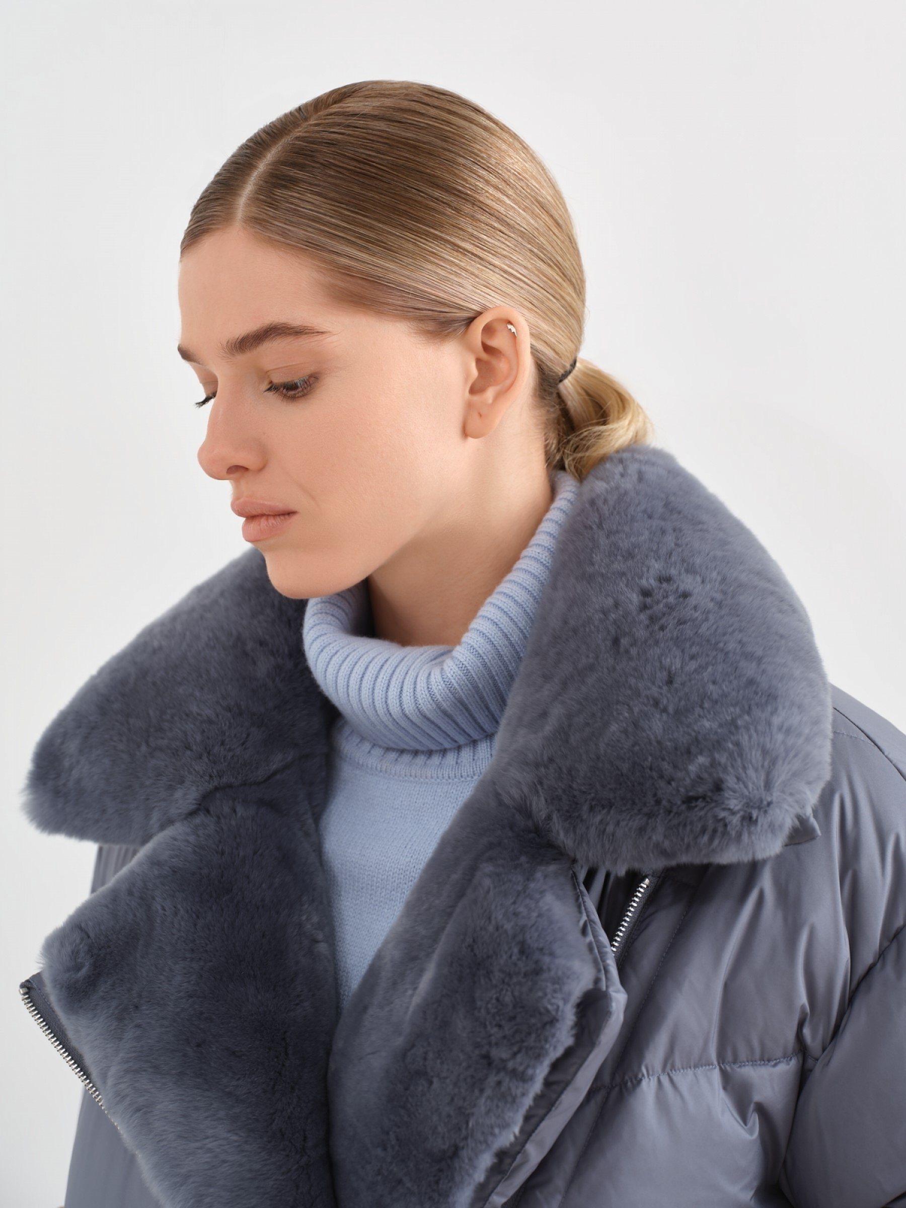 Куртка-авиатор – классика холодного сезона. Модель средней длины особо удобна для автоледи и женщин, в жизни которых много активностей. У изделия крупная стежка и лаконичный дизайн, поэтому вы удачно впишете его в любой образ. За тепло отвечает многослойная архитектура, пуховой наполнитель и съемный отложной воротник из нежного меха кролика рекс. Для максимального уюта в морозные дни молнию можно застегнуть доверху.