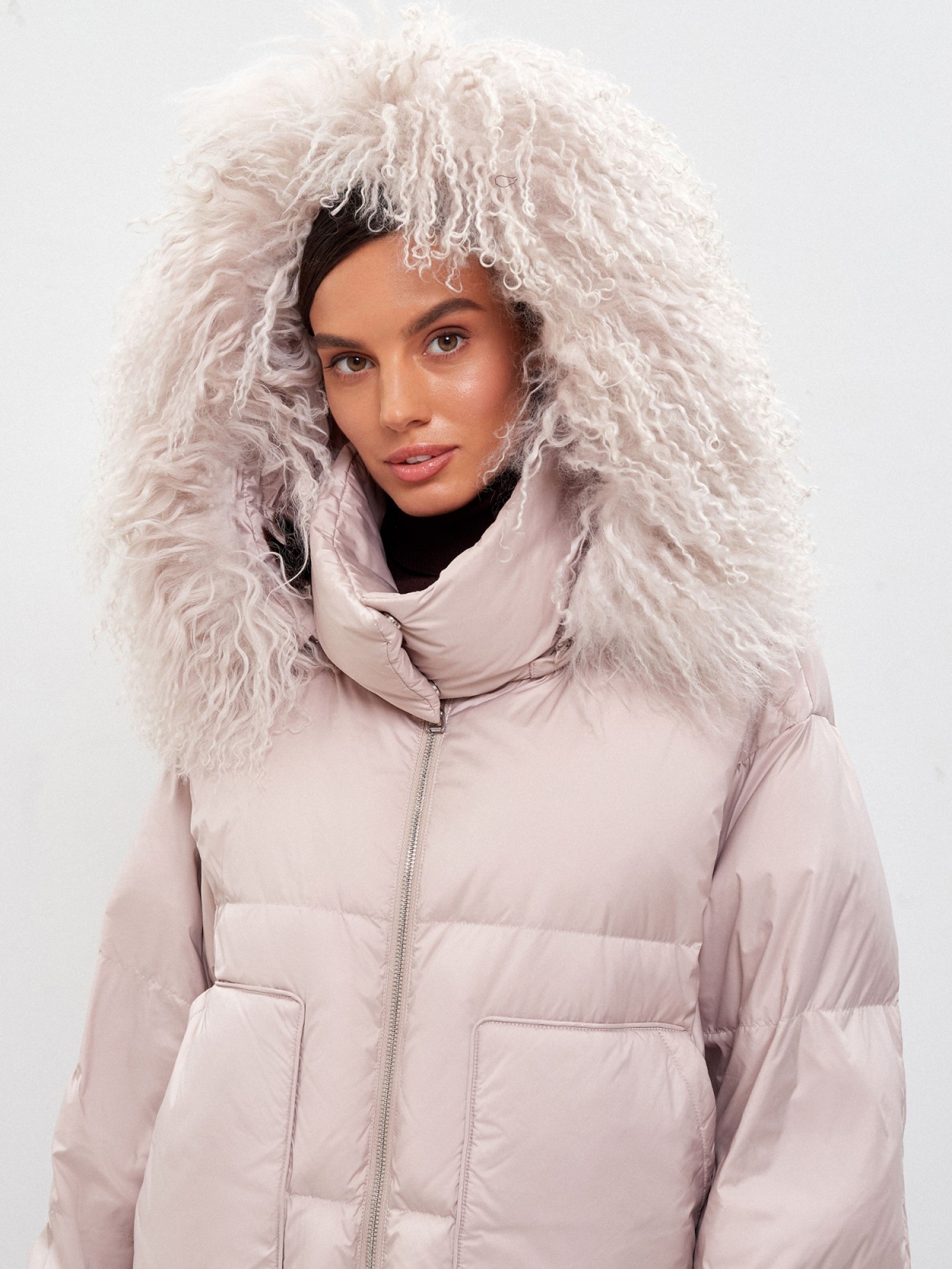 Объемная куртка-бомбер свободного кроя со спущенной линией плеча и высоким воротником-стойкой, а также рукавами комфортной ширины на резинках и застежкой на молнию. Кулиска по низу изделия отлично защищает от задувания ветра. Акцентной деталью модели является глубокий капюшон со съемной опушкой из меха ламы, придающий образу легкость и воздушность. Модель представлена в трендовых пастельных оттенках: latte, panna cotta, nero. Куртка спортивного стиля станет незаменимой деталью повседневного образа. Рекомендуем сочетать с широкими джинсами и ботинками на массивной платформе Выполнена из 100% полиэстра. Для наполнения выбран натуральный пух и перо.