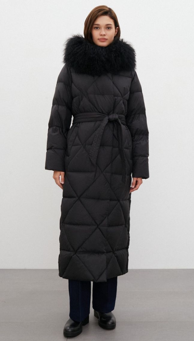 Элегантное и женственное пальто выполнено из плотного матового материала с комфортным утеплителем из натурального пуха и пера. Застегивается на однотонные кнопки до самого низа. Модель дополнена карманами, оформленными листочками. Талия подчеркнута широким поясом. Акцентной деталью модели является глубокий капюшон со съемной опушкой из меха ламы, придающий образу легкость и воздушность. Боковые разрезы на кнопках, позволяющие регулировать силуэт пуховика, а также ультрамодная ромбовидная стежка. Стеганая верхняя одежда – тренд этого года по версии Vogue. Лучшее решение для девушек, не желающих отставать от модных трендов ни на шаг.
