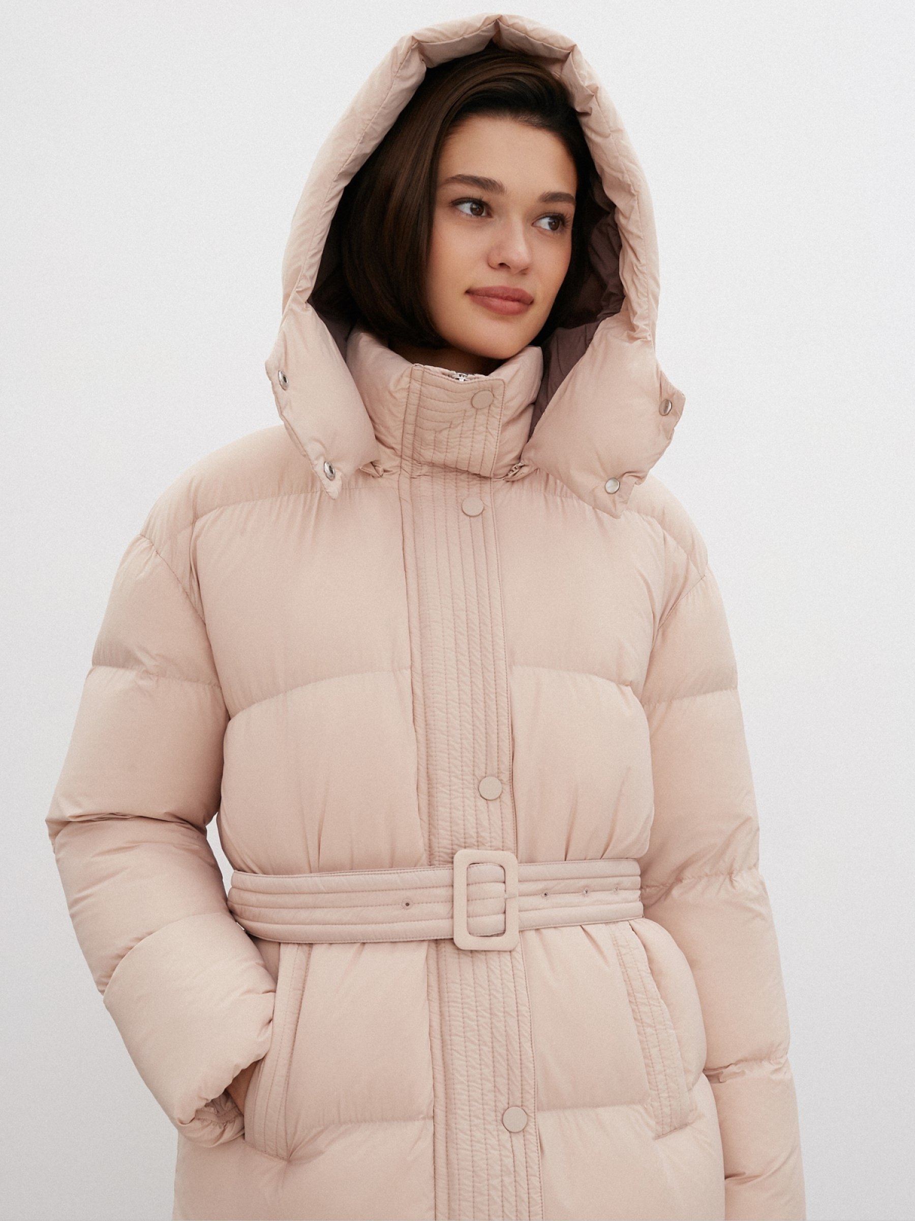 Классическое пуховое пальто прямого кроя. Модель дополнена воротником стойкой и застежкой молнией, скрытой клапаном на кнопках. Глубокий съемный капюшон с контрастной подкладкой станет изюминкой вашего образа. Пальто имеет широкий съемный пояс. Вы можете носить модель без него, чтобы сделать силуэт прямым, либо с поясом, чтобы подчеркнуть талию. Пальто идеально впишется в гардеробы разных направлений: от делового дресс-кода до спортивного стиля. Для повседневного лука сочетайте модель с высокими сапогами и трикотажным комплектом – облегающим джемпером и юбкой-миди.