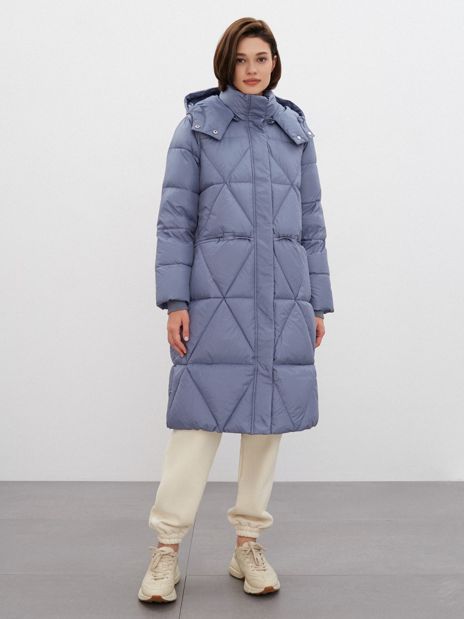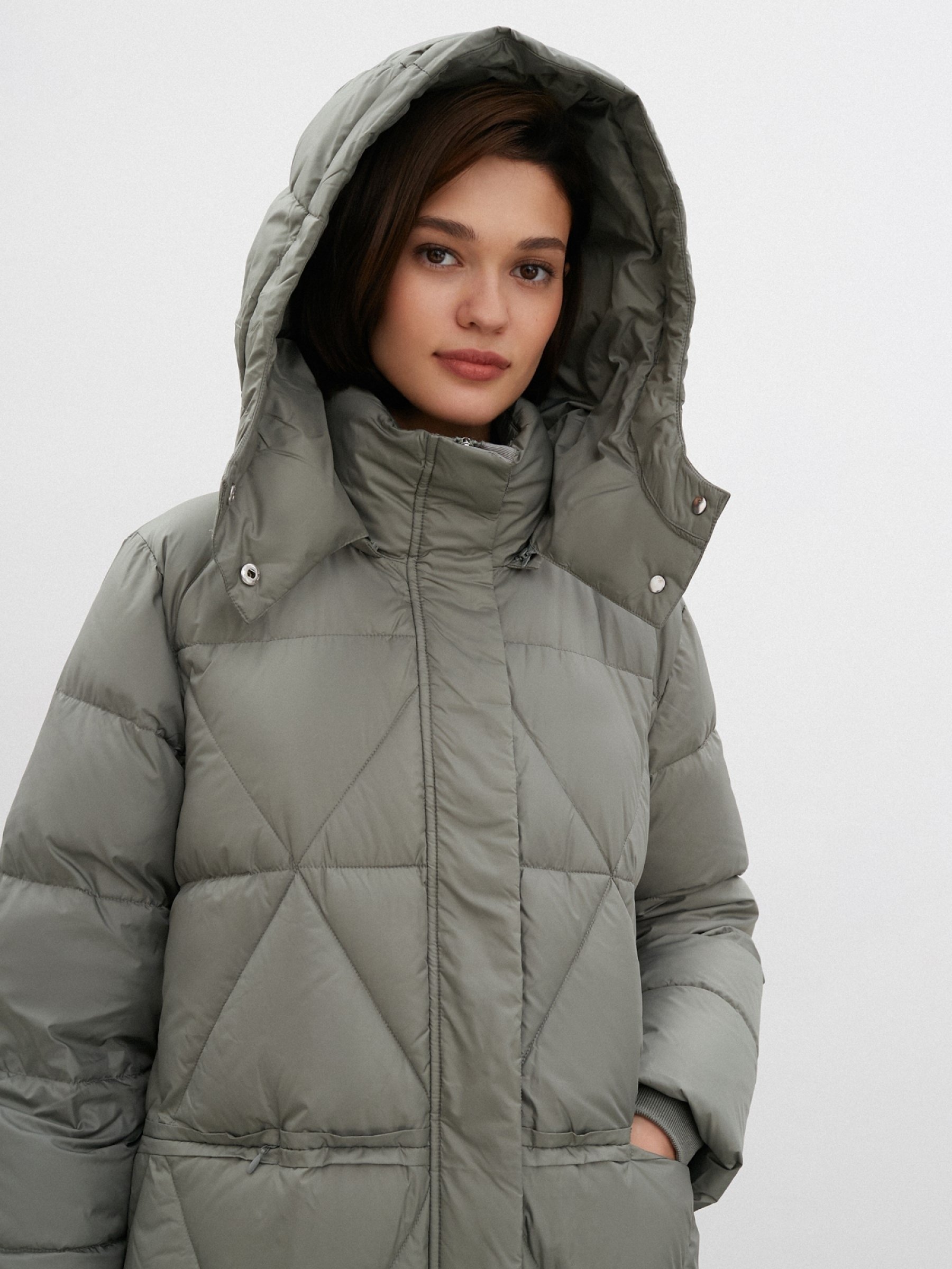 Классическое пуховое пальто с ультрамодной геометричной стежкой. Модель прямого кроя с небольшим расширением к низу. Имеет высокий воротник-стойку. Застегивается на молнию, замаскированную клапаном на кнопках. Врезные карманы на молниях - для хранения самых важных мелочей. Пальто прекрасно сочетается с джинсами скинни и клеш, с узкими брюками, длинными платьями.