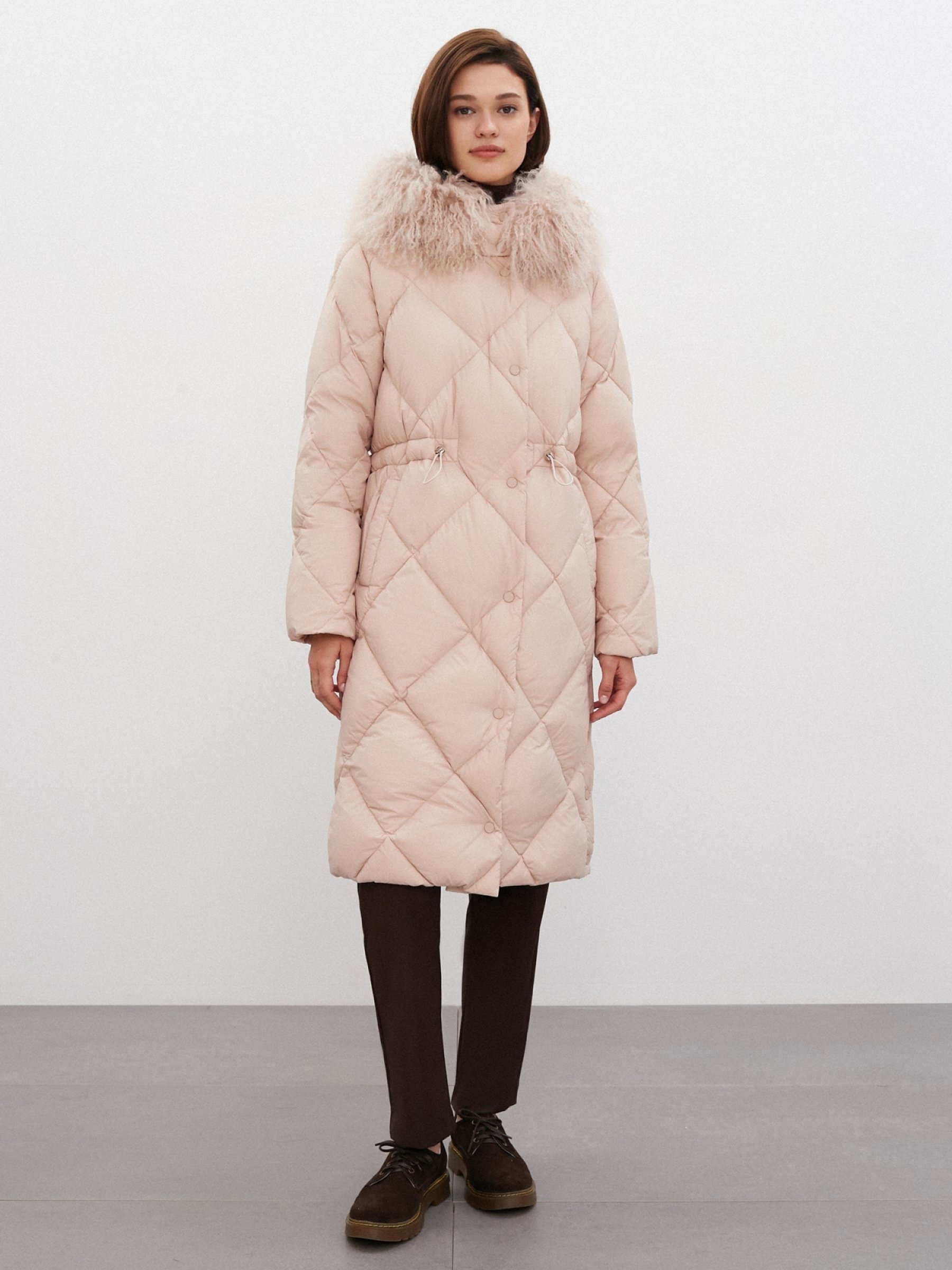 Эффектное пальто с наполнителем из гусиного пуха украшено модной ромбовидной стежкой. Модель застегивается на молнию и однотонные кнопки до самого низа. Талия подчеркнута кулиской. Акцентными деталями модели являются: глубокий капюшон со съемной опушкой из меха ламы, придающий образу легкость и воздушность; а также боковые вырезы на кнопках, расстегнув которые, Вы сделаете силуэт более объемным.