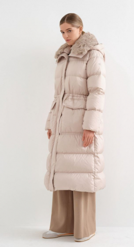 Детали этого пальто продуманы для максимальной защиты от холода: плотная матовая ткань, наполнитель из гусиного пуха и пера, утепленный анатомический капюшон, внутренняя кулиска и съемный воротник из мягкой овчины. При этом у модели современный дизайн с трендовыми накладными карманами, который органичен и классическим, и casual-аутфитам. Полная длина выгодно перекрывает средний слой и позволяет быстро и без стилевых ограничений собирать нужные луки.