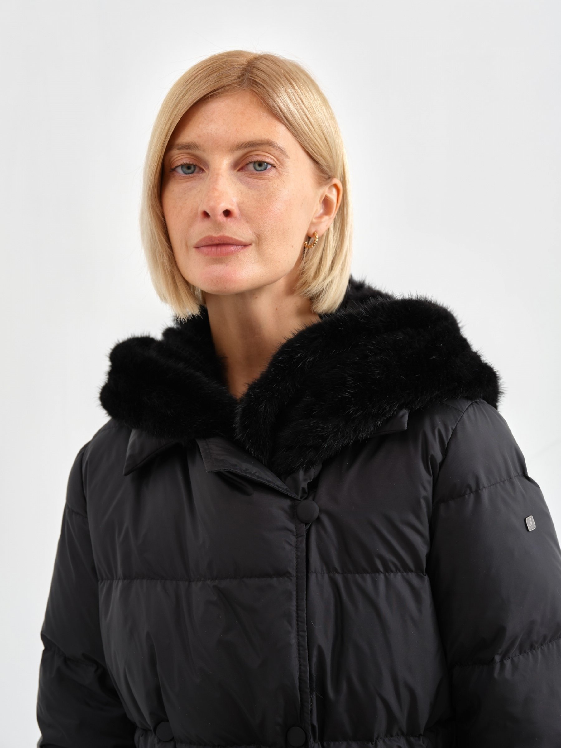 Бестселлер CONSO – классическое двубортное пальто со съемным вязаным капюшоном из меха норки. Данная деталь также выполняет функцию воротника, красиво презентуя портретную зону. Элегантную эстетику модели дополнительно оттеняют прямой крой, полная длина и плотная матовая ткань. Все эти решения органично вписывают пальто в традиционные луки с брюками, джинсами и юбками. Наполнитель из гусиного пуха и пера дарит легкость и согревает даже в сильные холода.