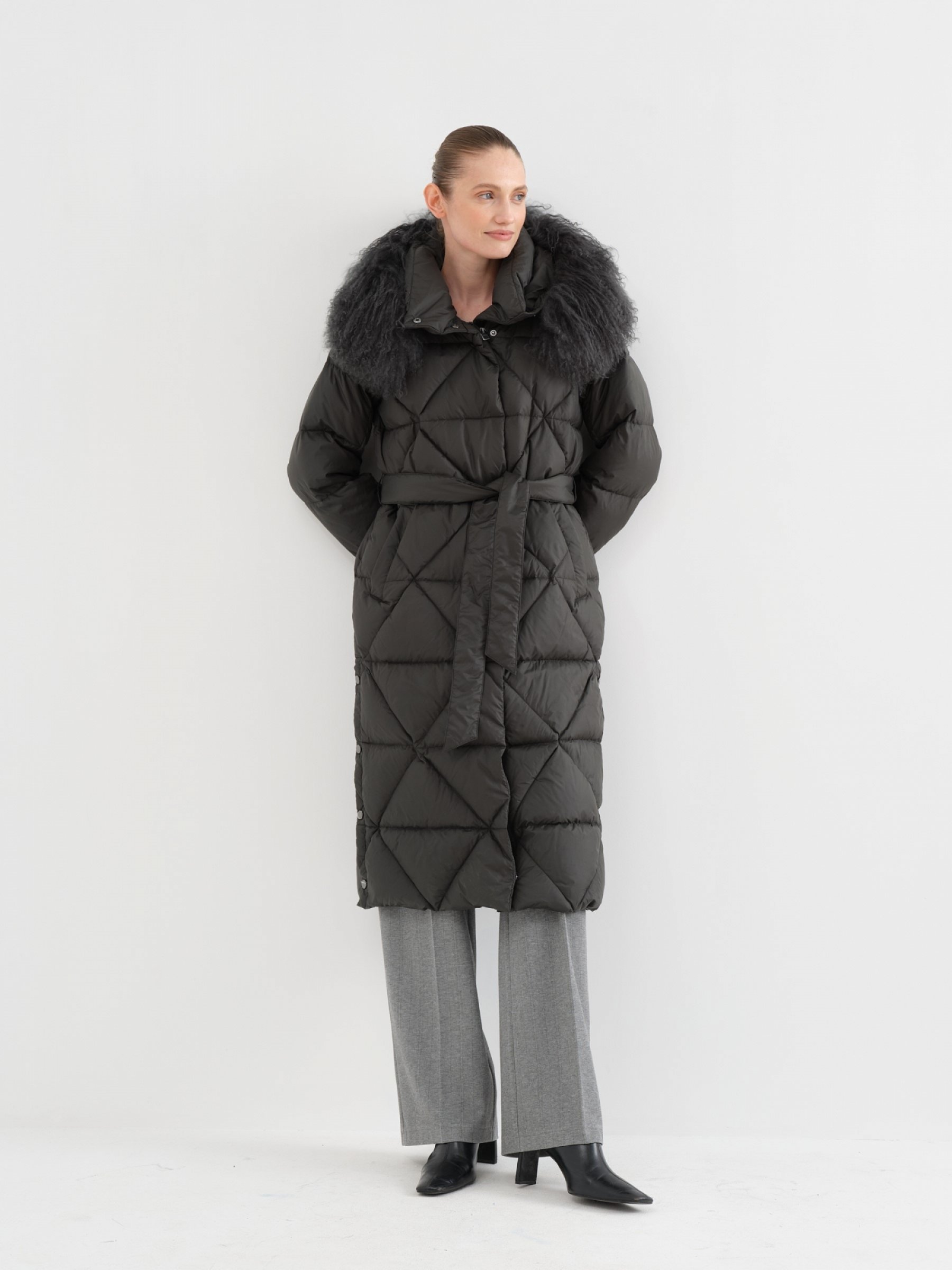 Перед вами одна из самых теплых моделей коллекции, – выполнена из нескольких слоев, в длине миди, наполнена пухом и пером. При этом пальто легкое и выразительное. Отметим свободный классический силуэт с поставленным плечом и боковые разрезы на кнопках, позволяющие подстраивать изделие под ваши активности. Съемный мех ламы – красивая утонченная изюминка – для уюта и настроения.