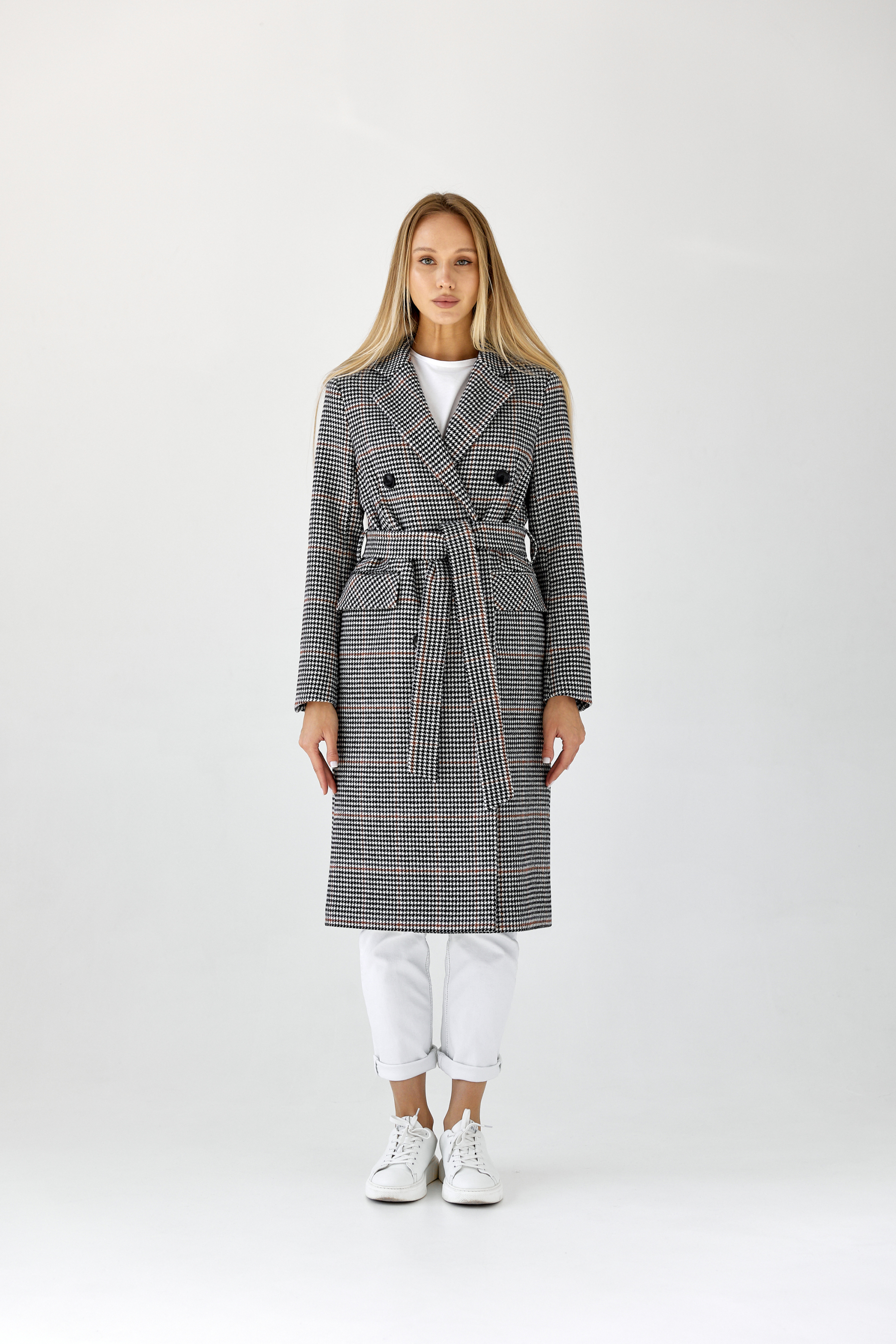 Пальто прямого силуэта с поясом.