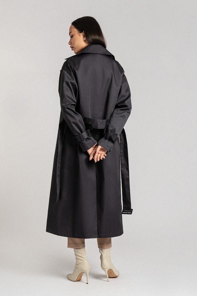 Двубортный демисезонный плащ прямого кроя с патами на рукавах, отложным воротником и высоким разрезом сзади.