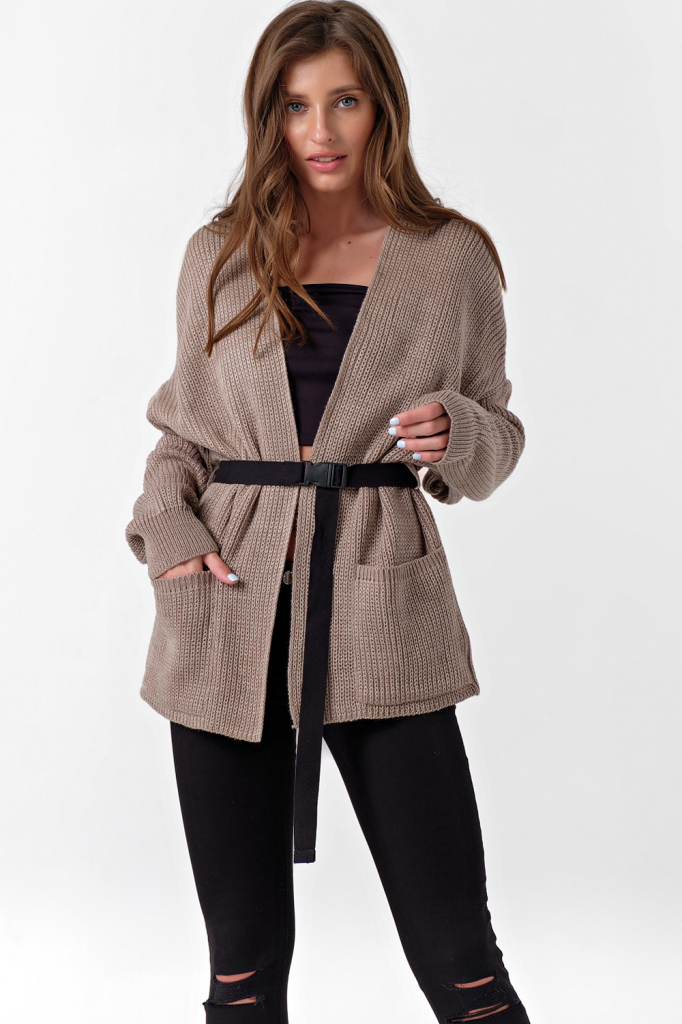 Особенности: Кардиган выполнен из фактурной вязки, смесовой пряжи, дополнен съемным поясом.