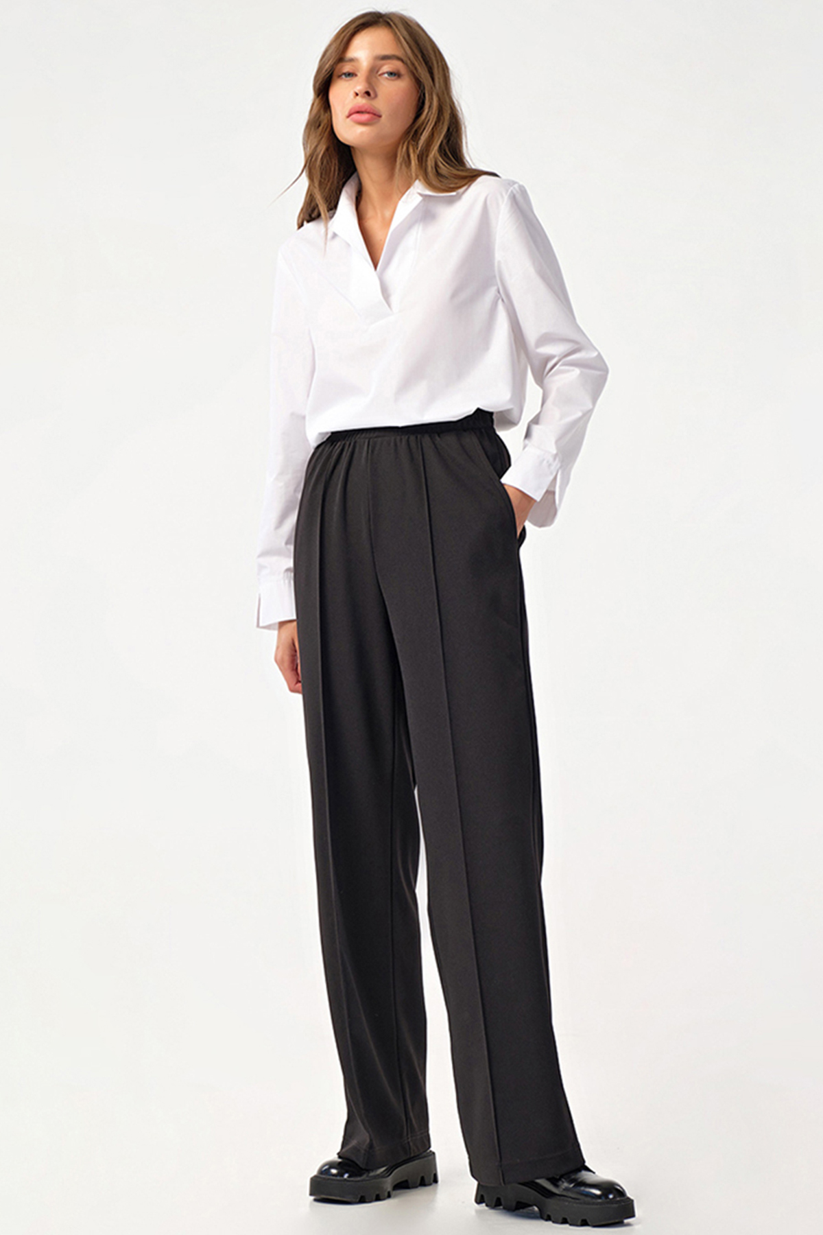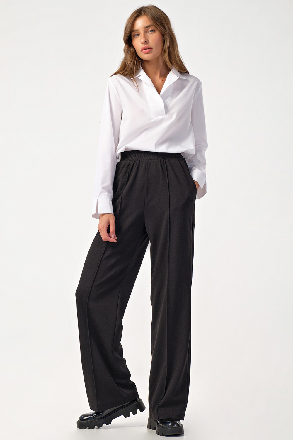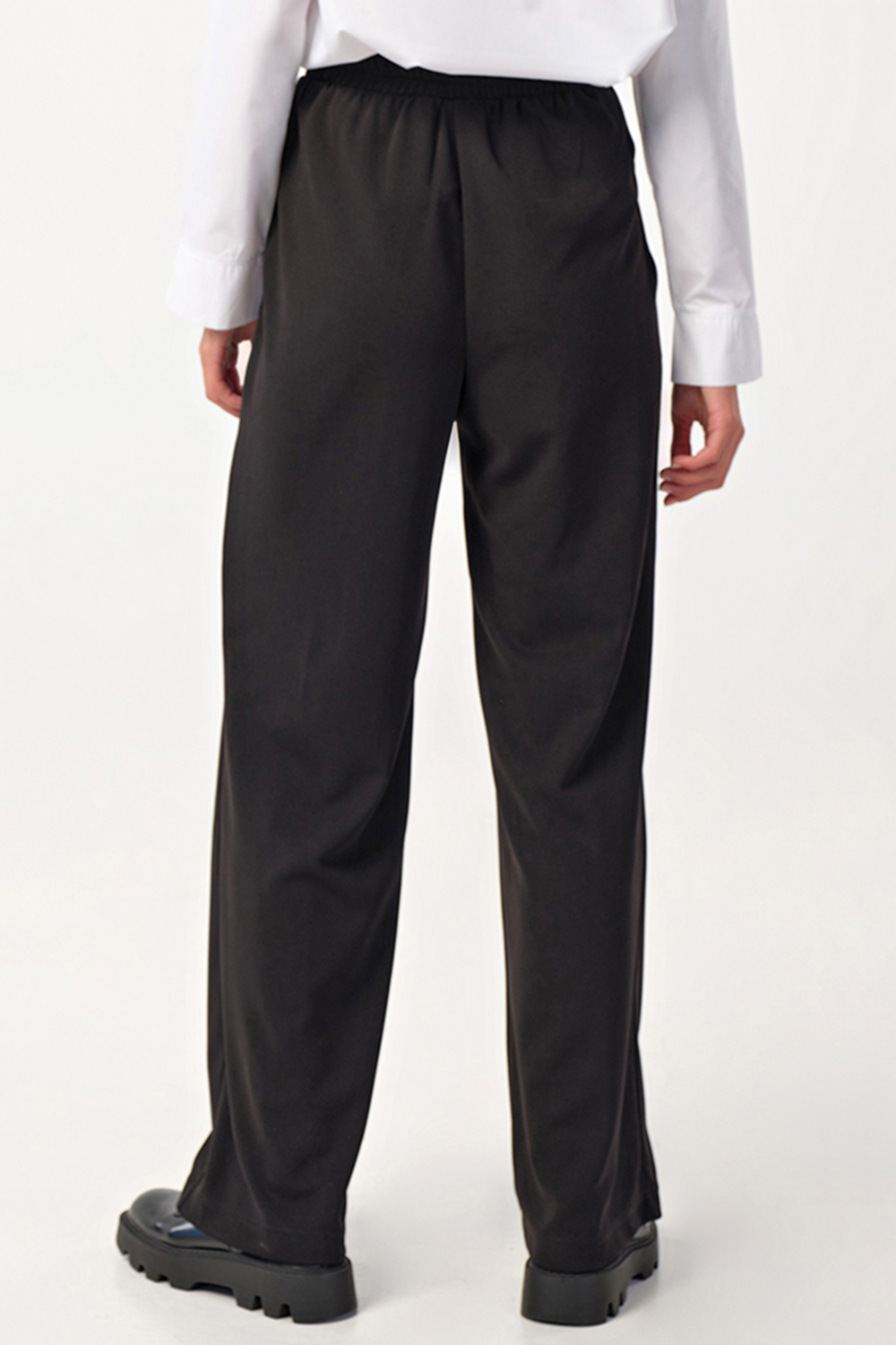 • Особенности: Брюки прямого силуэта из плотного трикотажа. Детали: притачной пояс на резинке с двойной настрочкой, боковые карманы, застроченные стрелки по переду. Без застежки.