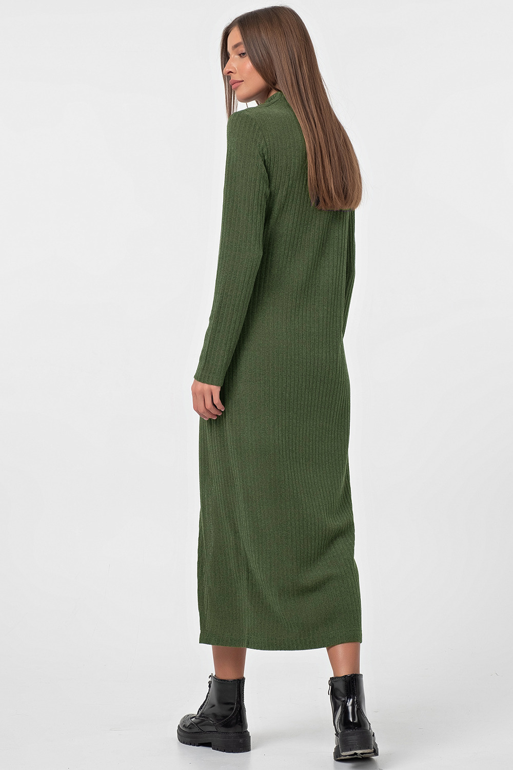 Особенности: Платье прямого силуэта из трикотажа в рубчик. Детали: цельнокронный воротник-стойка, длинный втачной рукав, запах по переду. Без застежки.