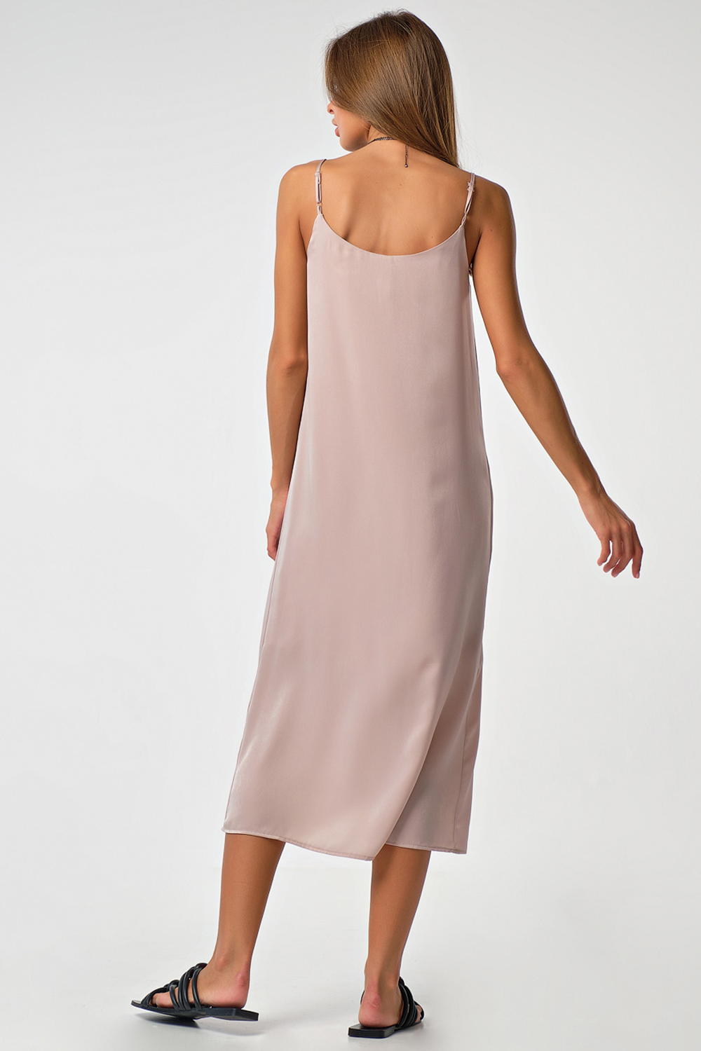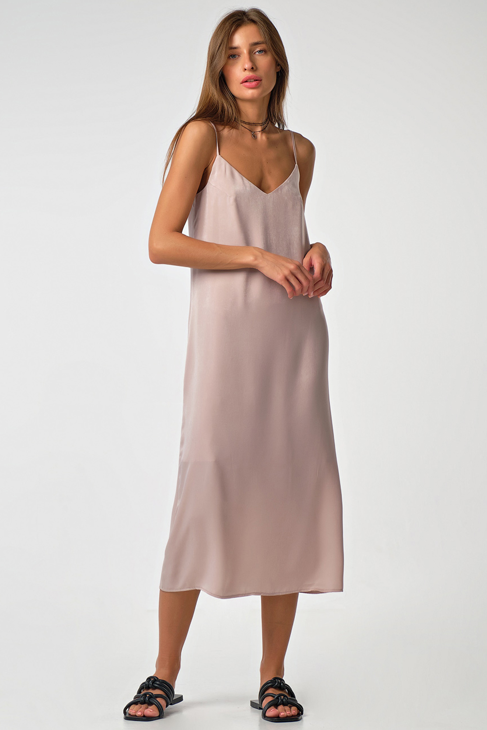 Особенности: Платье-комбинация прямого силуэта из тонкой шелковистой ткани на подкладке. Детали: V-образный вырез, тонкие бретели с регуляторами длины.