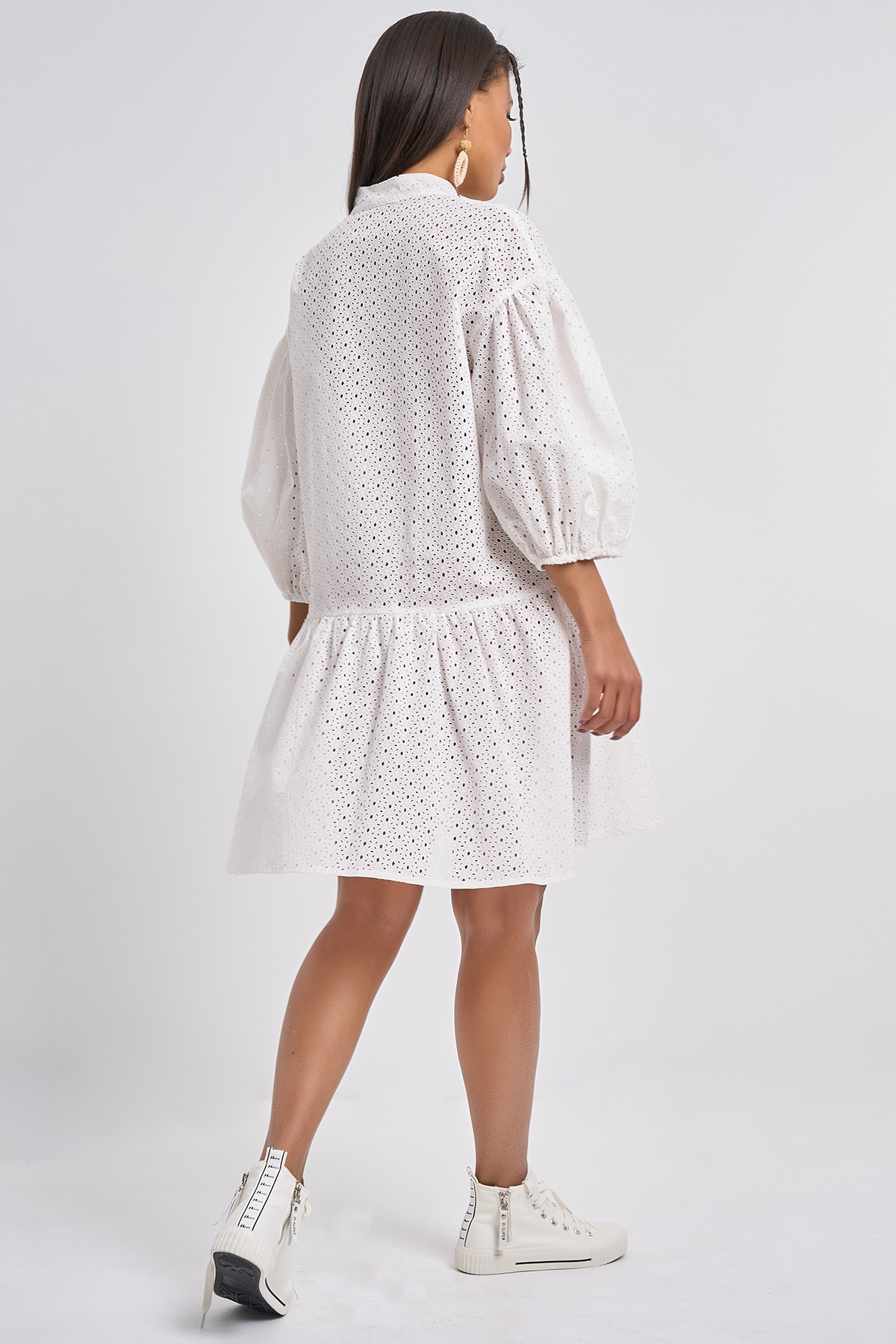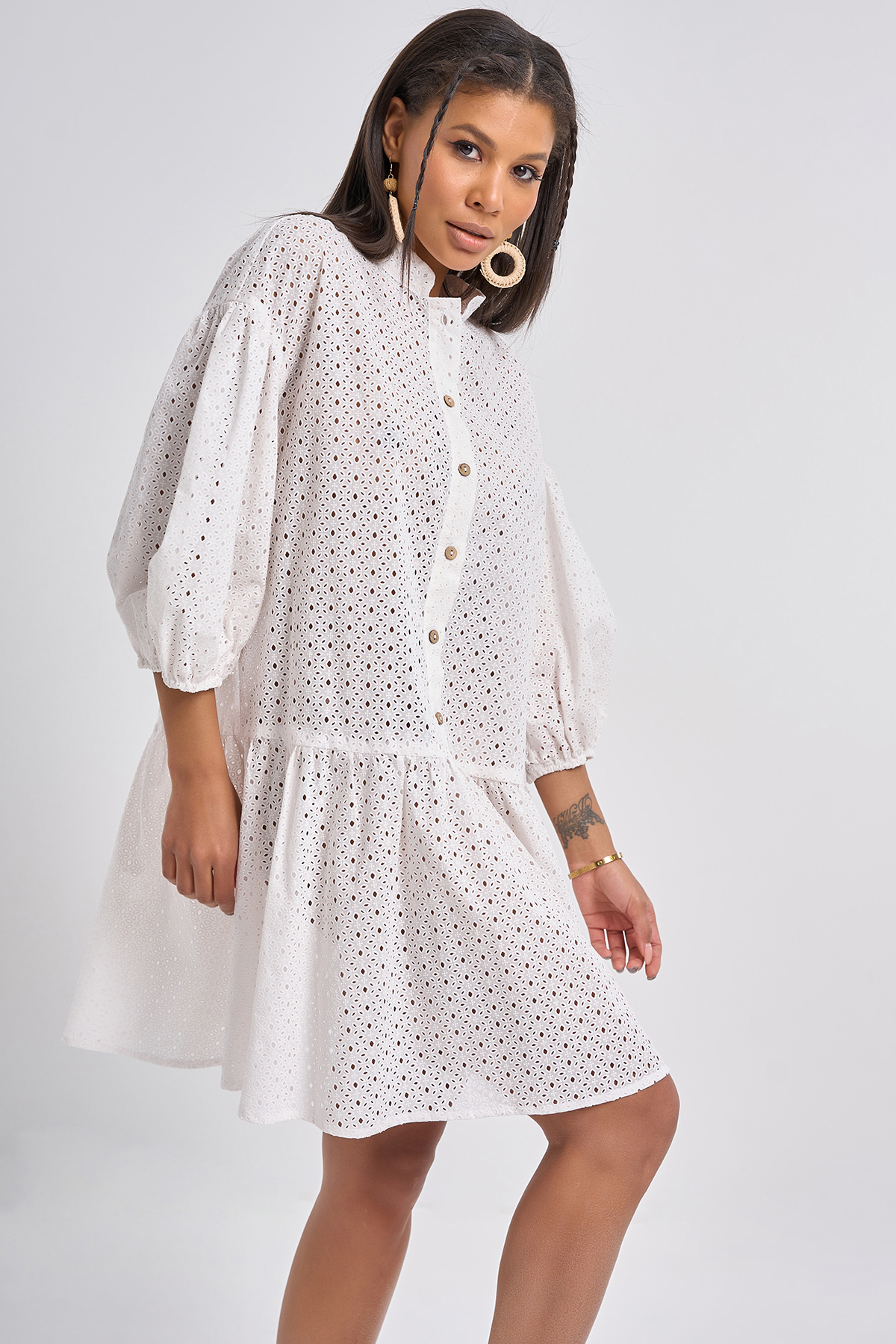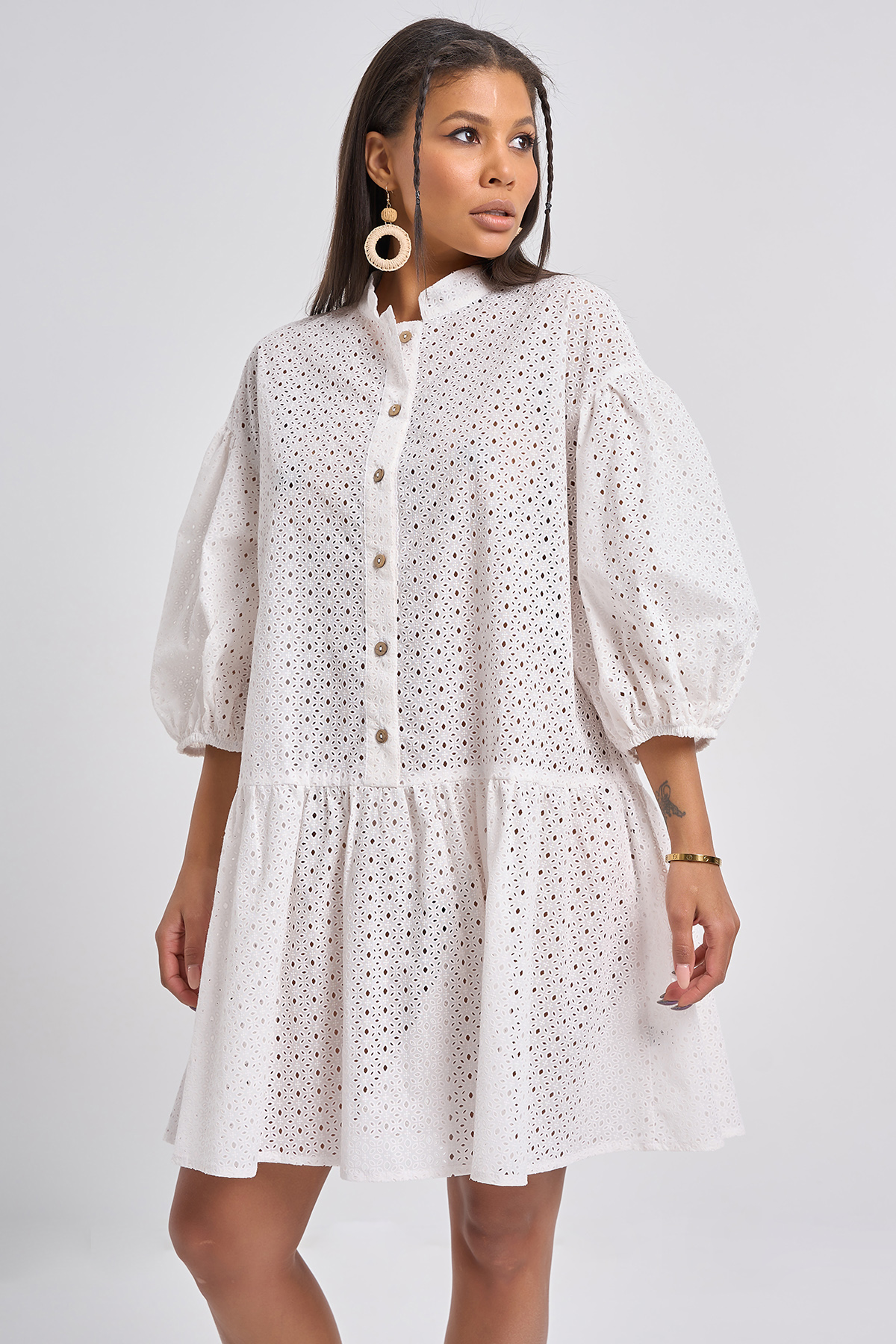 • Особенности: Платье свободного силуэта из хлопковой ткани с имитацией кружева. Детали: воротник-стойка, притачная планка по переду с застежкой на петли-пуговицы, спущенная линия плеча, широкий рукав со сборкой по окату и по низу, по низу платья широкая оборка, на ткани нанесен полимерный принт имитирующий вышивку.