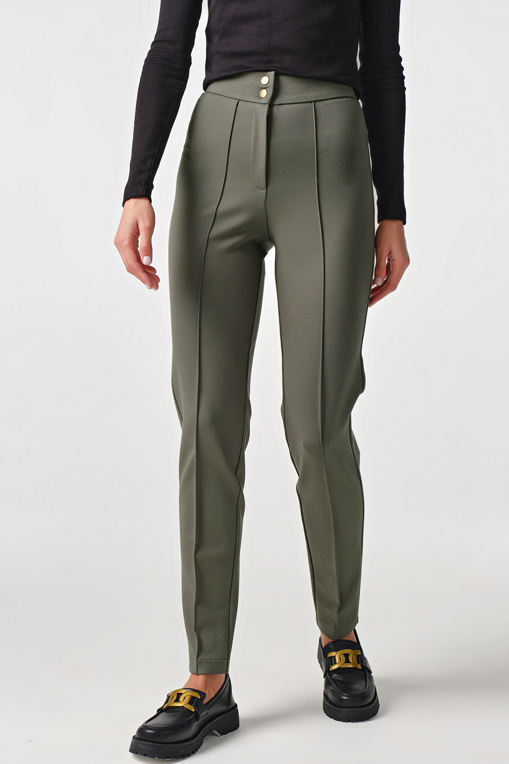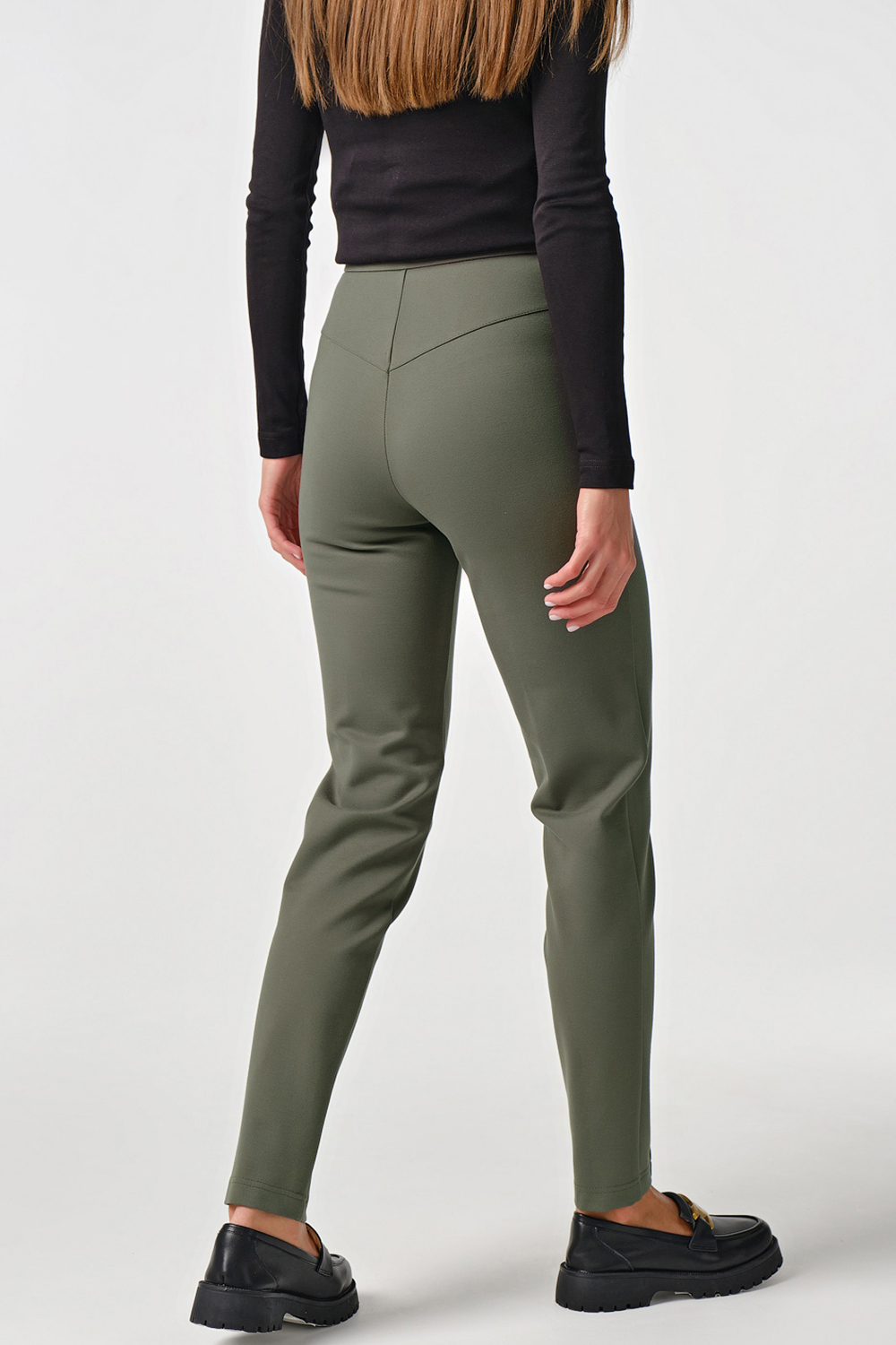 • Особенности: Брюки прилегающего силуэта из плотного трикотажа. Детали: притачной пояс с застежкой на пуговицу, по переду застроченные стрелки, кокетка по спинке, застежка на гульфик с молнией.