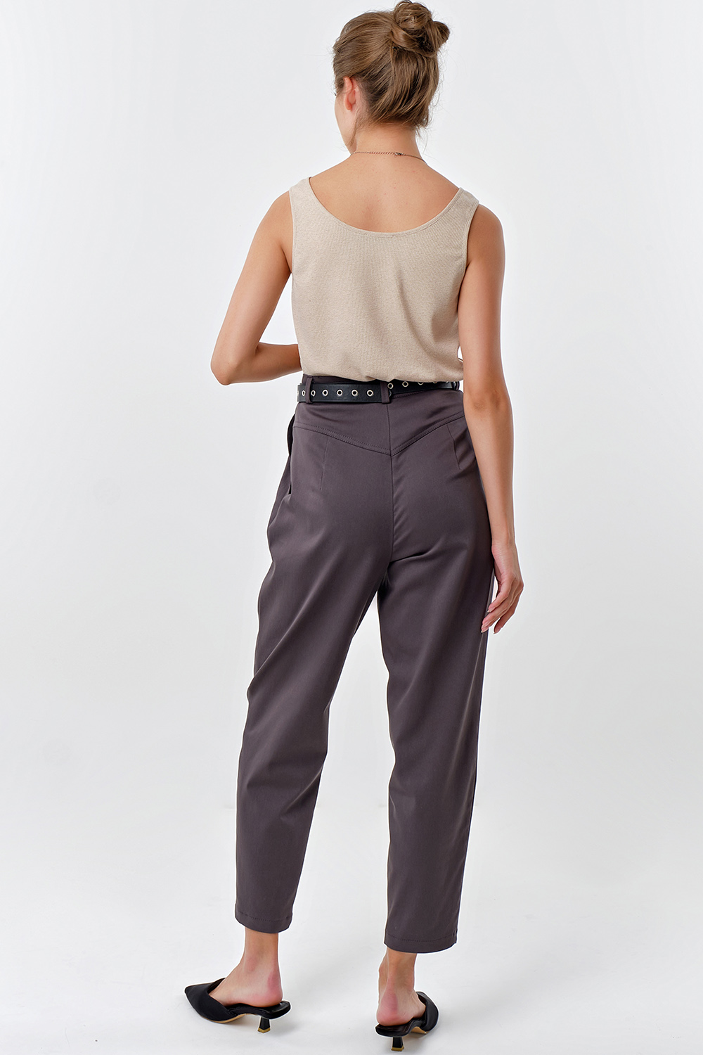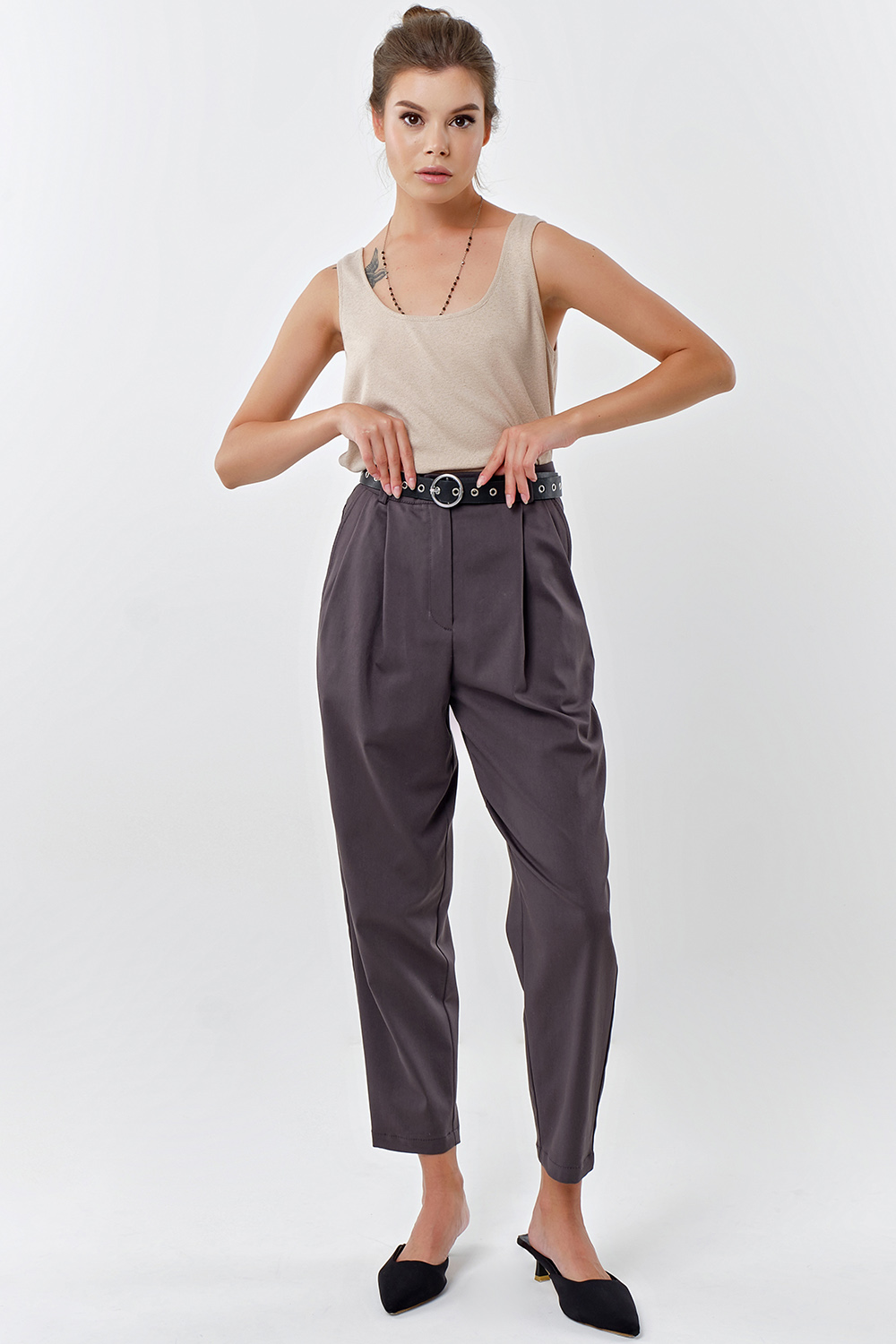 • Особенности: Брюки силуэта "бананы" из костюмной ткани. Детали: широкие по бедрам и зауженные к низу, притачной пояс со шлевками и застежкой на пуговицу, боковые карманы, защипы по переду, кокетка по спинке, застежка на молнию.