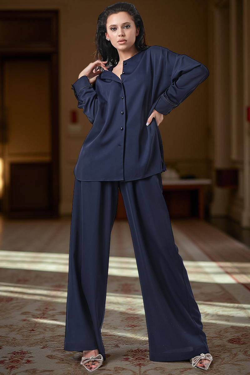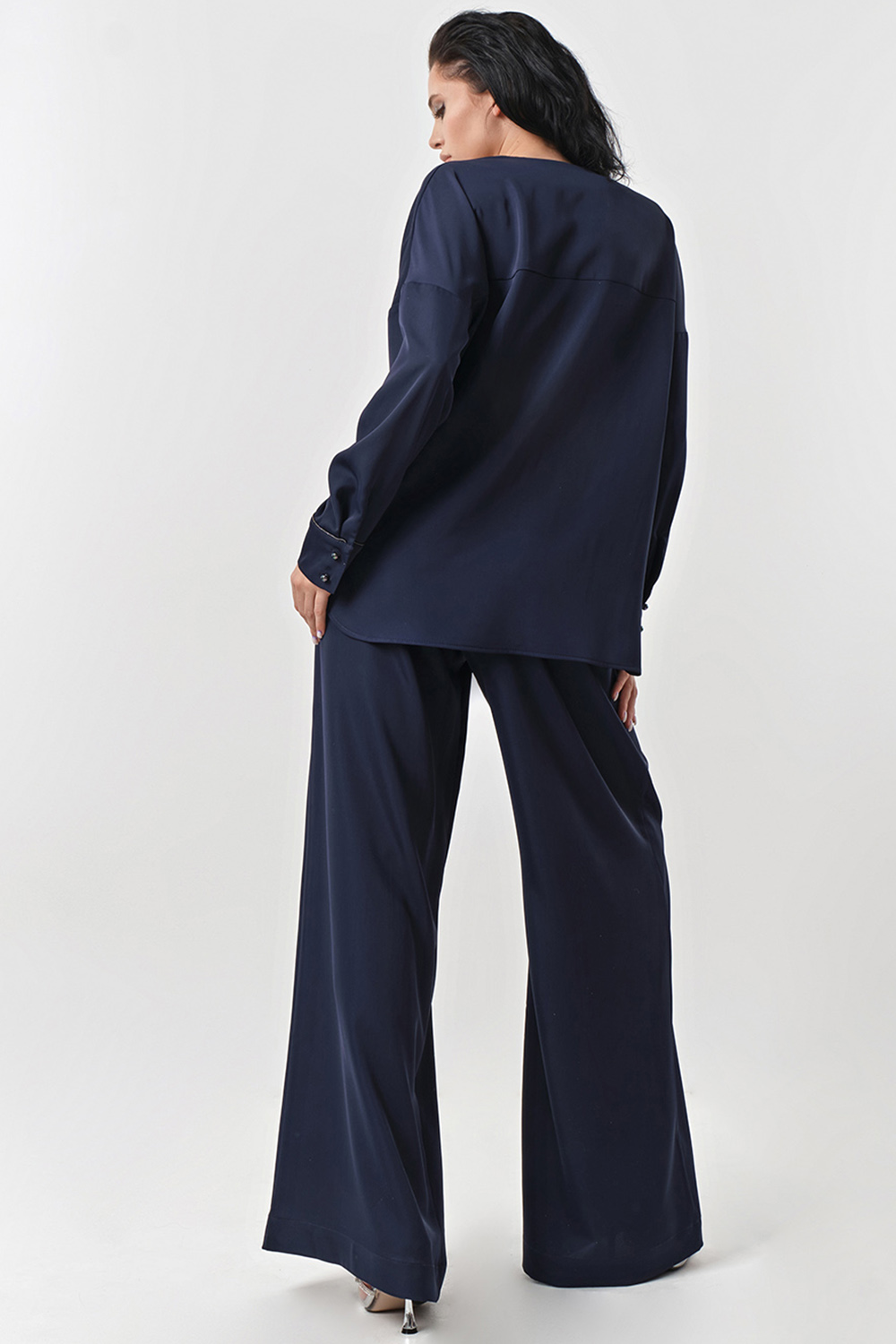 • Особенности: Костюм из рубашки и брюк из атласной ткани. Детали рубашки: прямой силуэт, горловина обработана обтачкой, спущенная линия плеча, втачной рукав, притачная манжета с застежкой на петли/пуговицы, кокетка по спинке, фигурная линия низа, по горловине и краю манжеты проложена декоративная тесьма. Застежка на петли/пуговицы. Детали брюк: прямой силуэт, притачной пояс со сборкой на резину, боковые карманы. Без застежки.
