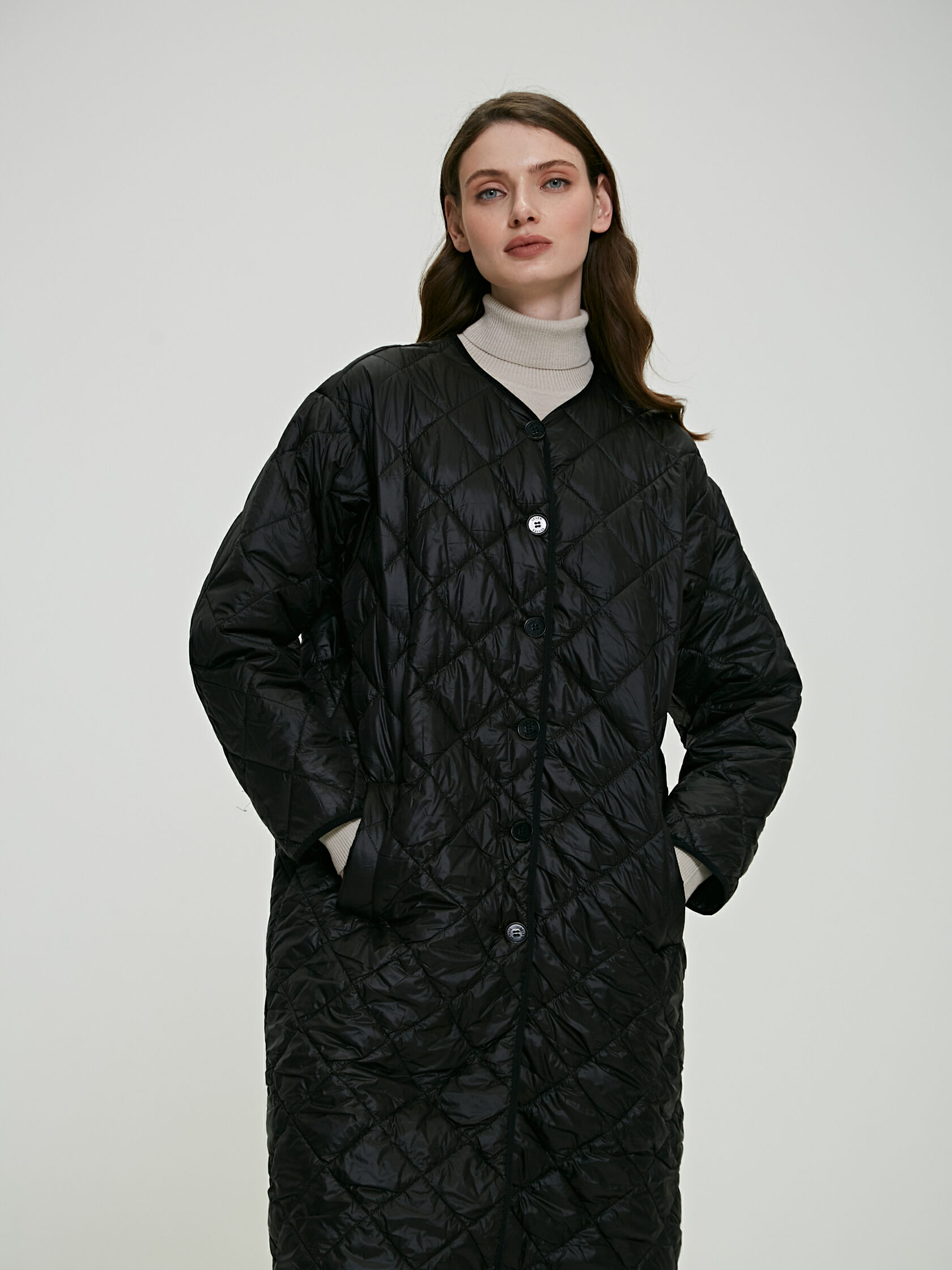 Стеганное пальто прямого свободного кроя без подклада. Модель оформлена прорезными карманами, пуговицами в тон и съемным вязанным воротником на горловине. Пальто идеально подойдет для неспешных прогулок по улицам города в хорошей компании и для жизни на больших скоростях Уход за вещами Обмеры длина изделия по спинке: 42 (xs)-112см,44 (s)-112см, 46 (m)-112см, 48 (l)-112см, 50 (xl)-112см. длина рукава: 42 (xs)-56,7см, 44 (s)-56,7см, 46 (m)-56,7см, 48 (l)-56,7см, 50 (xl)-56,7см. длина переда: 42 (xs)-113,9см, 44 (s)-114,2см, 46 (m)-114,7см, 48 (l)-115,2см, 50 (xl)-115,7см. ширина под проймой: 42 (xs)-59,3см, 44 (s)-61,3см, 46 (m)-63,3см, 48 (l)-65,3см, 50 (xl)-67,3см
