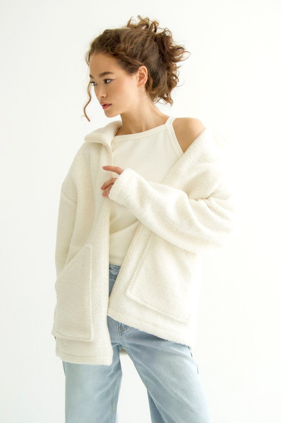 Толстовка свободного силуэта без подкладки. Основная застежка на молнию. Накладные карманы. Горловина со стойкой. По низу изделия изнутри утяжка на шляпную резинку с фиксаторами.