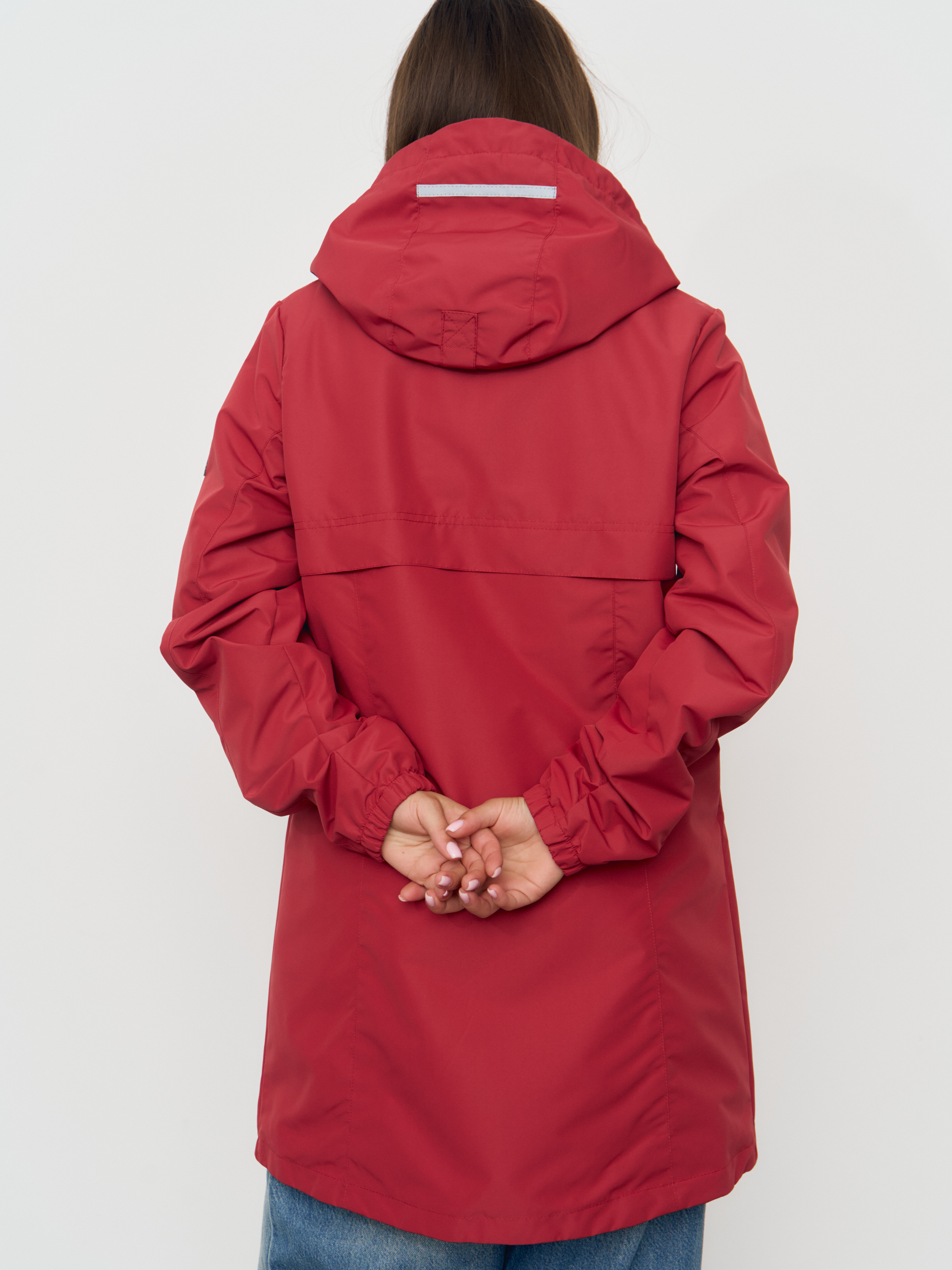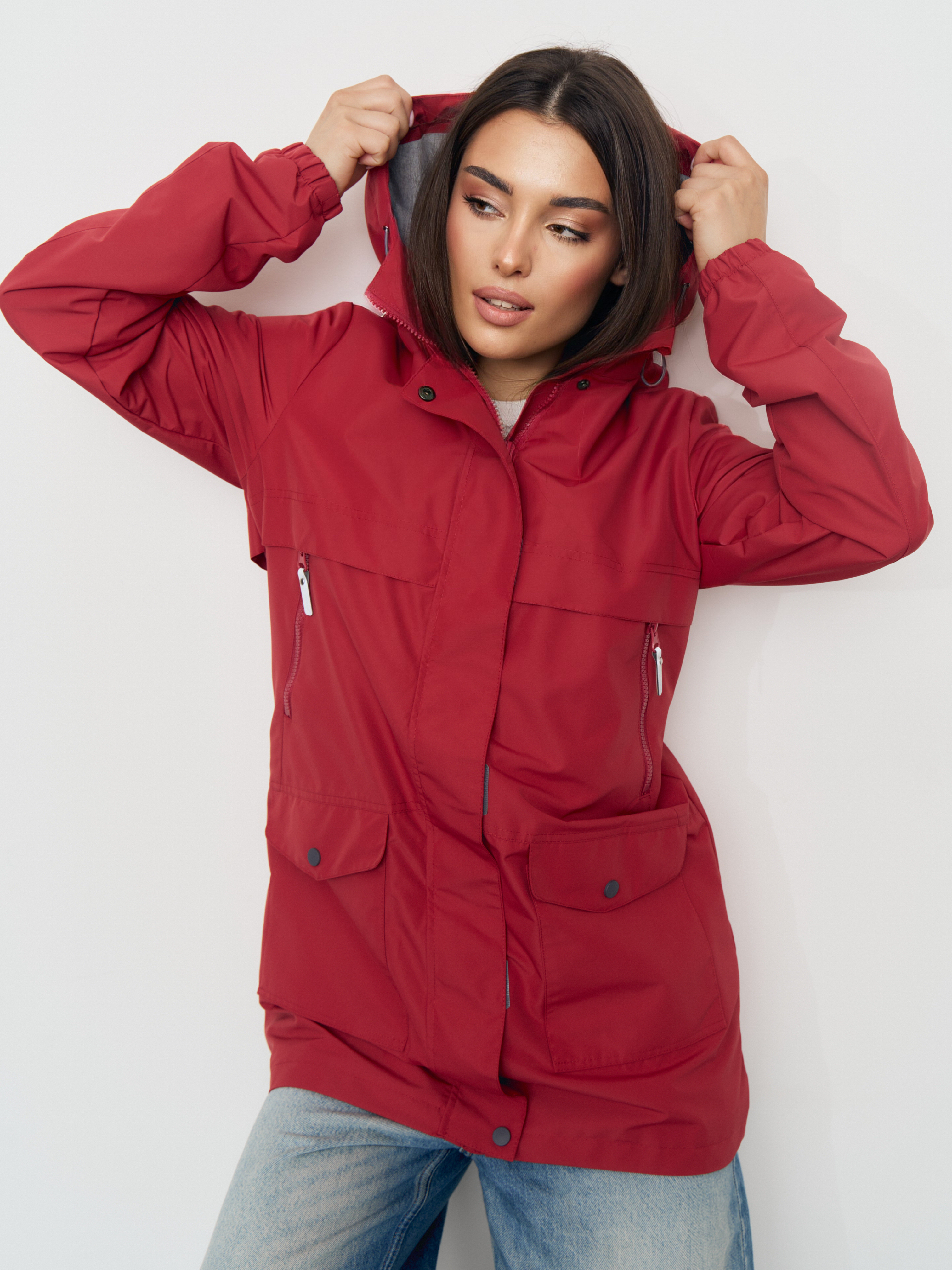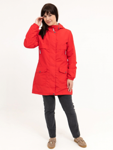 Ветровка для женщин из мембранной ткани с капюшоном. Застежка на молнию, закрытая планкой на кнопках и липучках. Комбинированная подкладка из трикотажа и шелка с накладным карманом. Втачной капюшон с подкладкой из трикотажа. 2 нижних накладных кармана с клапаном на кнопках. 2 верхних прорезных кармана с молниями. На куртке расположены светоотражающие элементы. Рассчитана на температуру от +15 до +20.