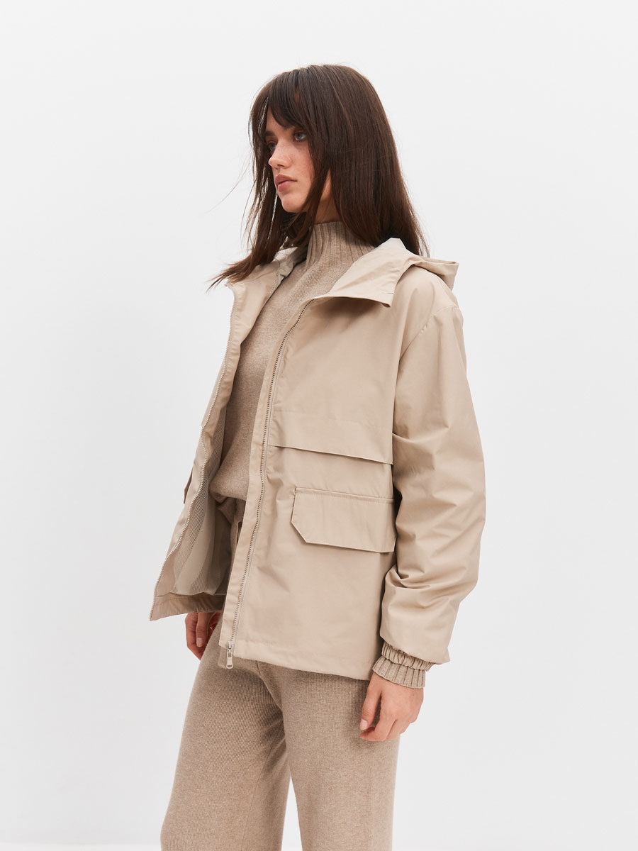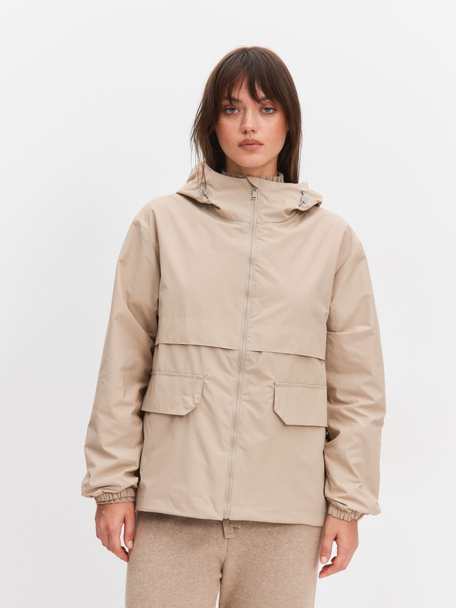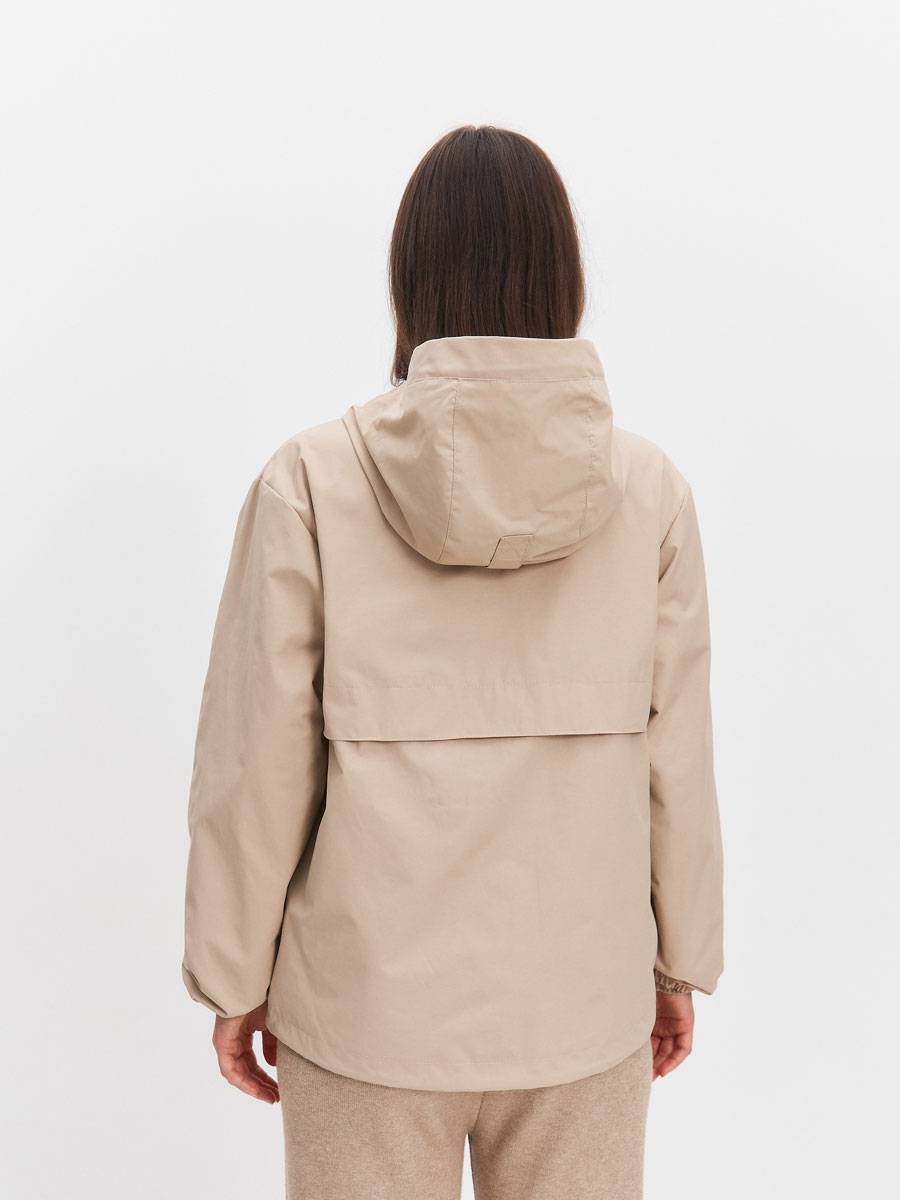Укороченная ветровка для женщин на сетке, с втачным капюшоном. Центральная застёжка – открытая молния. Прорезные карманы с листочками и клапанами на потайных кнопках. По низу куртки кулиса с резиновым шнуром и фиксаторами для регулировки. Рассчитана на температуру от +15 до +20.