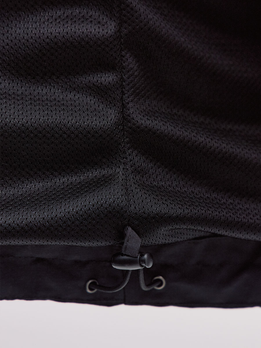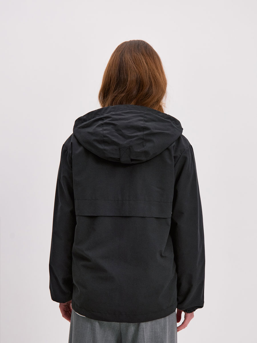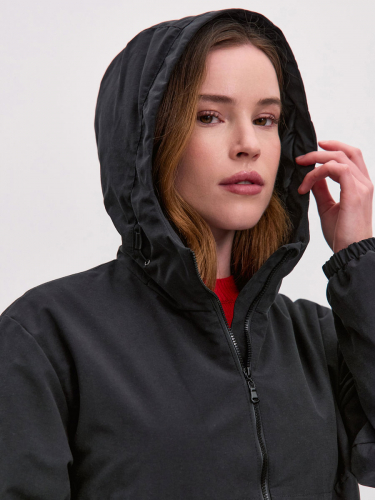 Укороченная ветровка для женщин на сетке, с втачным капюшоном. Центральная застёжка – открытая молния. Прорезные карманы с листочками и клапанами на потайных кнопках. По низу куртки кулиса с резиновым шнуром и фиксаторами для регулировки. Рассчитана на температуру от +15 до +20.