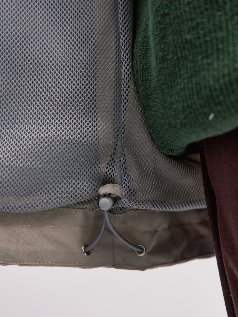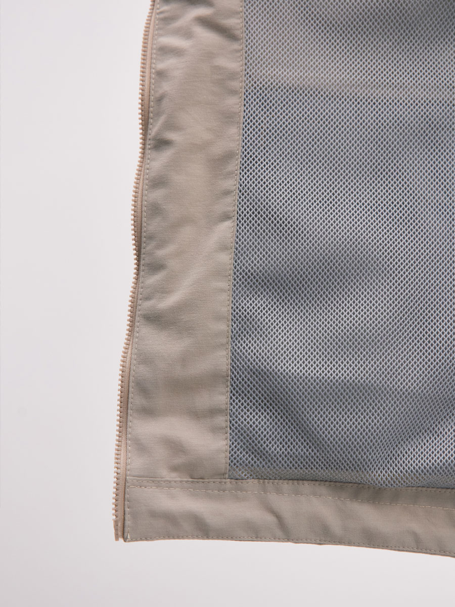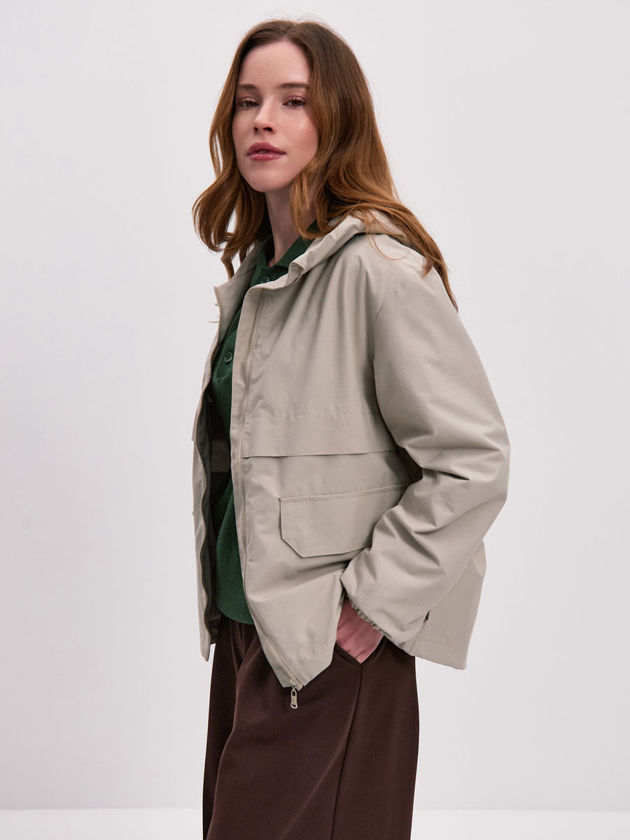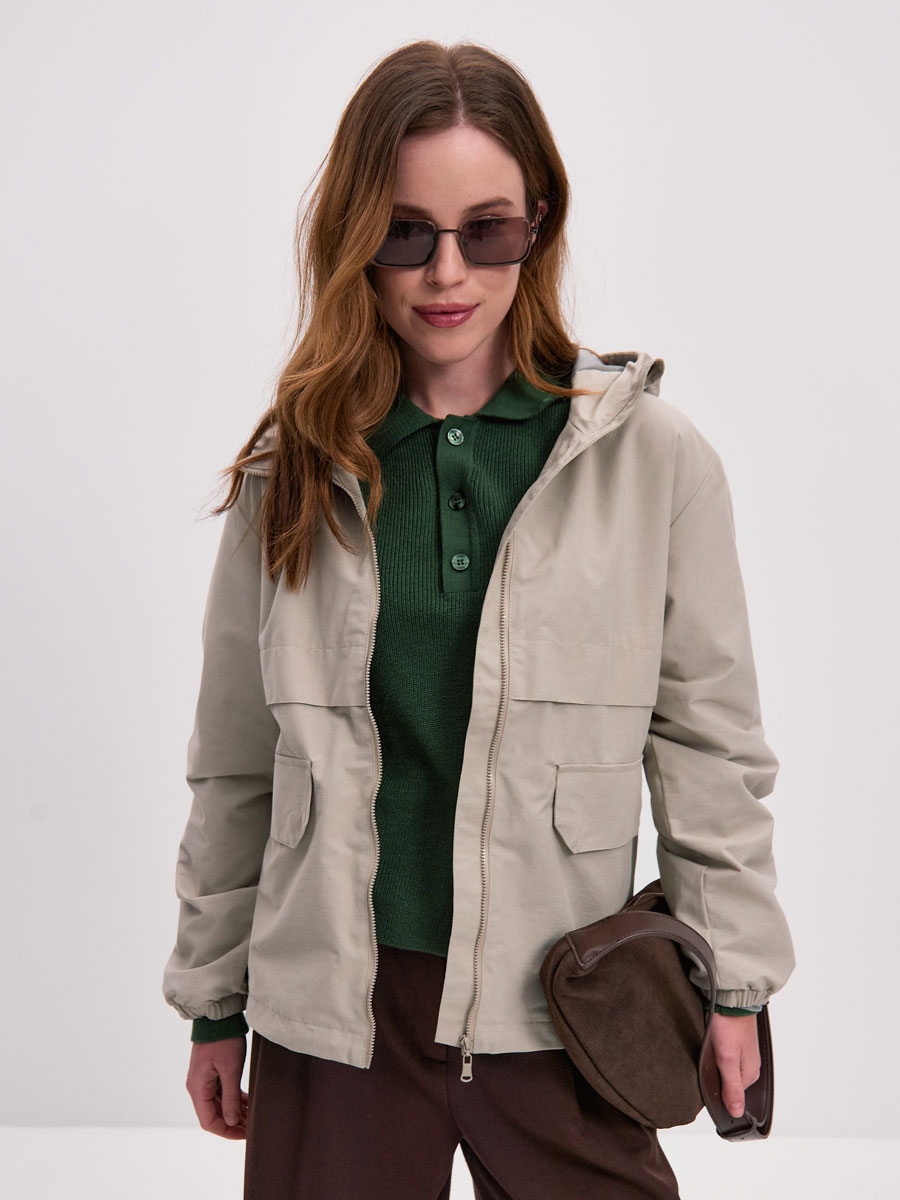 Укороченная ветровка для женщин на сетке, с втачным капюшоном. Центральная застёжка – открытая молния. Прорезные карманы с листочками и клапанами на потайных кнопках. По низу куртки кулиса с резиновым шнуром и фиксаторами для регулировки. Рассчитана на температуру от +15 до +20.