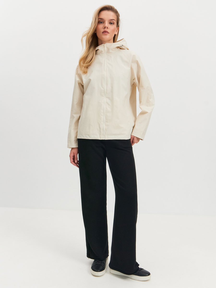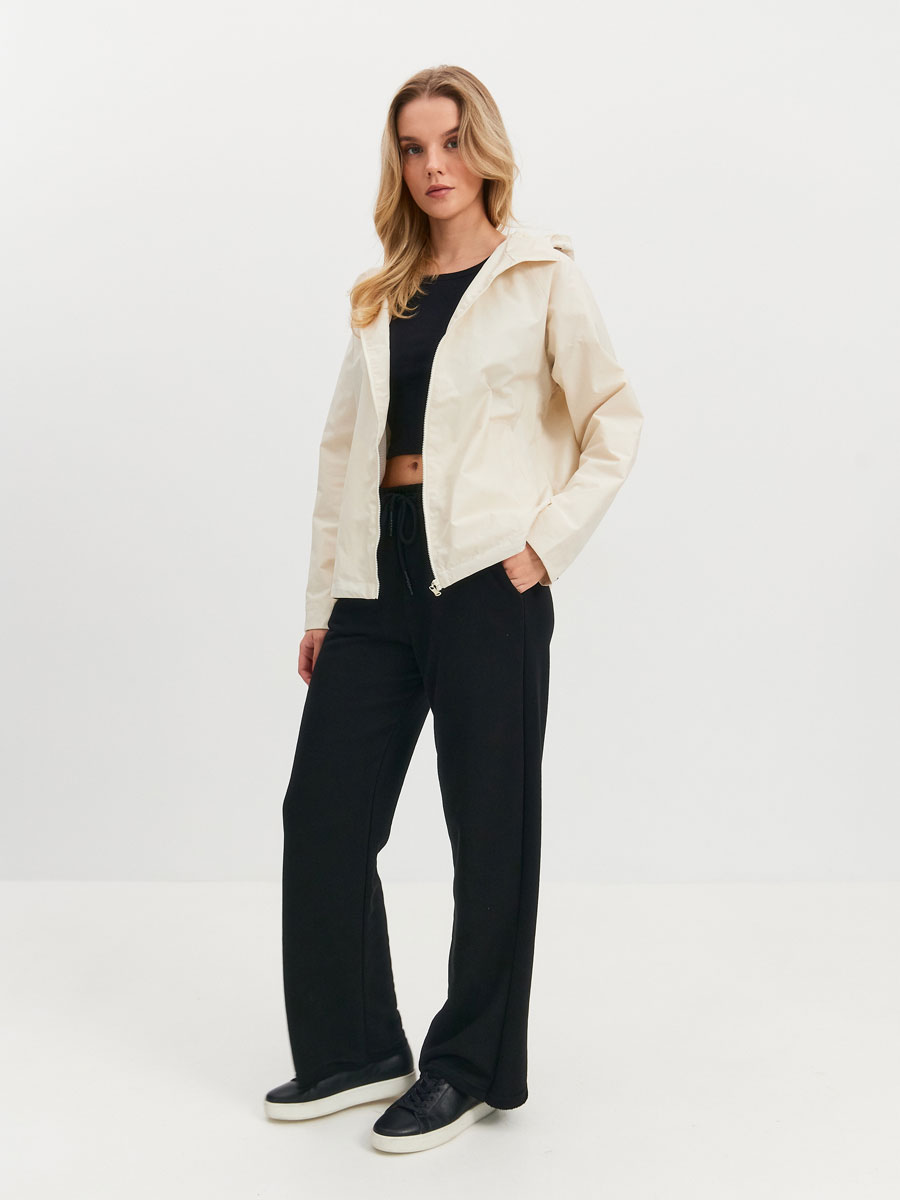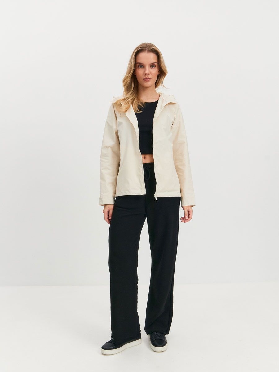 Укороченная ветровка для женщин на сетке, с втачным капюшоном и рукавами «реглан». Центральная застёжка – открытая молния. Карманы прорезные с листочками. По низу куртки кулиса с резиновым шнуром и фиксаторами для регулировки. Рассчитана на температуру от +15 до +20.
