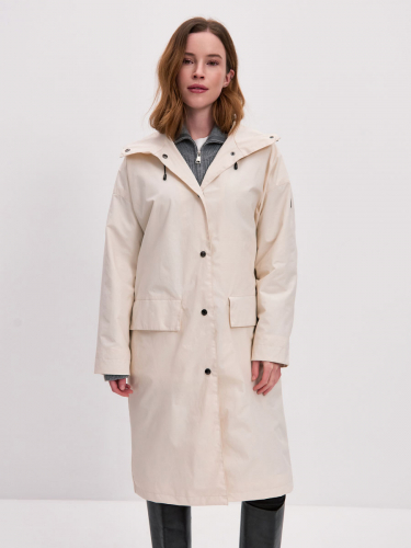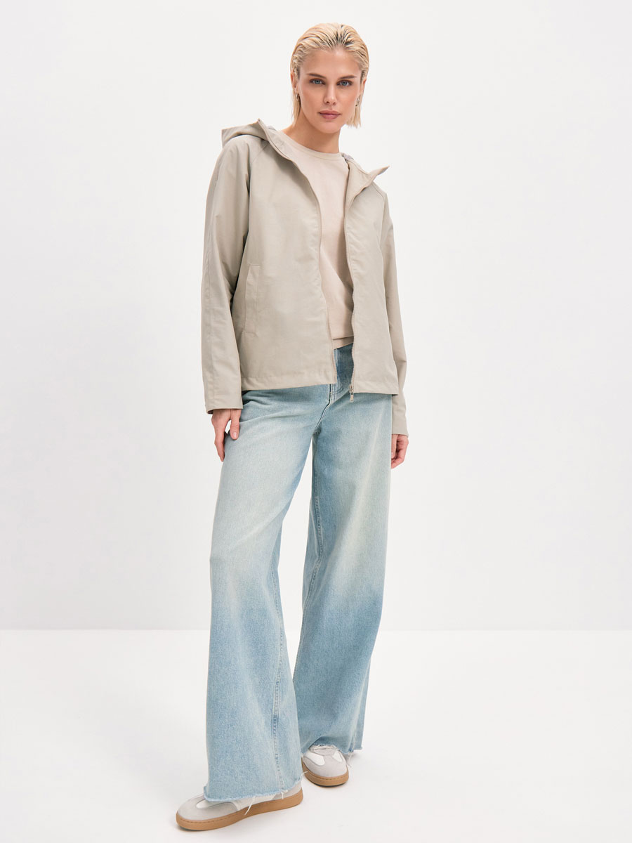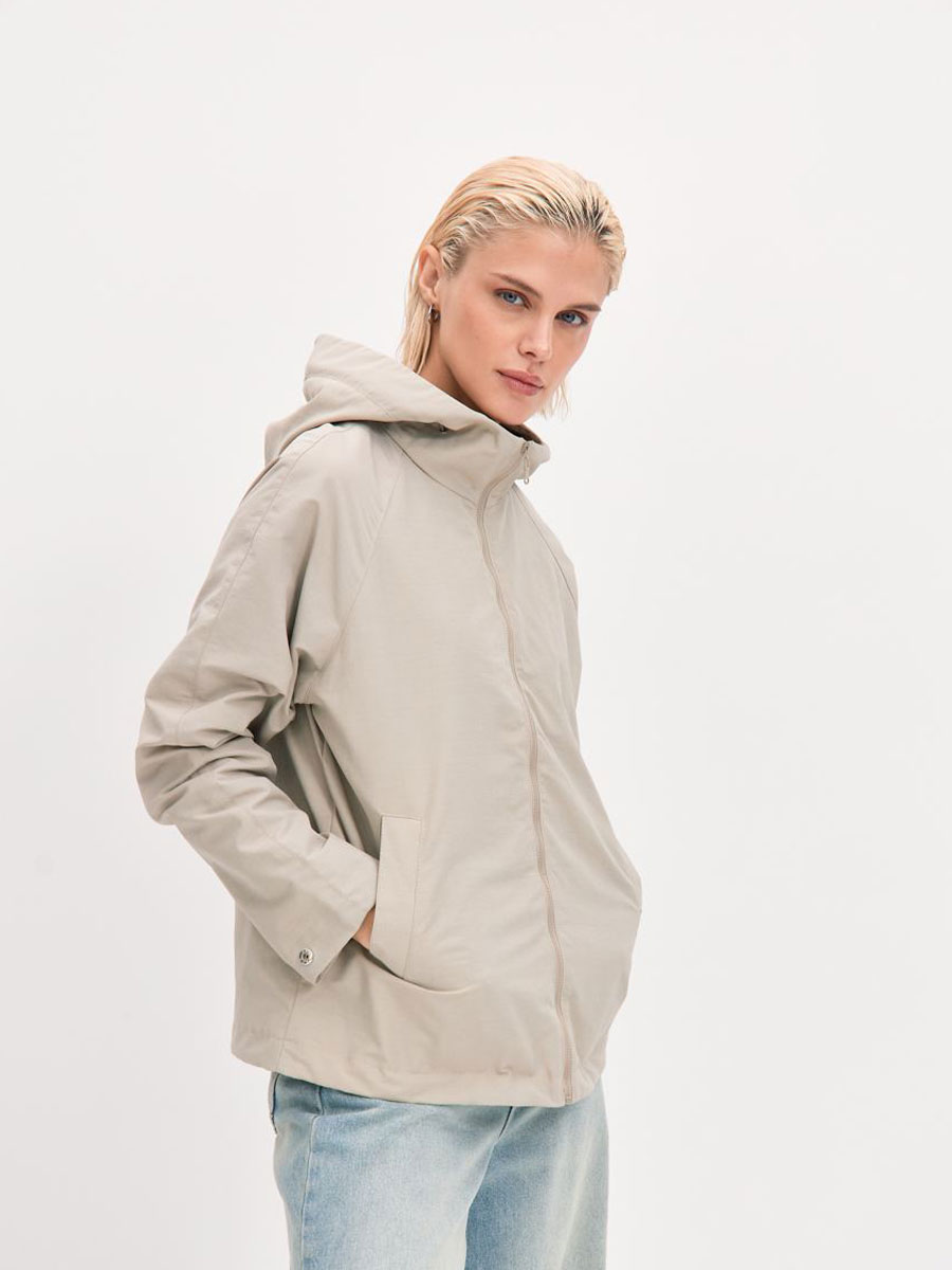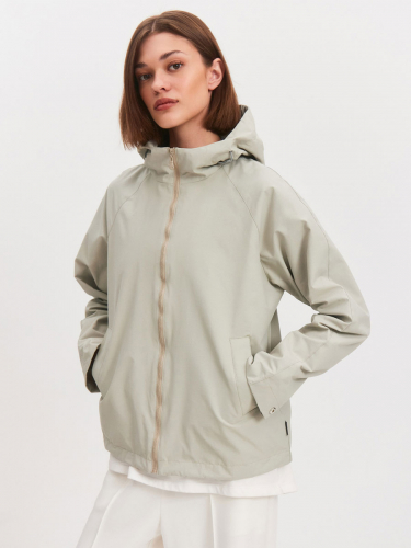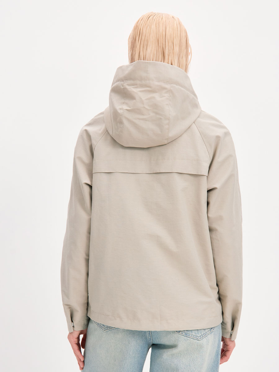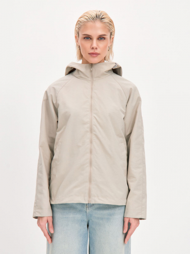 Укороченная ветровка для женщин на сетке, с втачным капюшоном и рукавами «реглан». Центральная застёжка – открытая молния. Карманы прорезные с листочками. По низу куртки кулиса с резиновым шнуром и фиксаторами для регулировки. Рассчитана на температуру от +15 до +20.