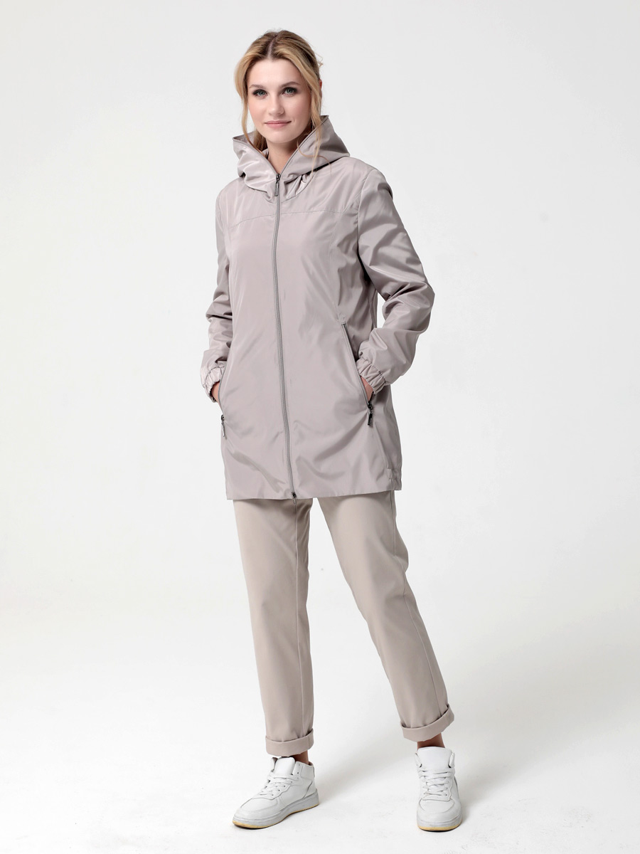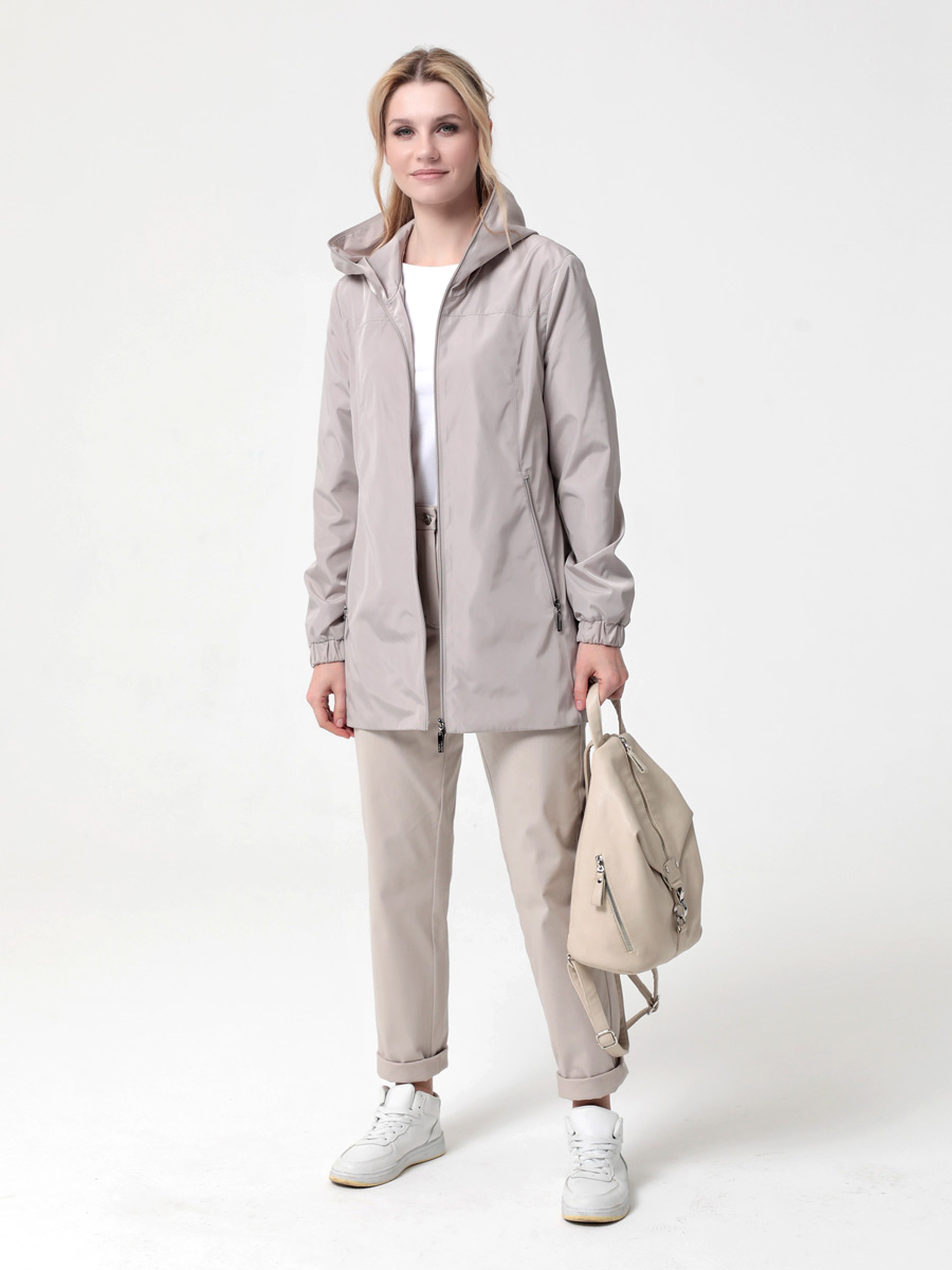 Ветровка прямого силуэта с легким  приталиванием, с втачными рукавами и застежкой на двухзамковую молнию. Капюшон - втачной.   Карманы, расположенные в рельефных швах, застегиваются на молнию. Ширину  изделия по низу можно регулировать затяжкой.  Лаконичная, комфортная модель ветровки полуспортивного стиля подходит для отдыха и повседневного использования.