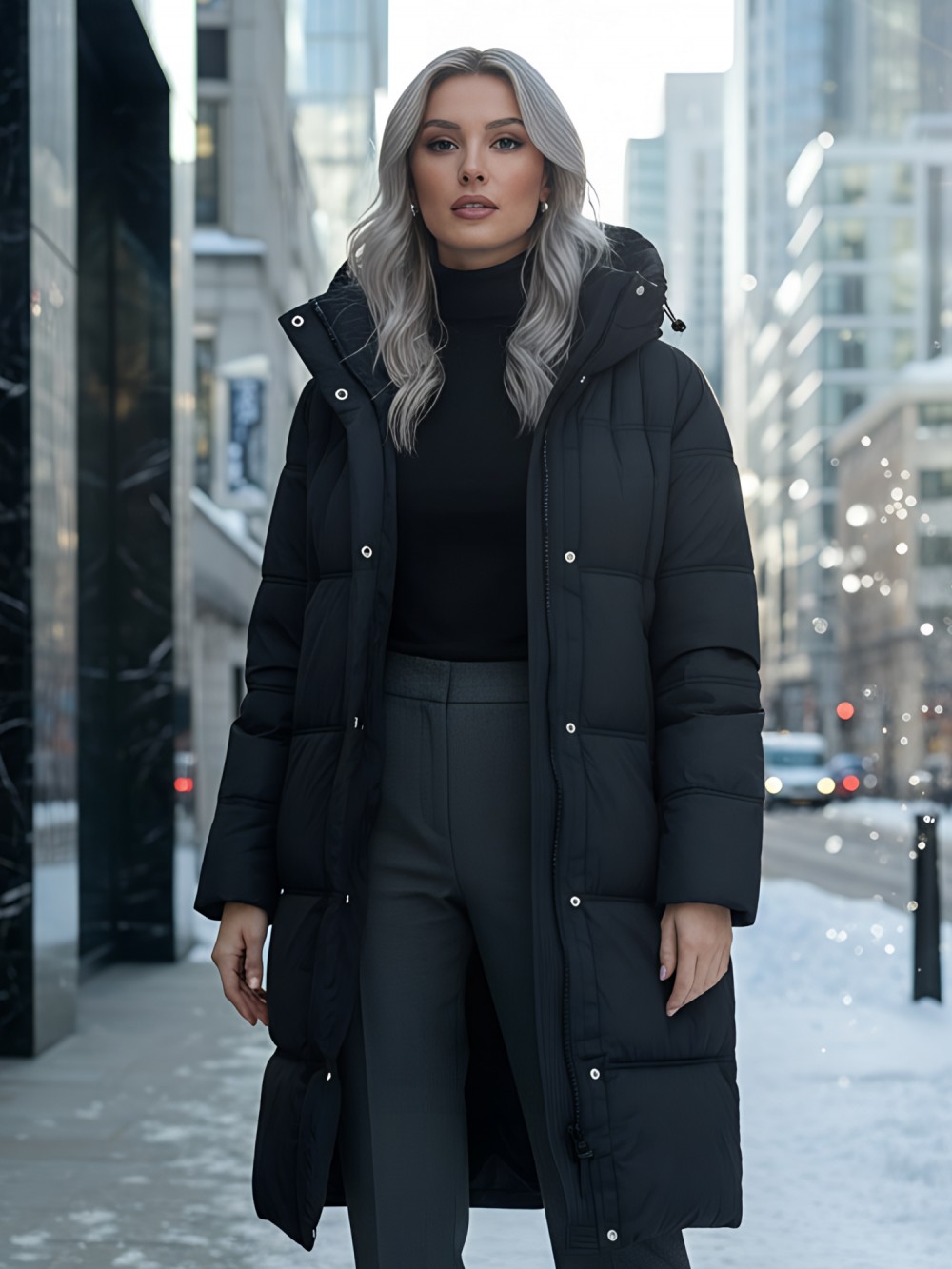 Элегантный покрой с удлиненной длиной до колена и стильным капюшоном с фиксатором придают этому пальто утонченный вид, что делает его идеальным вариантом как для офиса, так и для повседневной жизни. Внутренние карманы добавляют практичности, а двойная молния и кнопки с клапаном подчеркивают современный стиль.