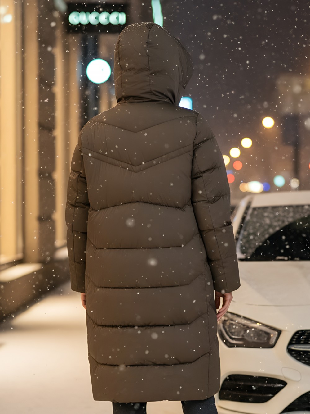 Удлиненный крой ниже колена и свободный фасон делают это женское утепленное пальто универсальным для любого стиля — от офисного до повседневного. Стойка воротника и капюшон с фиксатором добавляют элегантности и защиты от холода. Внутренние карманы и потайные застежки обеспечивают практичность и удобство в использовании.