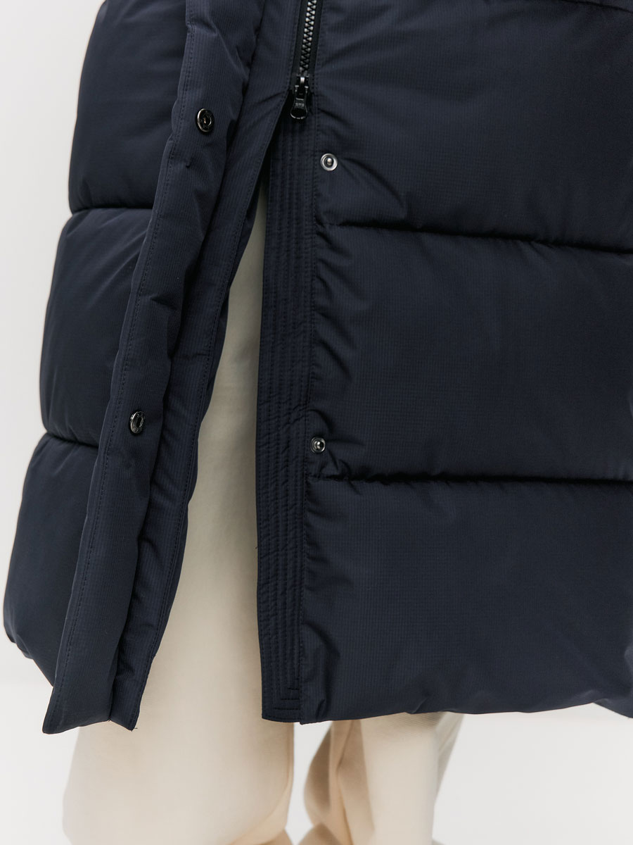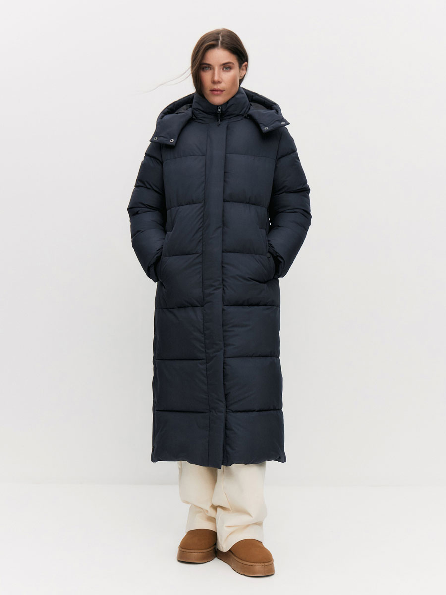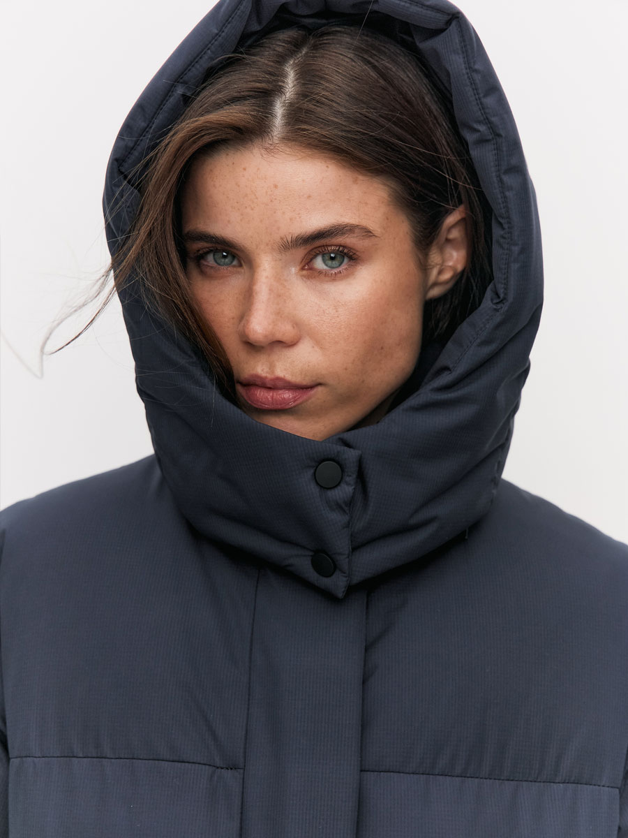 Зимнее стеганое пальто - пуховик для женщин, прямого силуэта. Наполнитель: искусственный "лебяжий пух"+био-пух, плотность набивки 200 гр/м2. Пальто с втачным воротником-стойкой и отстёгивающимся объемным капюшоном. По лицевому краю капюшона кулиса с люверсами, резиновым шнурком и фиксаторами для регулировки. По боковым швам внизу пальто – шлицы на кнопках. Центральная застёжка на молнию, закрытую планкой на потайных кнопках. 2 кармана с листочками на кнопках. Низ рукава прямой, с внутренним манжетом из флиса.Подкладка выстегана на утеплитель - синтепон 100. Подкладочная спинка с кокеткой из флиса. На левой подкладочной полочке накладной карман с липучкой. Рассчитана на температуру от -10 до -25.