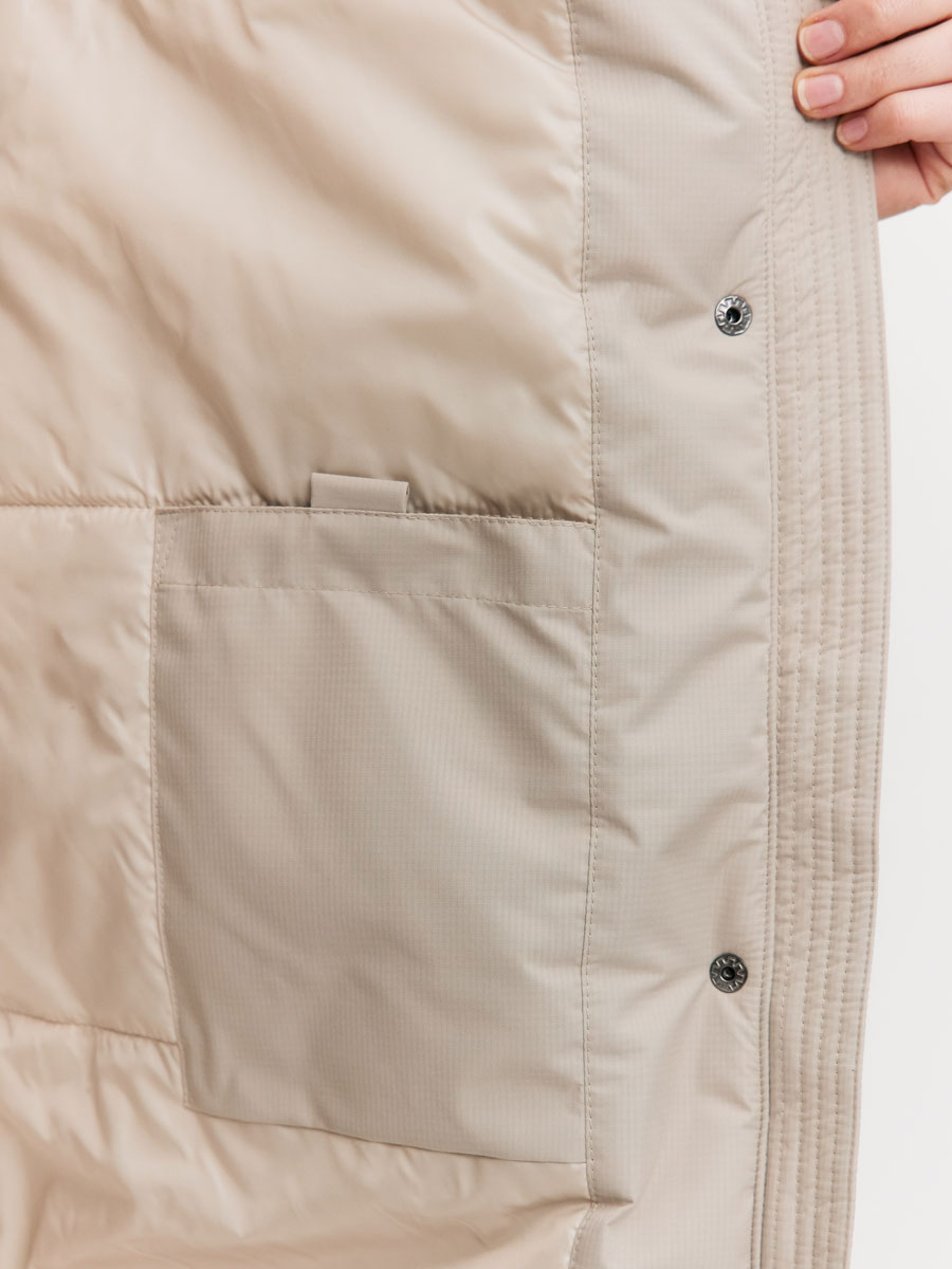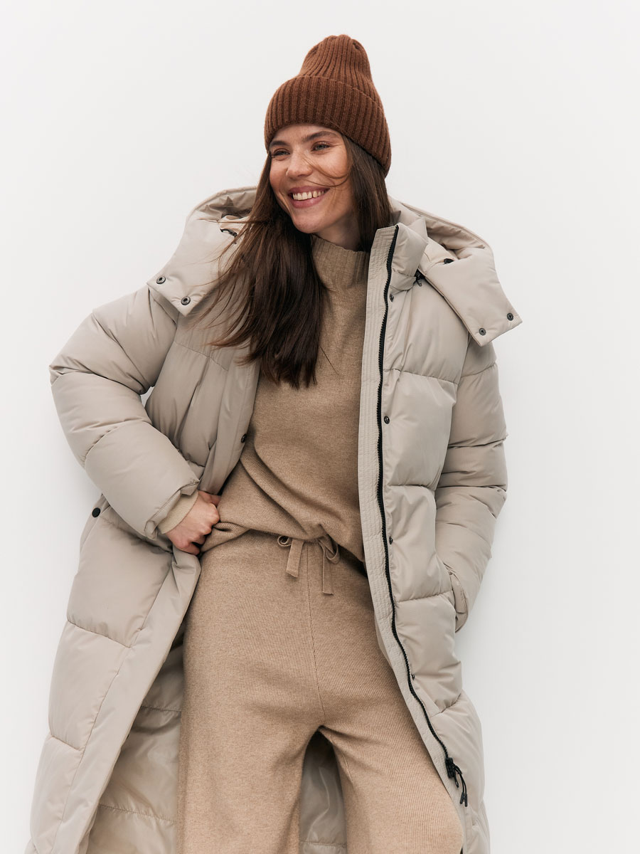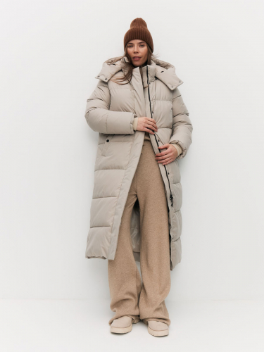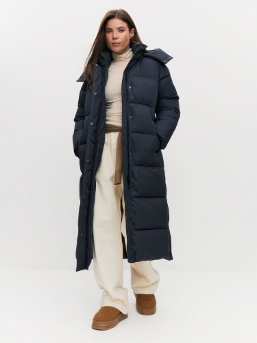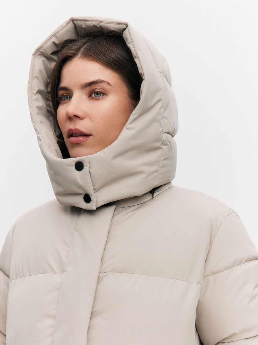 Зимнее стеганое пальто - пуховик для женщин, прямого силуэта. Наполнитель: искусственный "лебяжий пух"+био-пух, плотность набивки 200 гр/м2. Пальто с втачным воротником-стойкой и отстёгивающимся объемным капюшоном. По лицевому краю капюшона кулиса с люверсами, резиновым шнурком и фиксаторами для регулировки. По боковым швам внизу пальто – шлицы на кнопках. Центральная застёжка на молнию, закрытую планкой на потайных кнопках. 2 кармана с листочками на кнопках. Низ рукава прямой, с внутренним манжетом из флиса.Подкладка выстегана на утеплитель - синтепон 100. Подкладочная спинка с кокеткой из флиса. На левой подкладочной полочке накладной карман с липучкой. Рассчитана на температуру от -10 до -25.