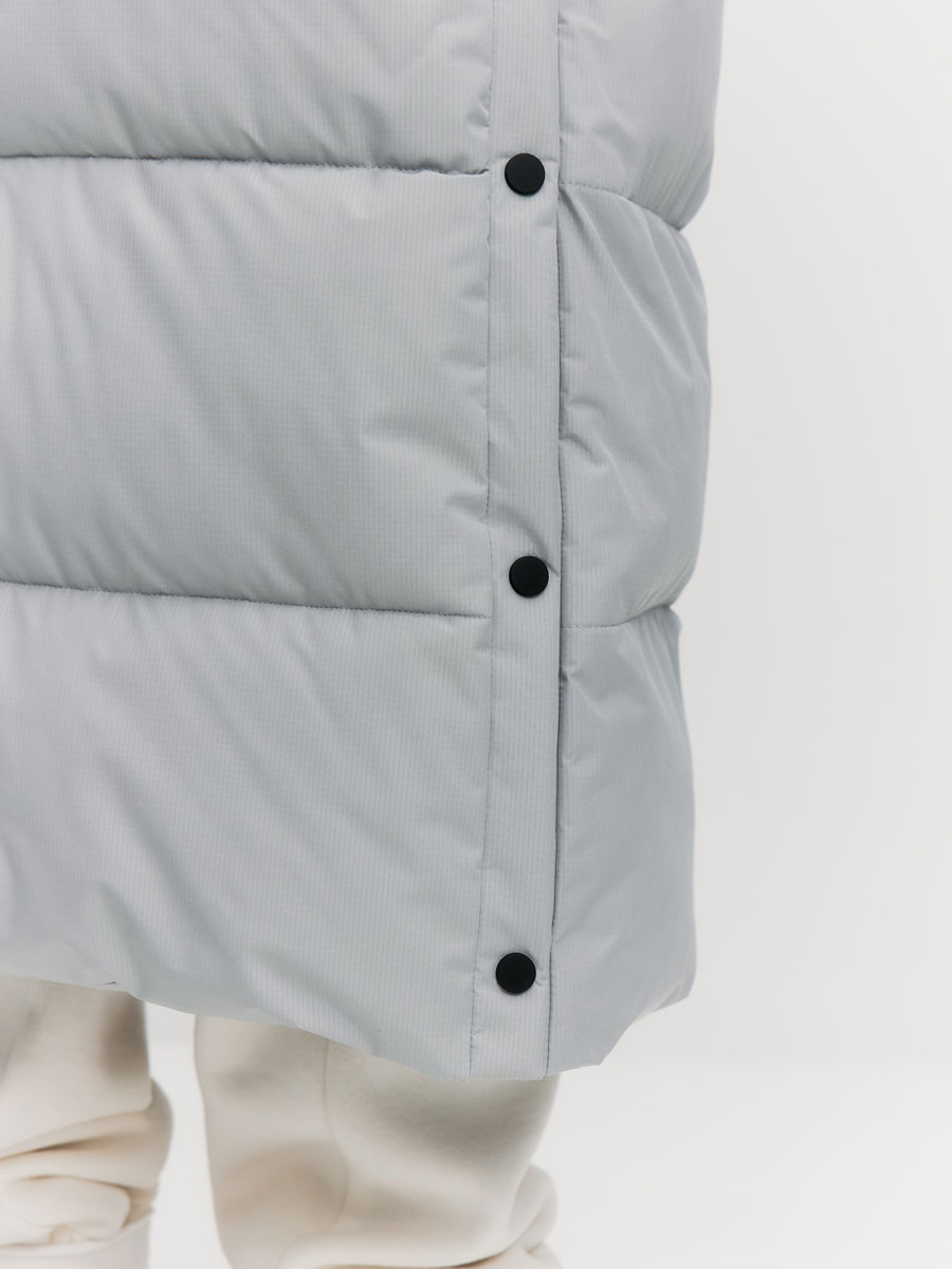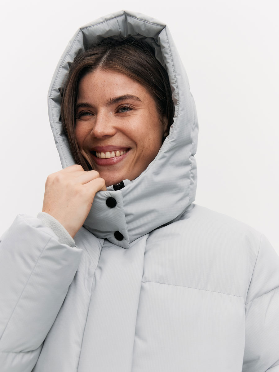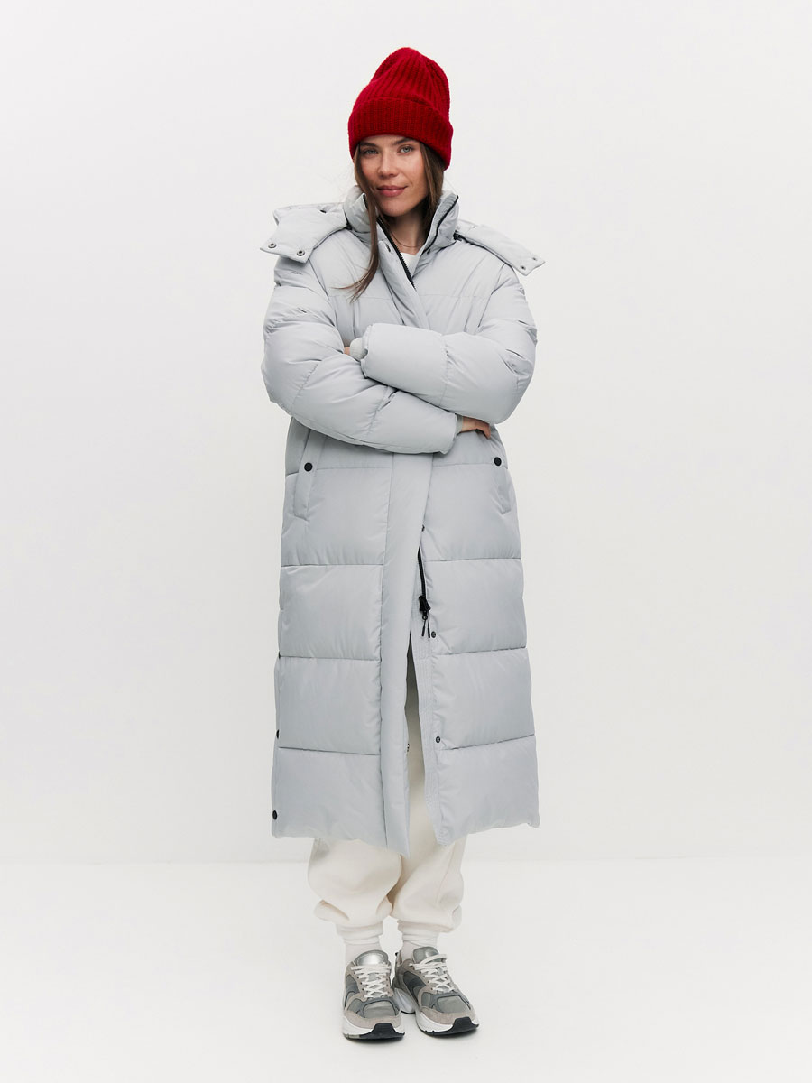 Зимнее стеганое пальто - пуховик для женщин, прямого силуэта. Наполнитель: искусственный "лебяжий пух"+био-пух, плотность набивки 200 гр/м2. Пальто с втачным воротником-стойкой и отстёгивающимся объемным капюшоном. По лицевому краю капюшона кулиса с люверсами, резиновым шнурком и фиксаторами для регулировки. По боковым швам внизу пальто – шлицы на кнопках. Центральная застёжка на молнию, закрытую планкой на потайных кнопках. 2 кармана с листочками на кнопках. Низ рукава прямой, с внутренним манжетом из флиса.Подкладка выстегана на утеплитель - синтепон 100. Подкладочная спинка с кокеткой из флиса. На левой подкладочной полочке накладной карман с липучкой. Рассчитана на температуру от -10 до -25.