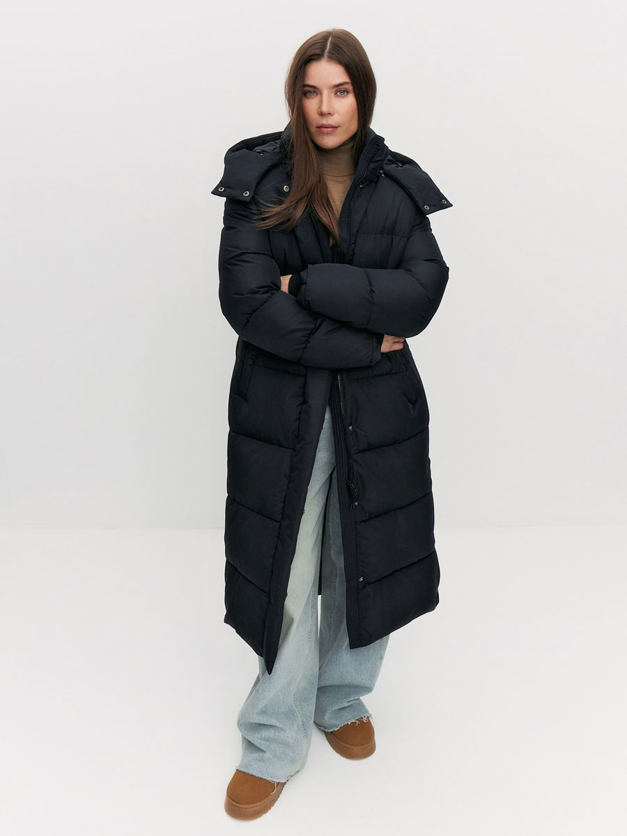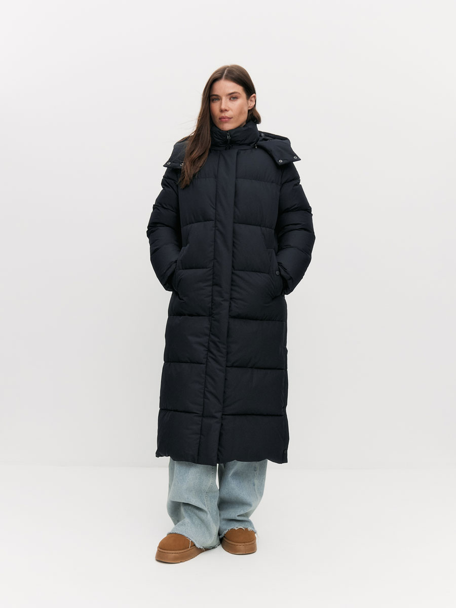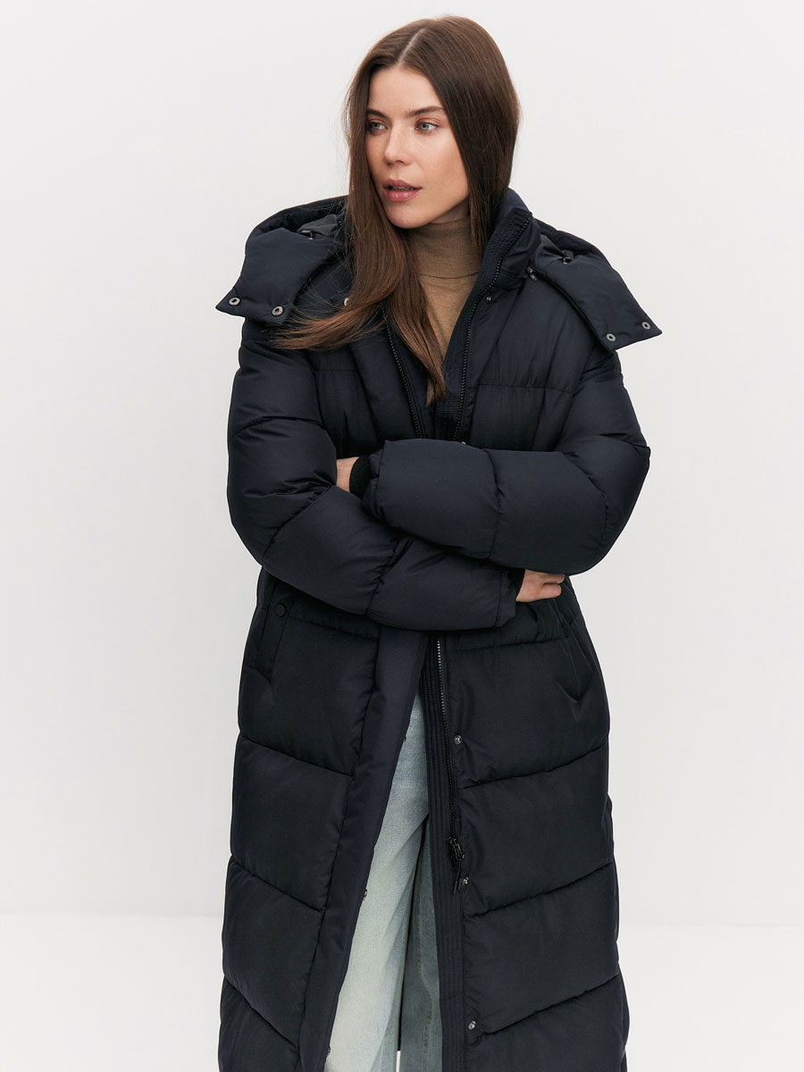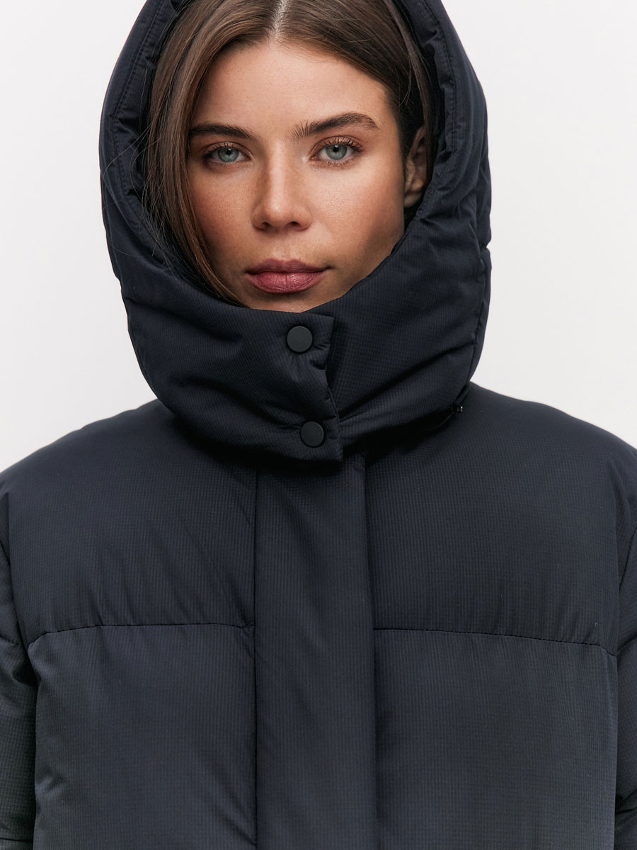 Зимнее стеганое пальто - пуховик для женщин, прямого силуэта. Наполнитель: искусственный "лебяжий пух"+био-пух, плотность набивки 200 гр/м2. Пальто с втачным воротником-стойкой и отстёгивающимся объемным капюшоном. По лицевому краю капюшона кулиса с люверсами, резиновым шнурком и фиксаторами для регулировки. По боковым швам внизу пальто – шлицы на кнопках. Центральная застёжка на молнию, закрытую планкой на потайных кнопках. 2 кармана с листочками на кнопках. Низ рукава прямой, с внутренним манжетом из флиса.Подкладка выстегана на утеплитель - синтепон 100. Подкладочная спинка с кокеткой из флиса. На левой подкладочной полочке накладной карман с липучкой. Рассчитана на температуру от -10 до -25.