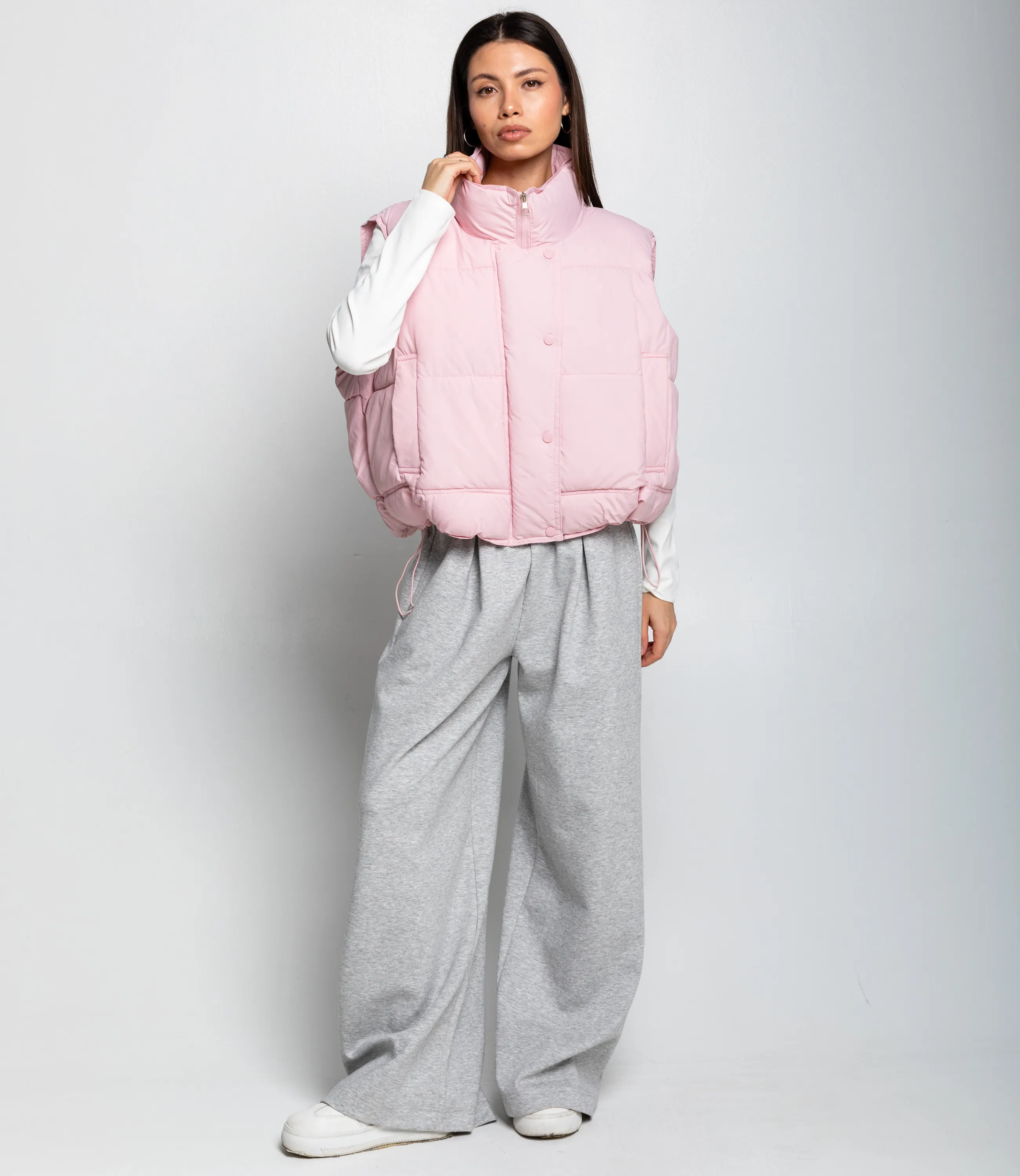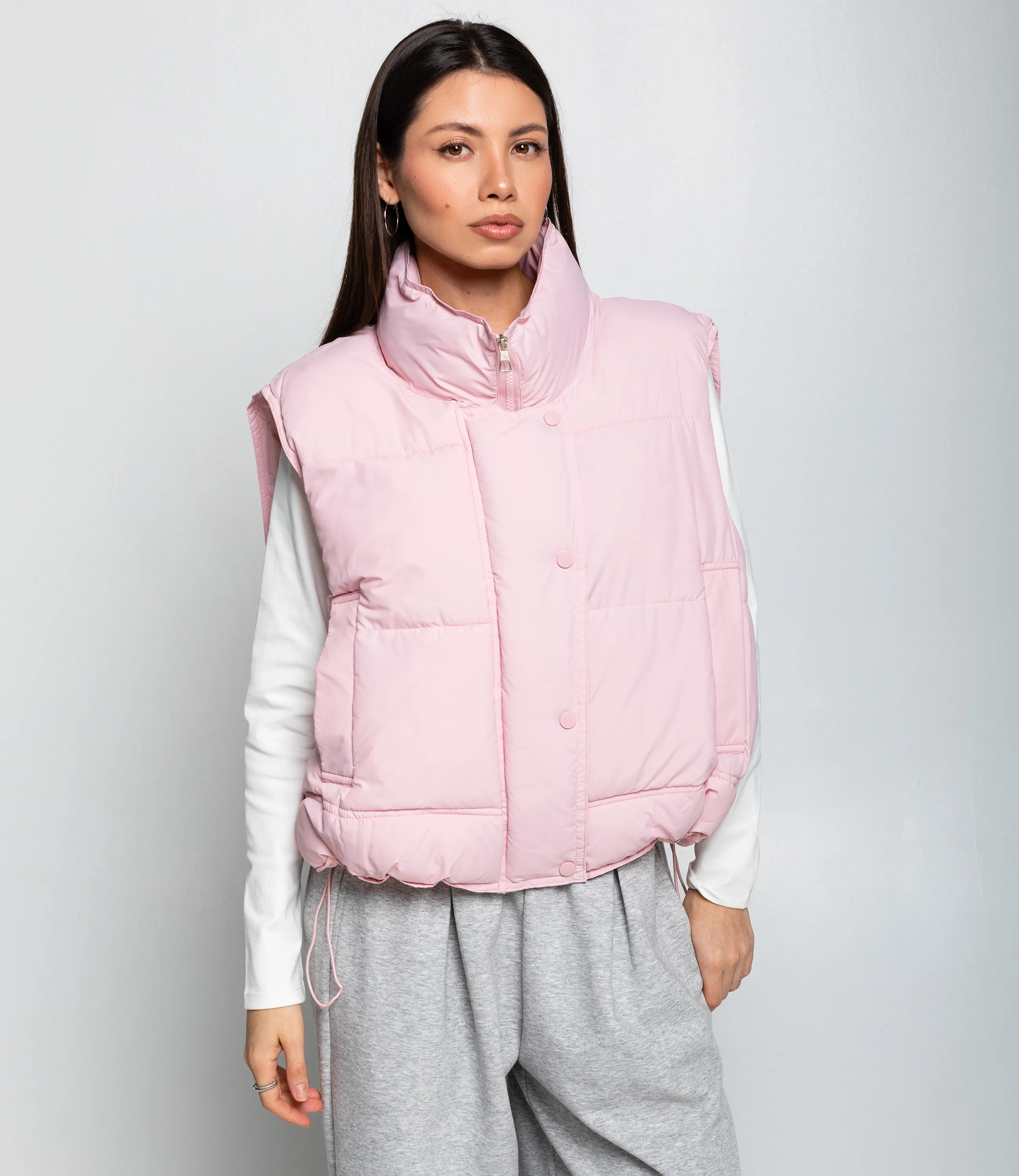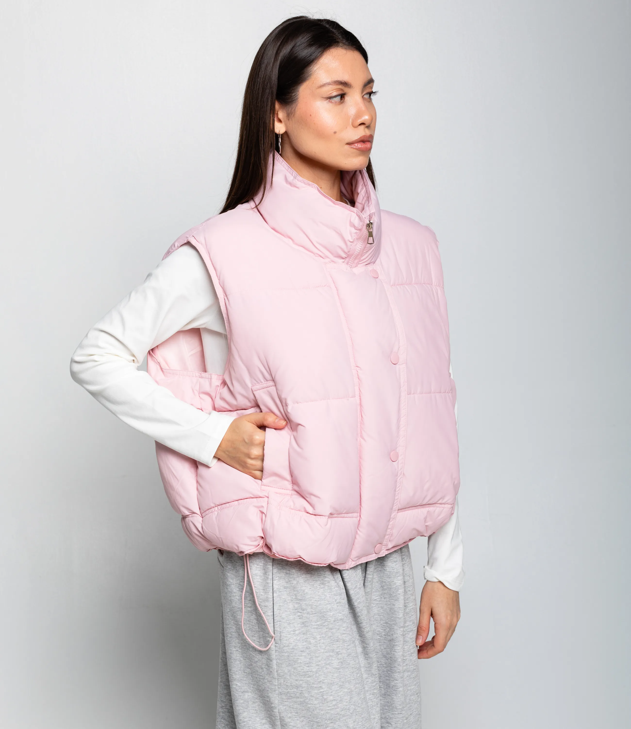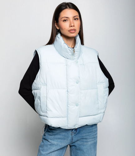 Жилет – это одежда, которая подчеркивает привлекательность каждой женщины. Этот жилет выполнен из ткани, состоящей на 100% полиэстер. Короткий стёганый жилет без рукавов, выполнен из гладкой ветронепроницаемой ткани с мягкой, объёмной набивкой внутри, создающей пухлую, приподнятую структуру. Модель с высоким горлом-стойкой, которое плотно обрамляет шею и дополнительно утепляет верхнюю часть корпуса; застёжка спереди скрытая планкой с крупными обтянутыми пуговицами, обеспечивающими цельный визуальный ряд. Фасон прямой и укороченный, с завышенной линией низа, где расположен регулируемый шнурок со стопперами, позволяющий зафиксировать посадку по талии и придать силуэту более собранный вид. Боковые входные карманы интегрированы в швы и усилены прострочкой, обеспечивают практичность без нарушения объёма! Рост 164, 83-61-89.
