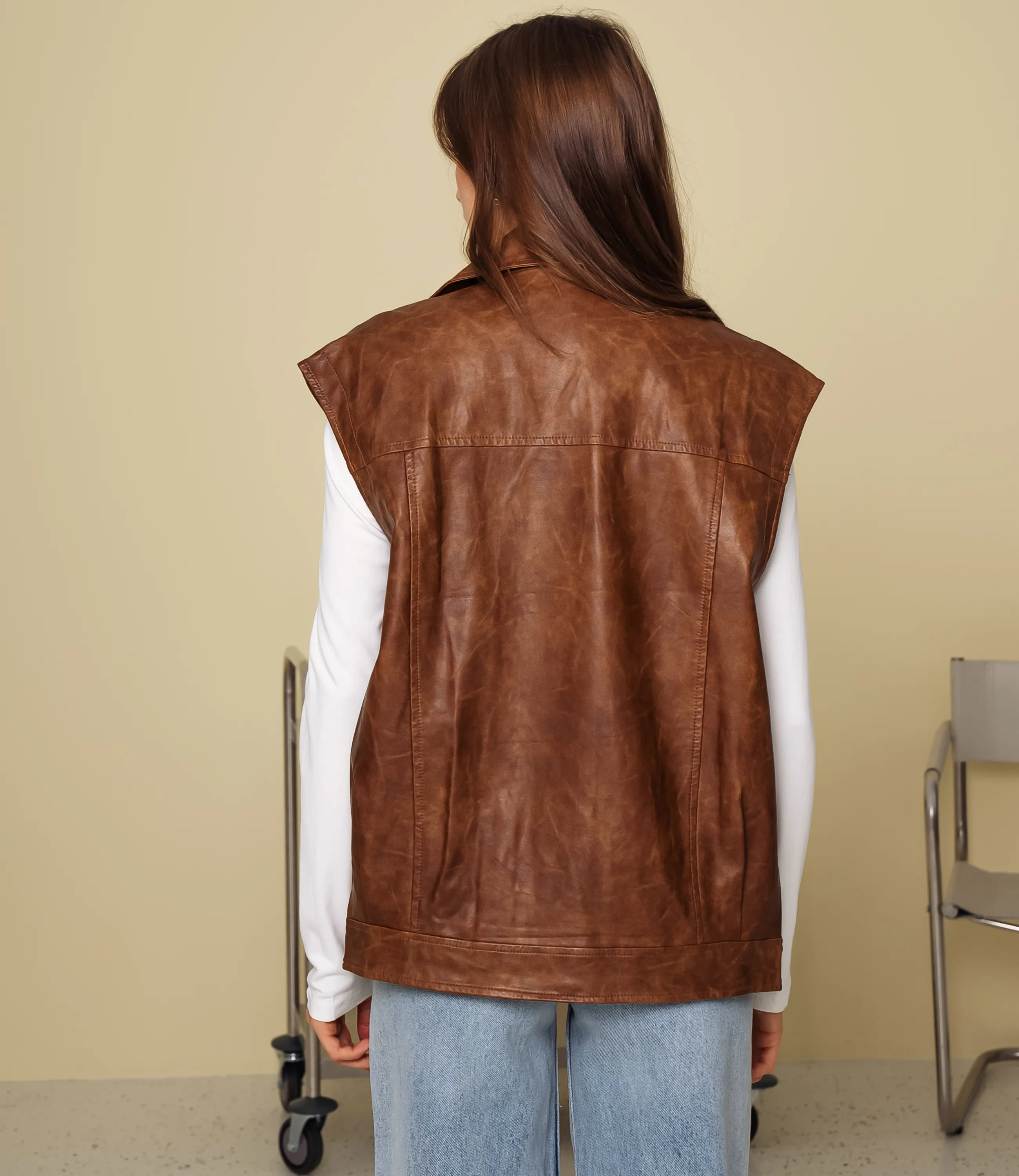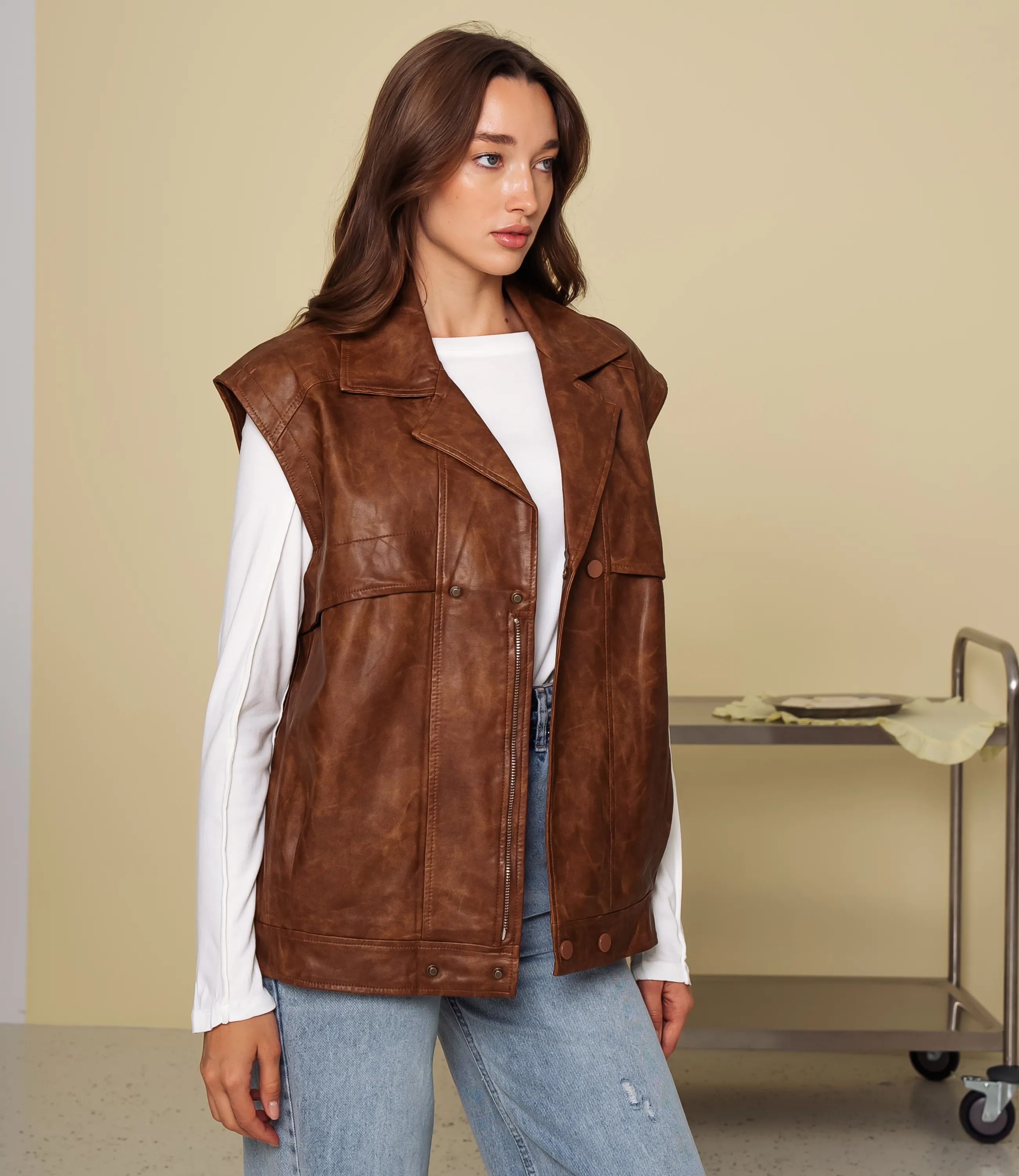 Жилет – это одежда, которая подчеркивает привлекательность каждой женщины. Этот жилет выполнен из ткани, состоящей на 55% полиуретан и 45% вискозы. Модель прямого, несколько свободного кроя с удлинённой линией — длина до середины бедра, что обеспечивает универсальность носки поверх платьев, свитеров или рубашек. Плечи оформлены с небольшим расширением, образуя неглубокие рукава‑крылышки, которые придают образу структурность и лёгкую асимметрию. Воротник отложной с перевёрнутыми лацканами, переходящими в центральную застёжку на металлические кнопки и скрытую молнию, что даёт возможность регулировать посадку и выраженность декольте. Лицевая панель украшена рельефной прострочкой и декоративными швами, которые зрительно удлиняют силуэт. Чтобы вы были уверены в размере, мы представили на странице таблицу. Воспользовавшись ею, вы сможете сами обмерить себя и удостовериться. Установленная нами цена является доступной. Не откажите себе в удовольствии быть элегантной! Рост 168 см, 85-63-92. Вы можете заказать онлайн презентацию на интересующие Вас модели. Наши менеджеры свяжутся с Вами и проведут индивидуальную видеотрансляцию, помогут составить заказ и ответят на Ваши вопросы.